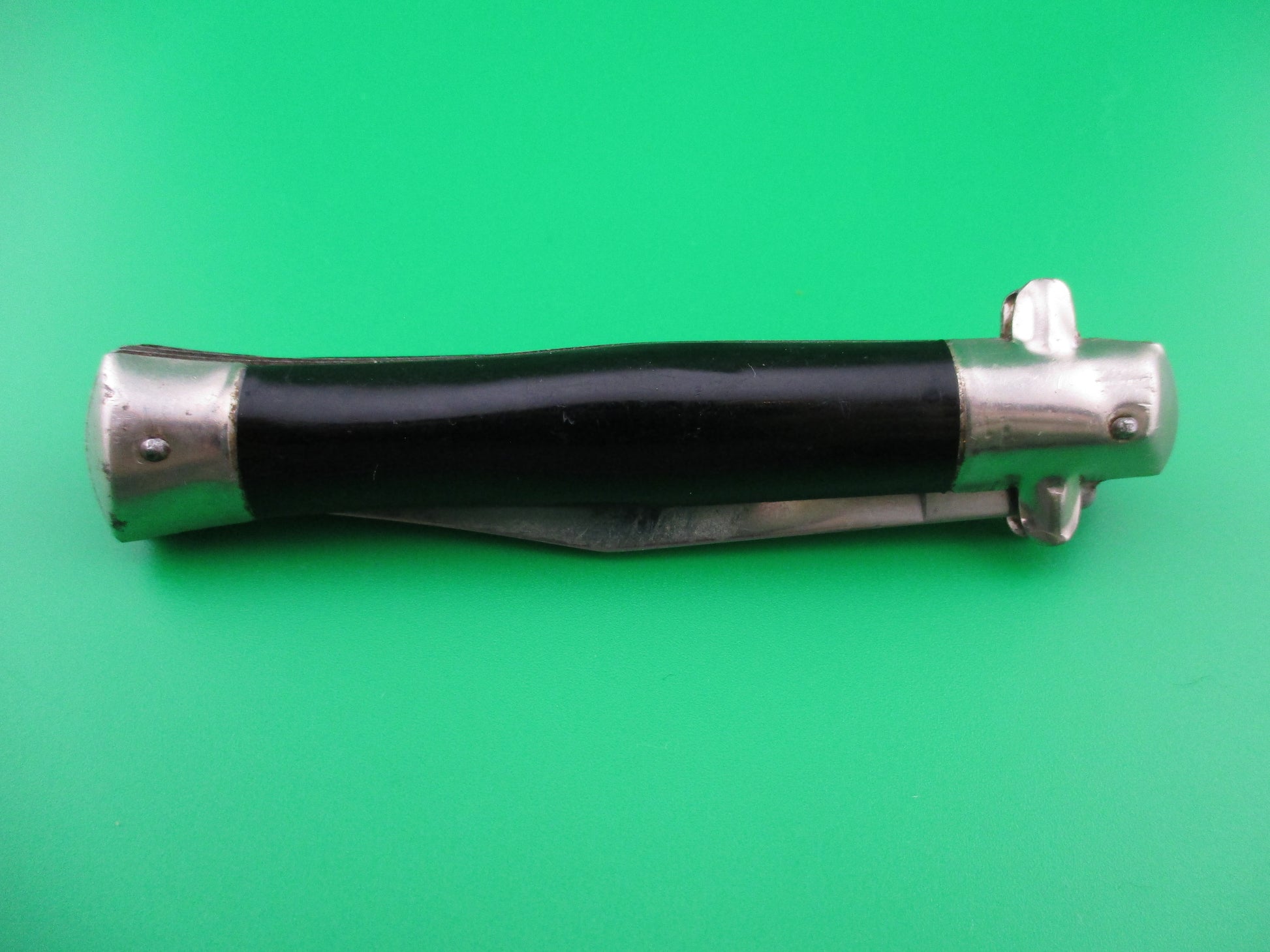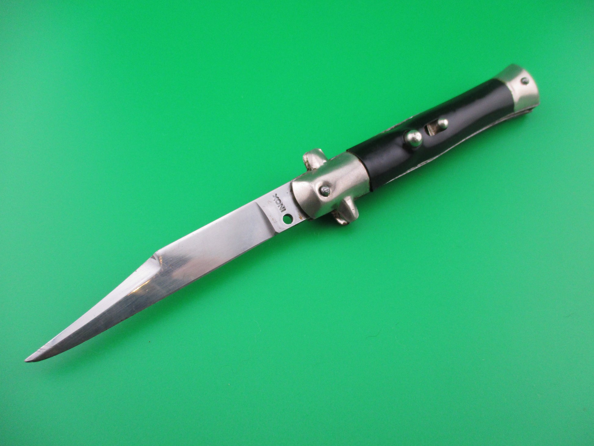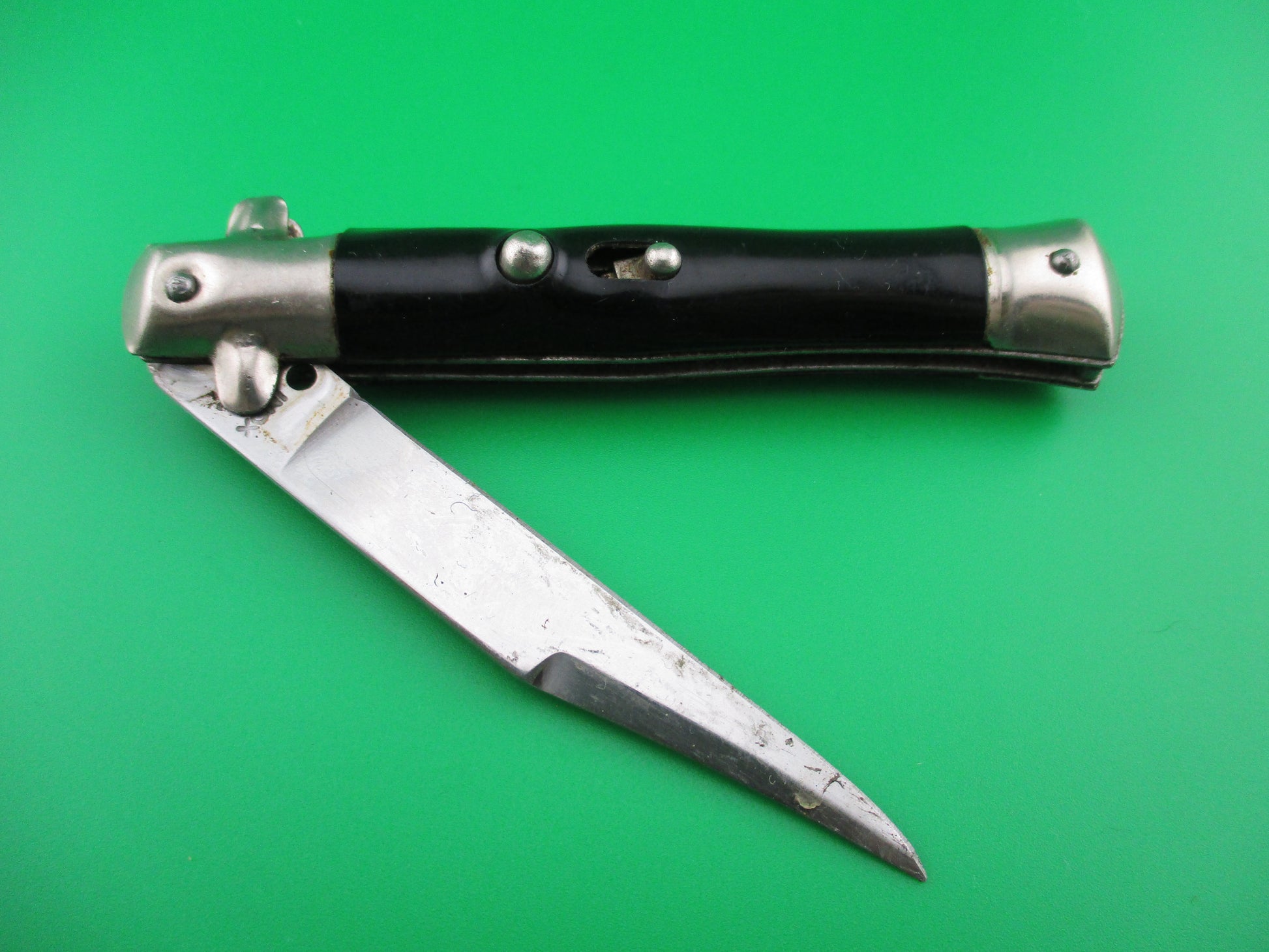 This is an Italian BOBC (button open, button close) knife marked INOX, commonly referred to as a "card knife" due to the fact that they were often sold from display cards that held 4 or more knives. They were mainly aimed at the tourist market and I believe that they were made mostly in the 1960s and 70s. The knife measures 18cm open (7 inches) and has steel liners. The flat swedge grind blade is stamped INOX and is nearly full with the original factory finish intact. The handles are hollow steel with a wrap and are in good condition with some light scratches and handling marks. The knife works well with the blade tip seating deep in the blade well closed, strong snap and good lockup with a little up and down of about 3/16" at the tip. Nice little Italian tourist switchblade.