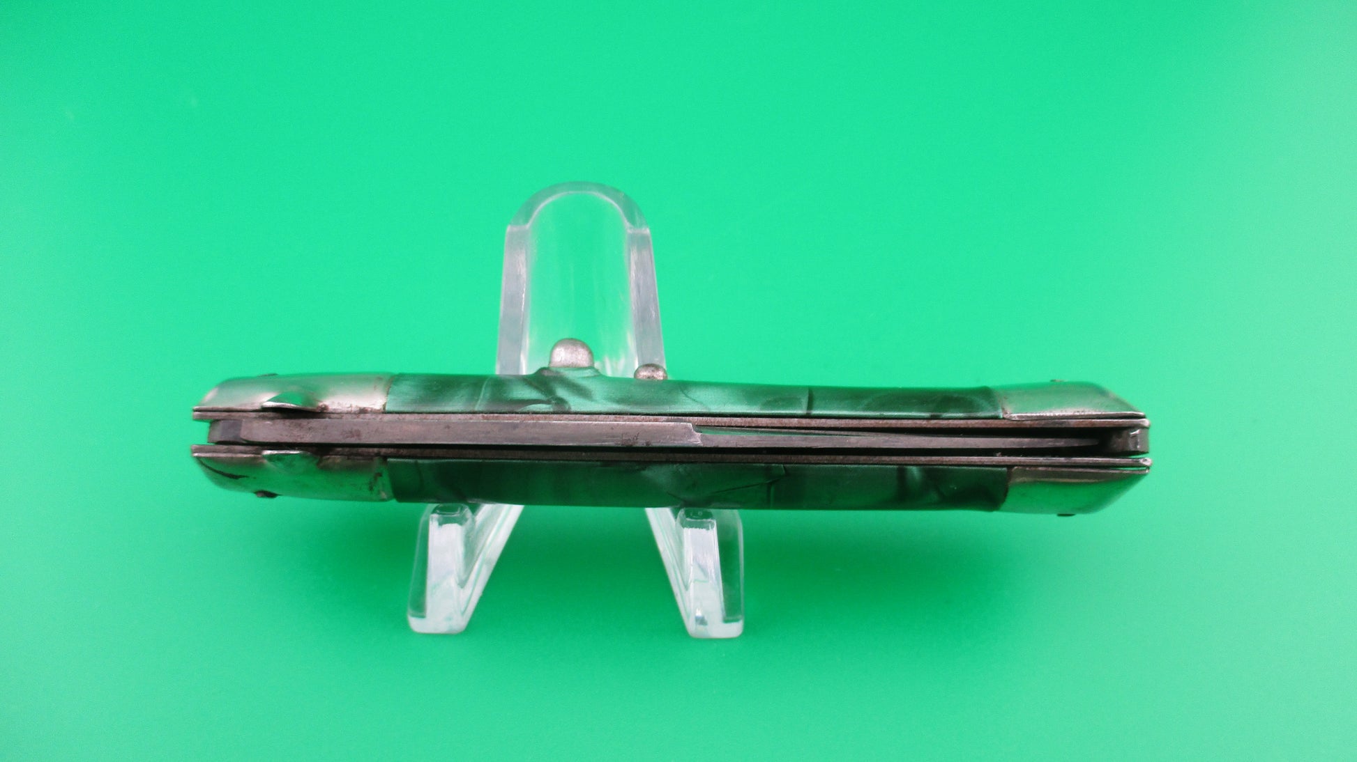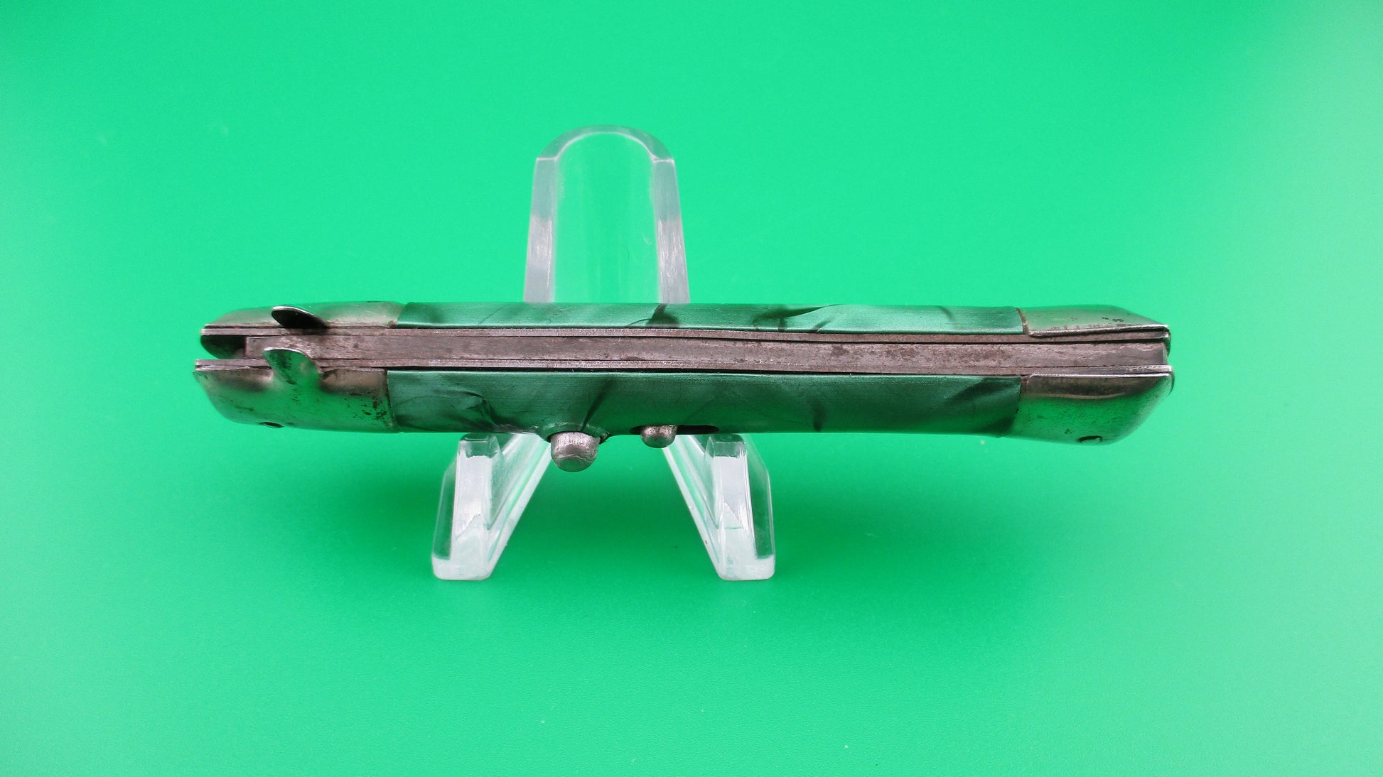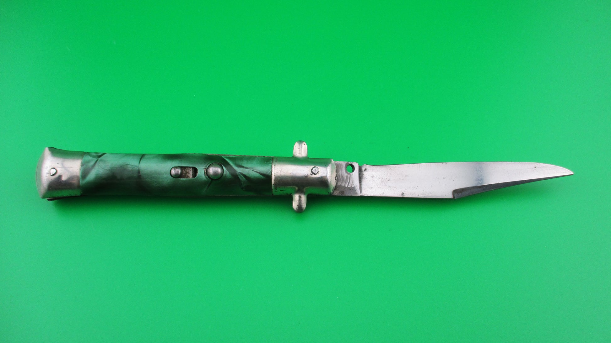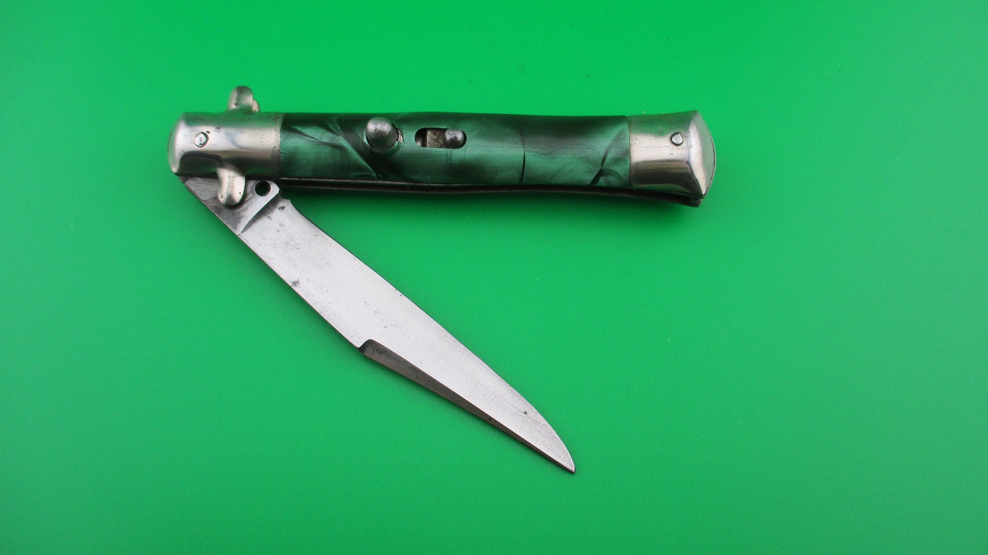 Vintage Italian BOBC (button open, button close) knife commonly referred to as a "card knife" due to the fact that they were often sold from display cards that held 4 or more knives. They were mainly tourist souvenir knives and I believe that they were made mostly in the 1960s and 70s. The knife measures 18cm open (7 inches) and has steel liners, bolsters, button & safety. The flat clip swedge grind blade is not marked and is nearly full with the original factory finish intact. The handles are hollow steel with a Green pearl wrap and are excellent condition. The blade tip seats deep in the blade well closed, strong snap, but does not lock open. Pretty little Italian tourist switchblade. Safety works. VG+ condition.
