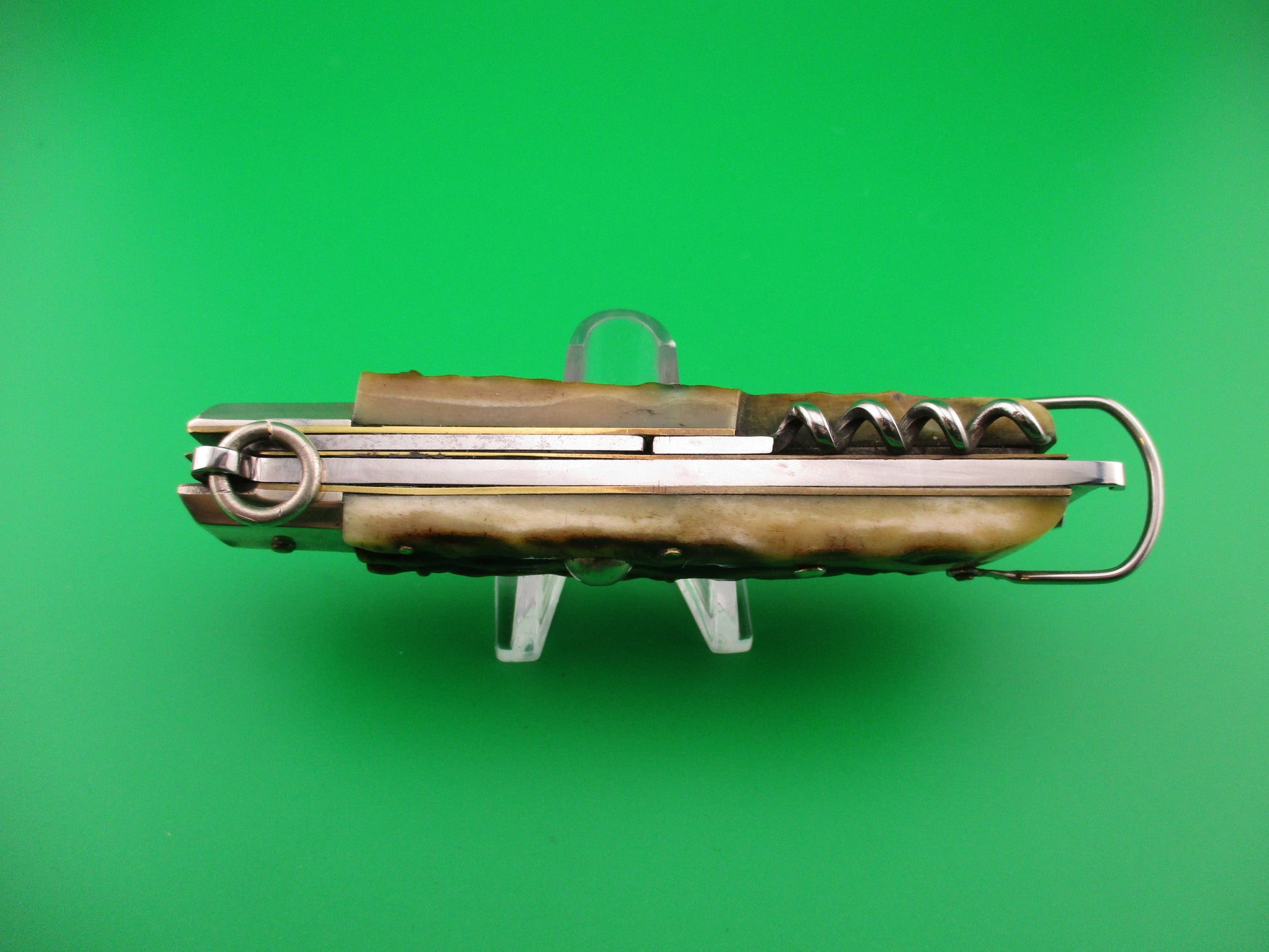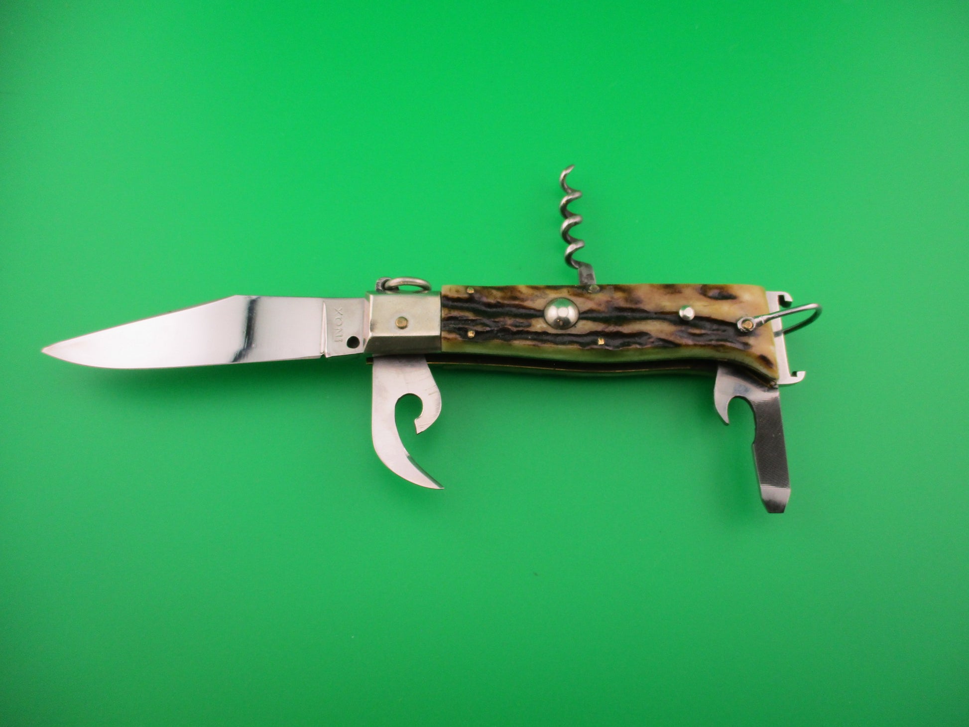Vintage INOX Italian Stag Ring pull 4 blade Camper automatic knife with shell pullers likely made in Italy 1960s or 70s by Jaguar. It measures 19.8cm (7.75 inches) with main blade open and just over 4.5 inches closed with D stamped brass liners and nickel silver bolsters, button safety & ring with steel lanyard ring and pullers. The main long clip blade is 98% full or better and shiny and the ricasso is stamped INOX. The can opener, bottle opener/file/screwdriver blades and corkscrew have no markings. The Stag scales are nice with no defects and lots of character. Shell pullers at the back of the knife to pull 12 ga. shotgun shells out of the guns and a lanyard ring to attach the knife to a belt or vest. The knife functions great with the manual blades seating well and good spring tension (walk & talk). The clip blade tip is slightly above the liners closed, opens strong with TIGHT lockup. Blade is released for closing by pulling on the Ring attached to the backspring. It is pretty hard to pull, but will likely get easier as the knife is used. It takes a little practice. Not responsible for accidents. ;^) Nice old Stag 4 blade camper ring pull switchblade knife.