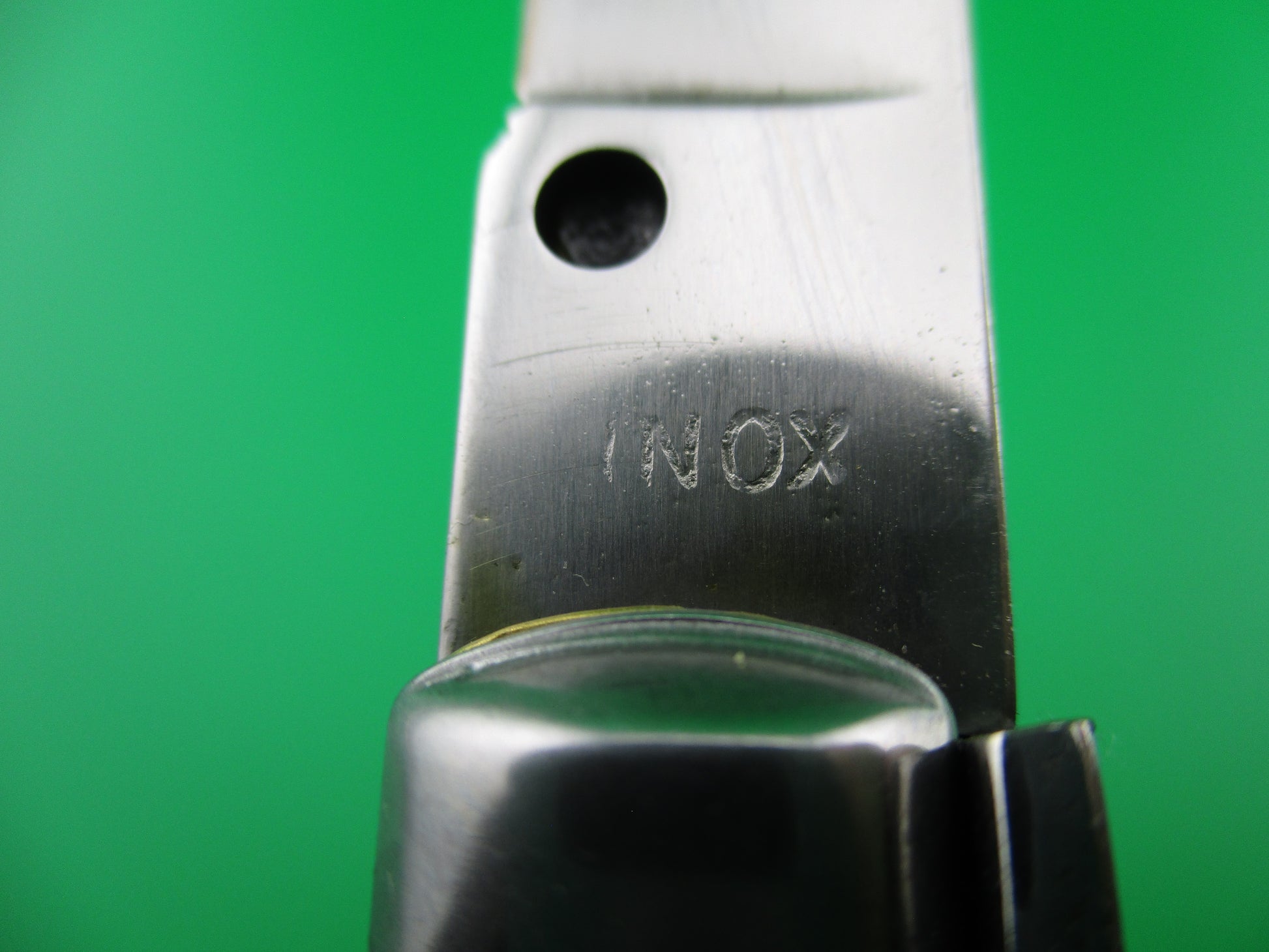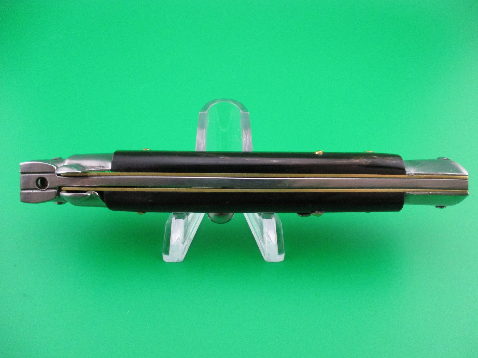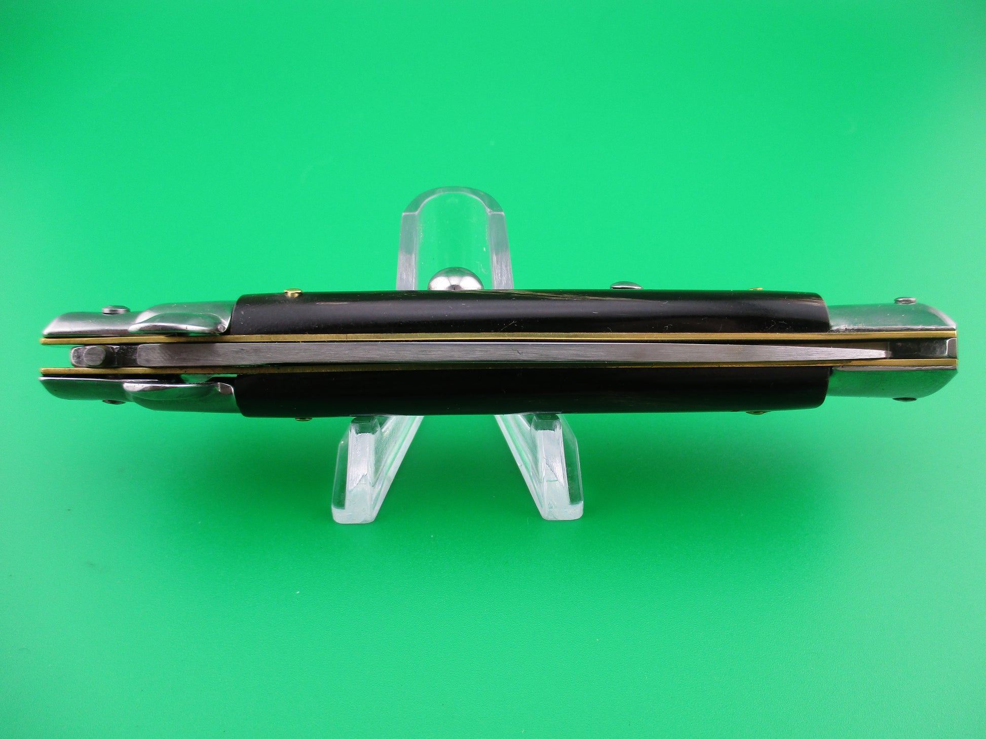 Italian 1980s or 90s vintage stiletto swivel bolster switchblade knife. This knife measures a little over 22cm (8.5/8 inches) open and it has brass liners and stainless steel unlined bolsters and button. The blade is marked INOX on the tang which means Stainless steel. The flat grind blade is nearly full with original factory finish! The scales are dark horn with some tan streaking on both scales and are in excellent condition. The knife works Great with tip seating deep closed, Strong snap and tight lockup open! Safety works.