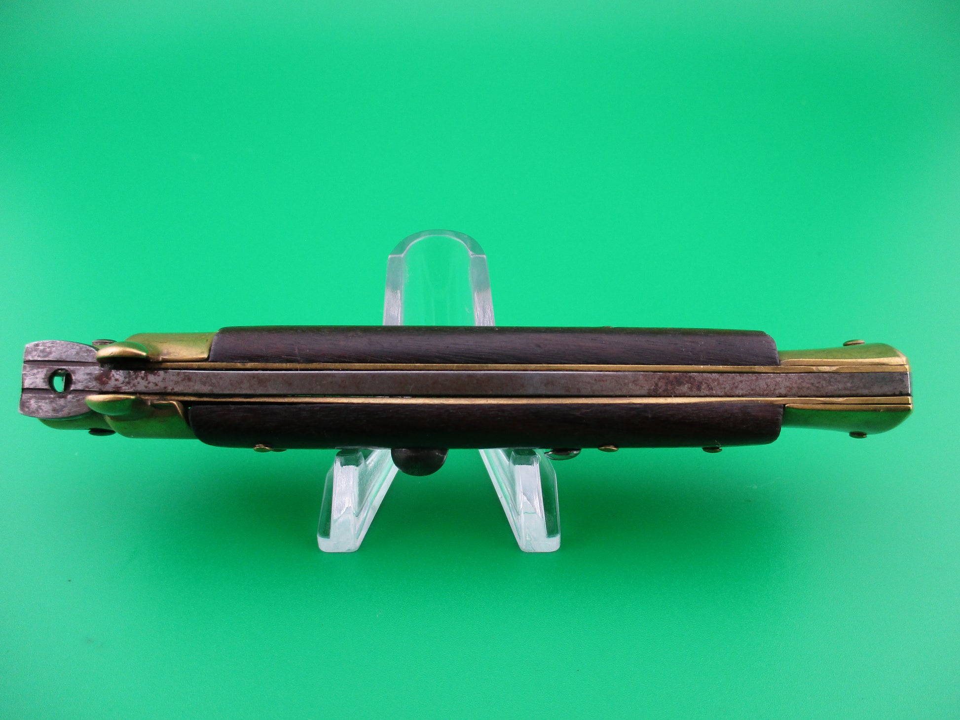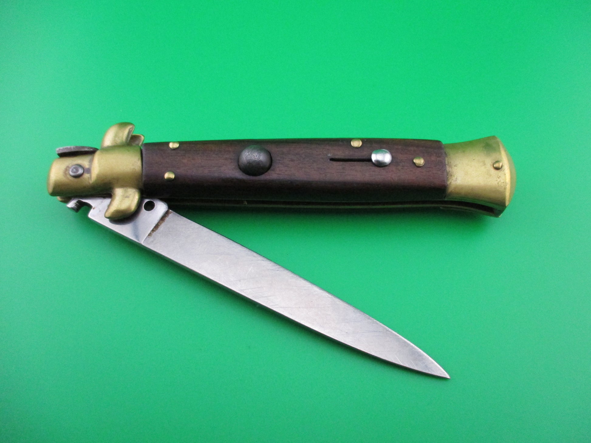 Vintage INOX 22cm Italian Stiletto Wood & Brass automatic knife. Measures 22cm (8.75 inches) open with brass liners, bolsters and pins and steel button and safety cap. Blade is nearly full with most of the original factory finish and lots of light scratches from sharpening and is stamped INOX on the ricasso. The scales (handles) are cocobolo wood and are in very nice condition. The knife works well with blade tip deep and centered, good snap and tight lockup. Safety works. EX- condition.
