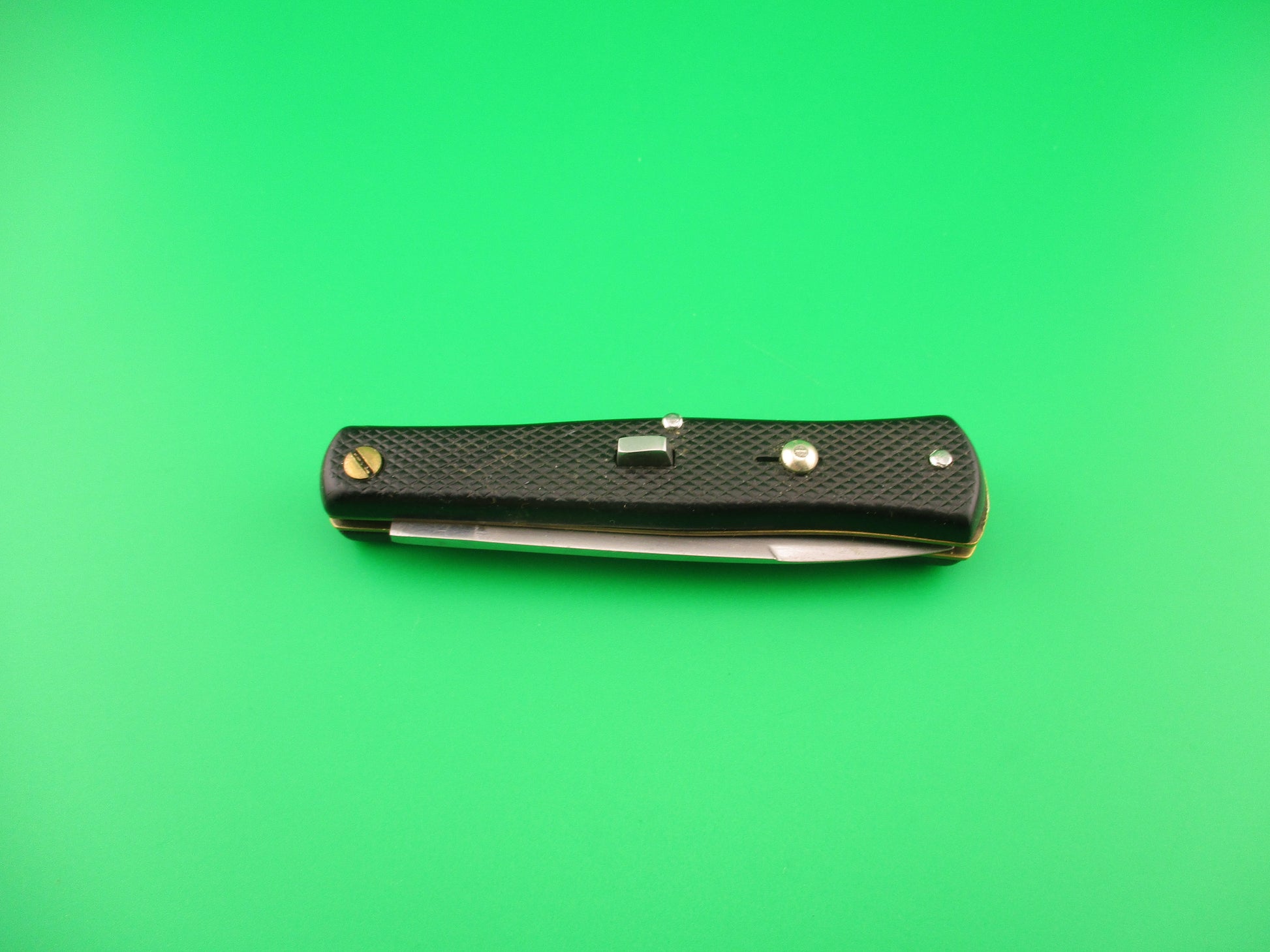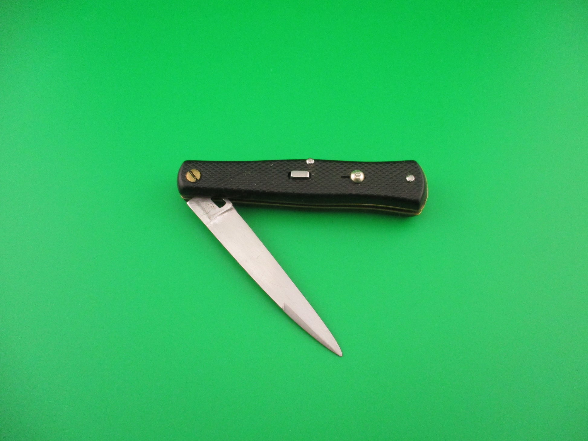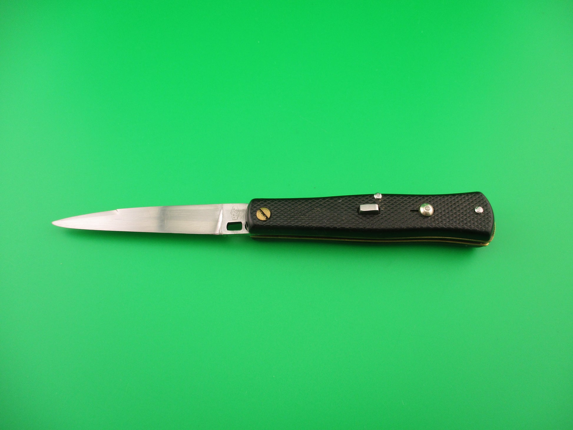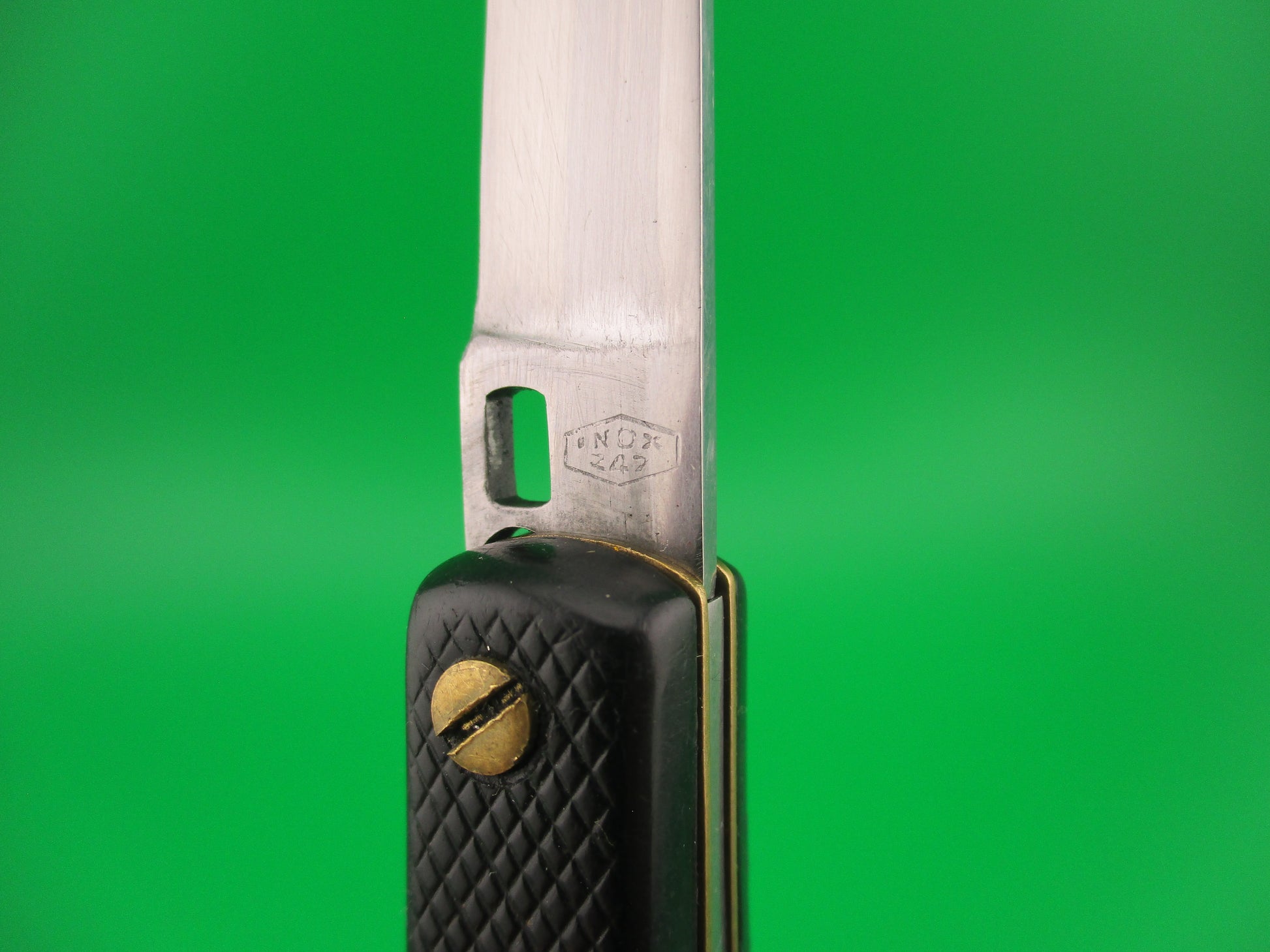 INOX 247 17cm French Fishtail black checkered vintage automatic Button open, Button close knife most likely made in the 1970s or 80s in France. The knife measures 16.6cm (6 3/8 inches) open and 3 9/16 inches closed with brass liners, steel rectangular button and nickel silver safety cap. The swedge blade is about 97% full, or better with patina and light scratches. The black synthetic checkered scales are in very good condition with slight shrinkage and slight pocket wear. The knife works well with blade tip below liners closed, good snap and good lockup with about 1/8" down at the tip that springs back when you let go. No rattle when shaken with blade open. Safety works. VG condition.