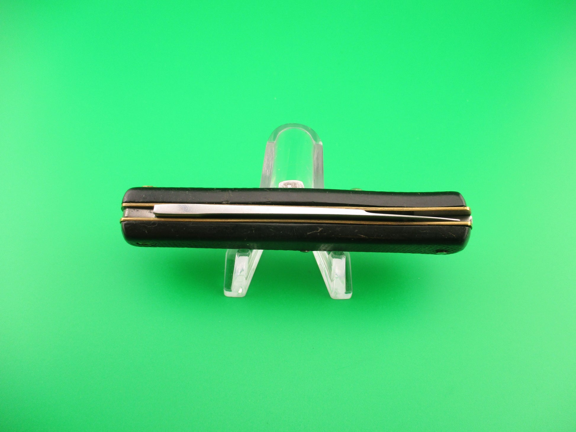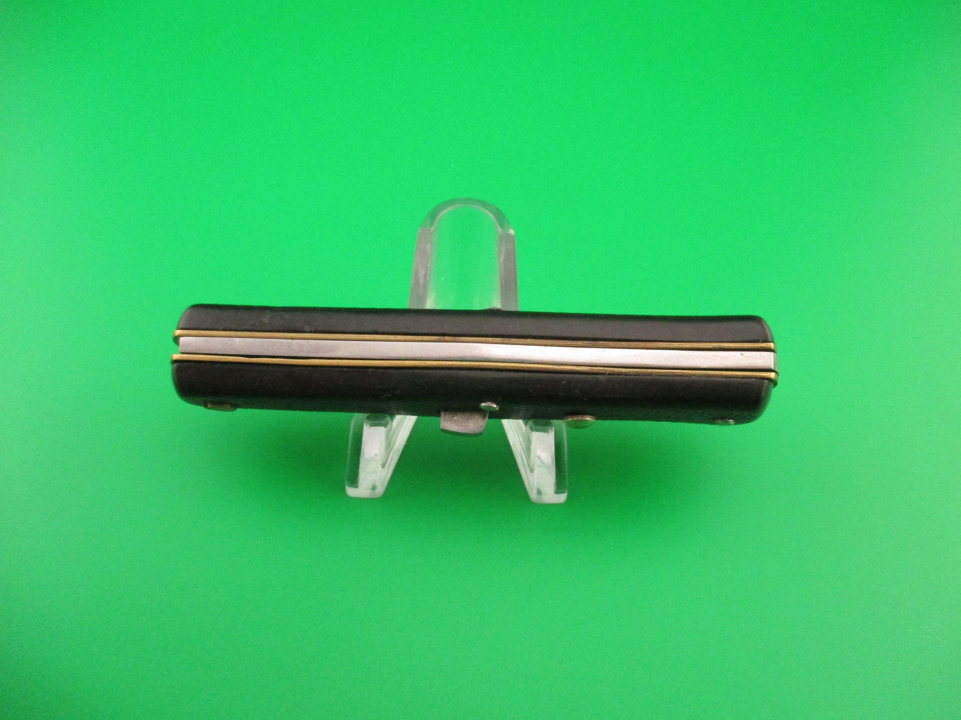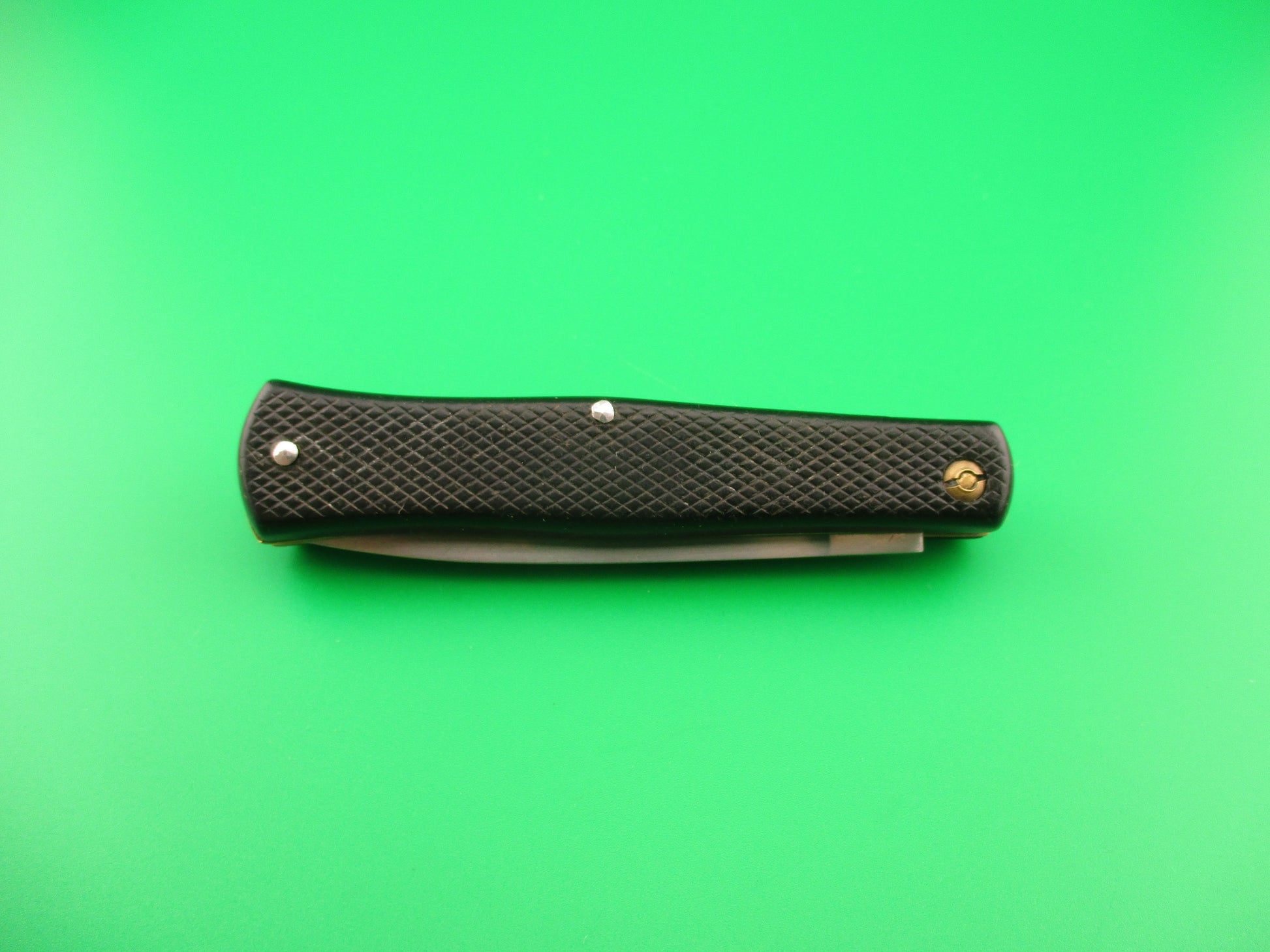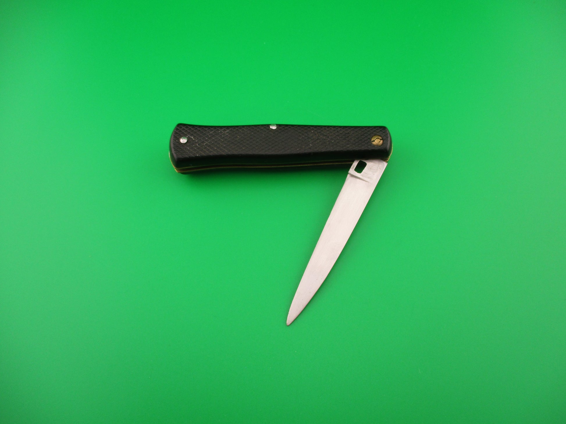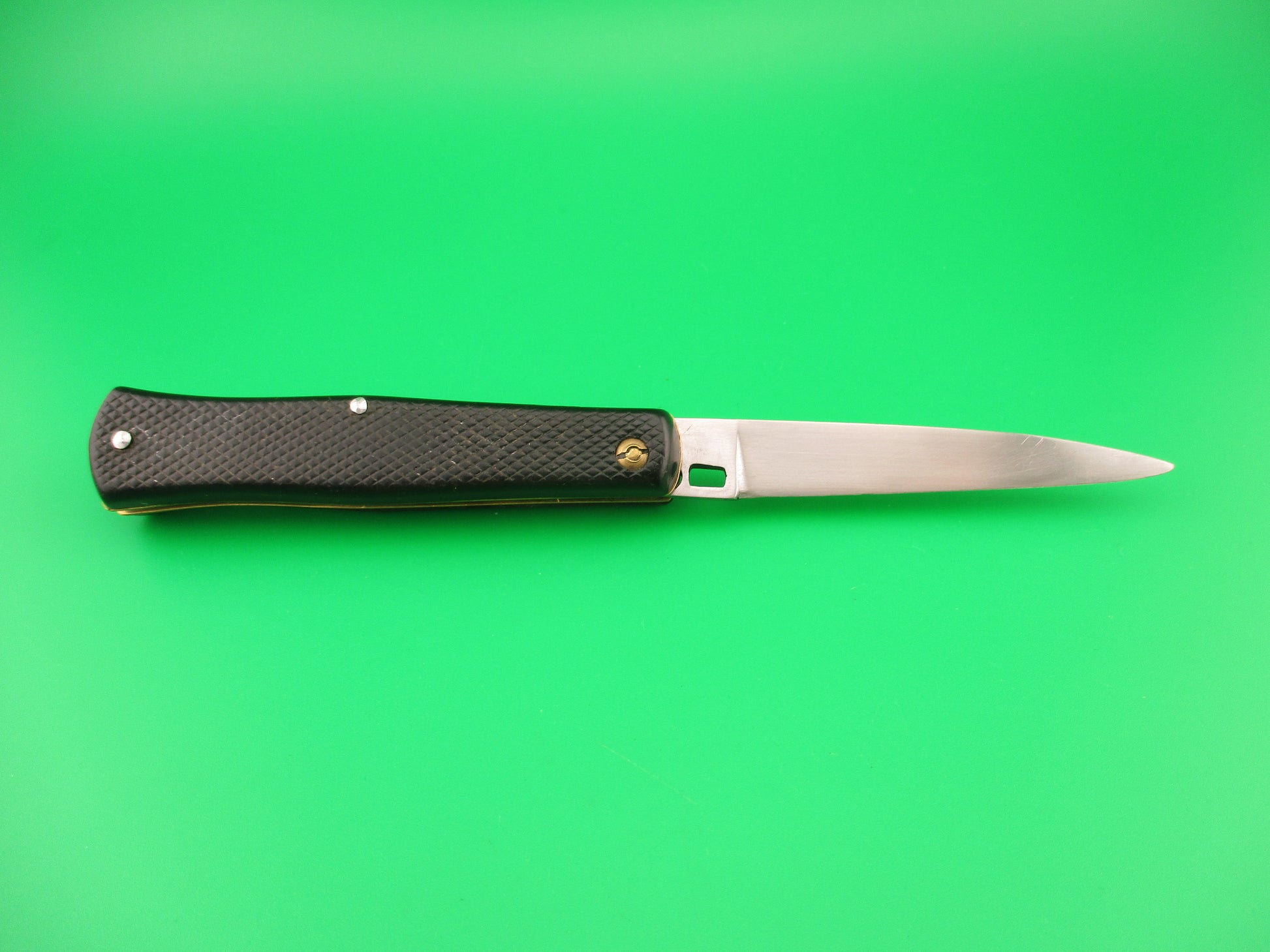 INOX 247 17cm French Fishtail black checkered vintage automatic Button open, Button close knife most likely made in the 1970s or 80s in France. The knife measures 16.6cm (6 3/8 inches) open and 3 9/16 inches closed with brass liners, steel rectangular button and nickel silver safety cap. The swedge blade is about 97% full, or better with patina and light scratches. The black synthetic checkered scales are in very good condition with slight shrinkage and slight pocket wear. The knife works well with blade tip below liners closed, good snap and good lockup with about 1/8" down at the tip that springs back when you let go. No rattle when shaken with blade open. Safety works. VG condition.