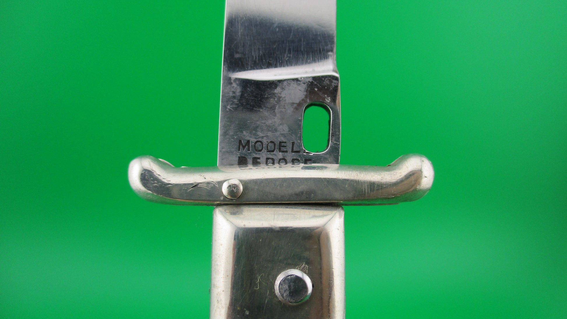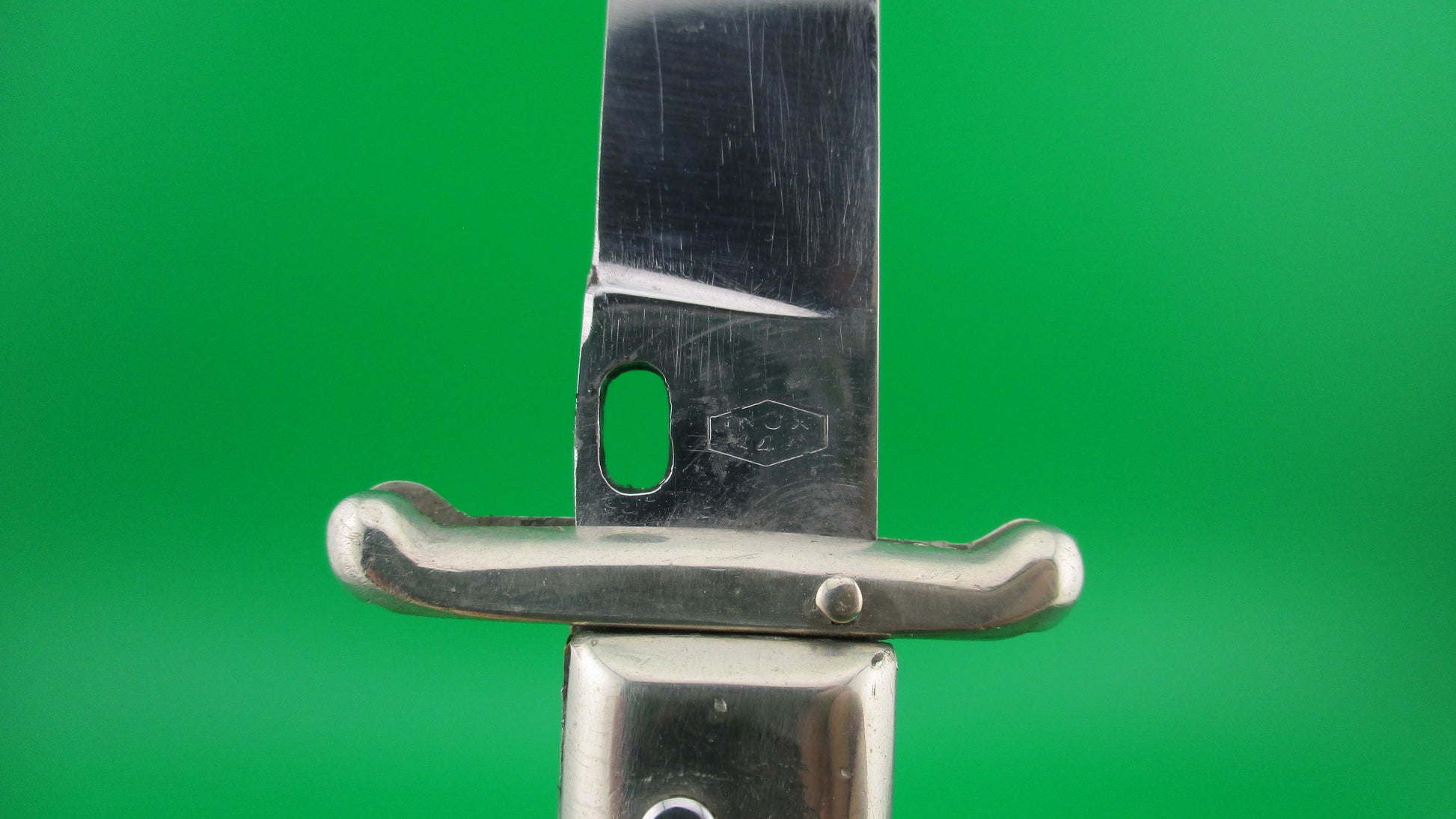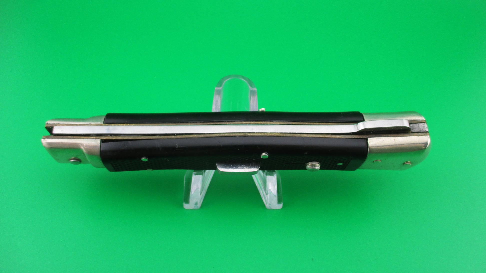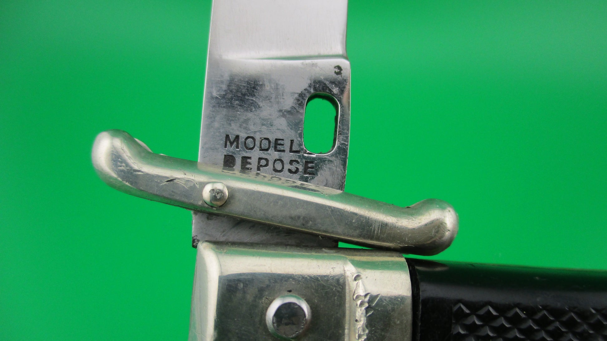 Vintage INOX 247 24cm French MODEL DEPOSE Swing Guard Black checkered automatic knife. Measures 23.7cm (9 5/8" inches) open with brass liners and nickel silver bolsters, guards, safety and pins and steel rectangular button. The flat swedge grind blade is nearly full and shiny with some light scratches and a couple of small pit spots and is marked INOX 241 inside a hexagon on the front and MODEL DEPOSE on the back of the tang. I believe this is a rarer stamp for this knife. The black checkered synthetic scales are in excellent condition. The knife works well with blade tip below liners closed, good snap and good lockup open with a hint of movement each way at the tip. Does not rattle if shaken open. Safety works. EX condition.