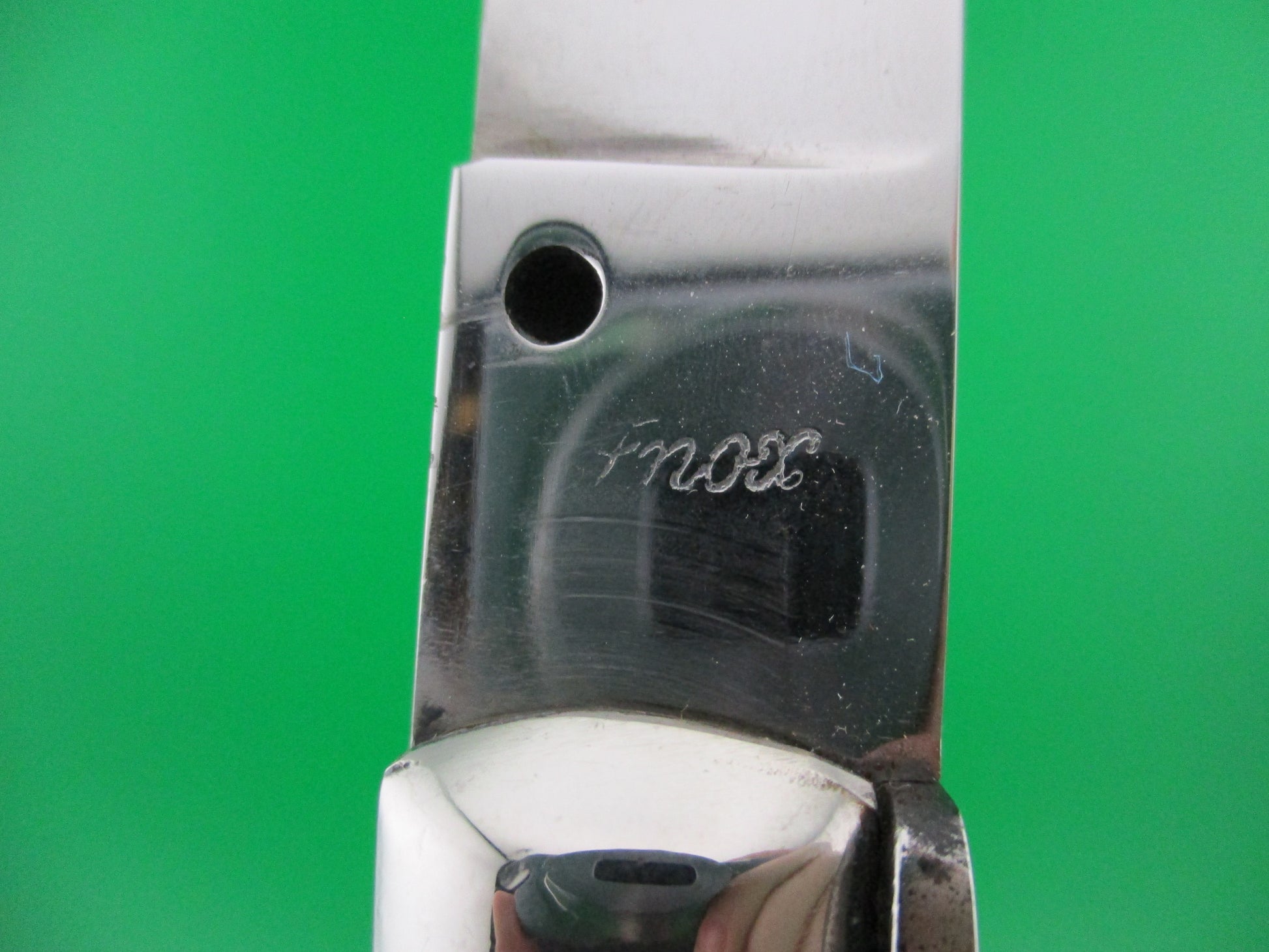 INOX 38cm Italian Stiletto swivel bolster vintage 1970s automatic knife. Measures 37.5cm (14.75 inches) open with D Stamped Brass liners and nickel silver bolsters & button and steel safety cap. The flat swedge grind blade is full with original finish and is stamped Inox. The horn scales are black/gray & cream colored with minor flaws, but decent overall. The horn is a little rough around the button and several blems on the rear scale that look a bit like patches, but I think it's just imperfections in the horn. The knife works Great with blade tip deep and centered, good snap and tight lockup with just a bit of movement at the tip. Safety works. EX condition.