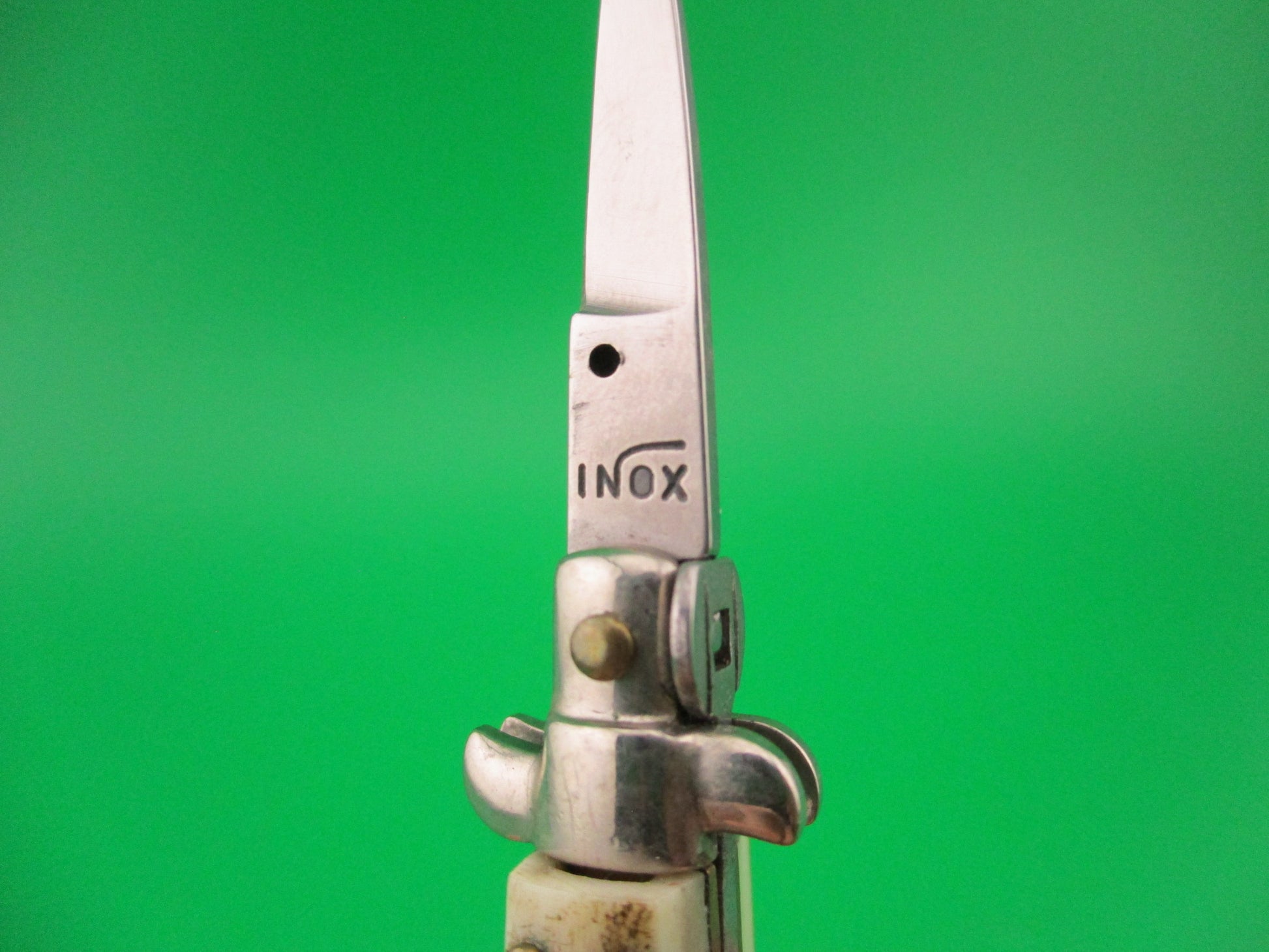 Vintage INOX 7cm Italian Tiny Stag Picklock 4 pin automatic knife made in the 1970s or 80s in Italy. This little picklock measures 7.2cm open and 4.1cm (1 5/8 inches) closed (including the loop at the back (bottom) with brass liners and nickel silver bolsters & steel button. The flat grind blade is stamped INOX on the ricasso. Scales are genuine stag with some character and in great condition held on with 4 pins on each side. Works great with blade tip below the liners closed, good snap and tight lockup. Nearly new condition.