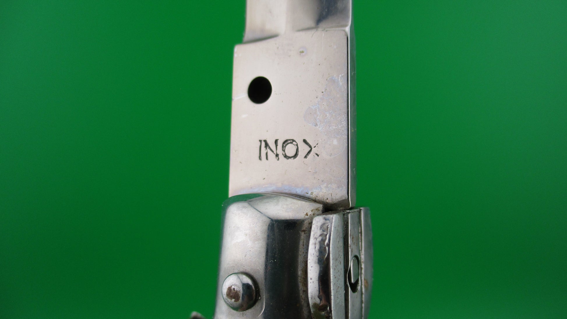 Vintage INOX AB STILETTO ITALY 33cm Italian Stiletto Dagger Pink Pearl switchblade knife made by Armando Beltrame in the 1980s. It measures 33.2cm (13 1/16 inches) open with brass liners & pins and 2 nickel silver bolsters (tops) and 2 steel bolsters (bottom), steel button & safety. The Dagger grind blade is 100% full with factory finish and stamped INOX on the ricasso and AB STILETTO ITALY on the backside. The scales (handles) are Pink Pearlex (fake pearl synthetic) in great condition. The knife works like new with blade tip deep and centered in the well, strong snap and Tight lockup open. Safety works. Nearly new condition.