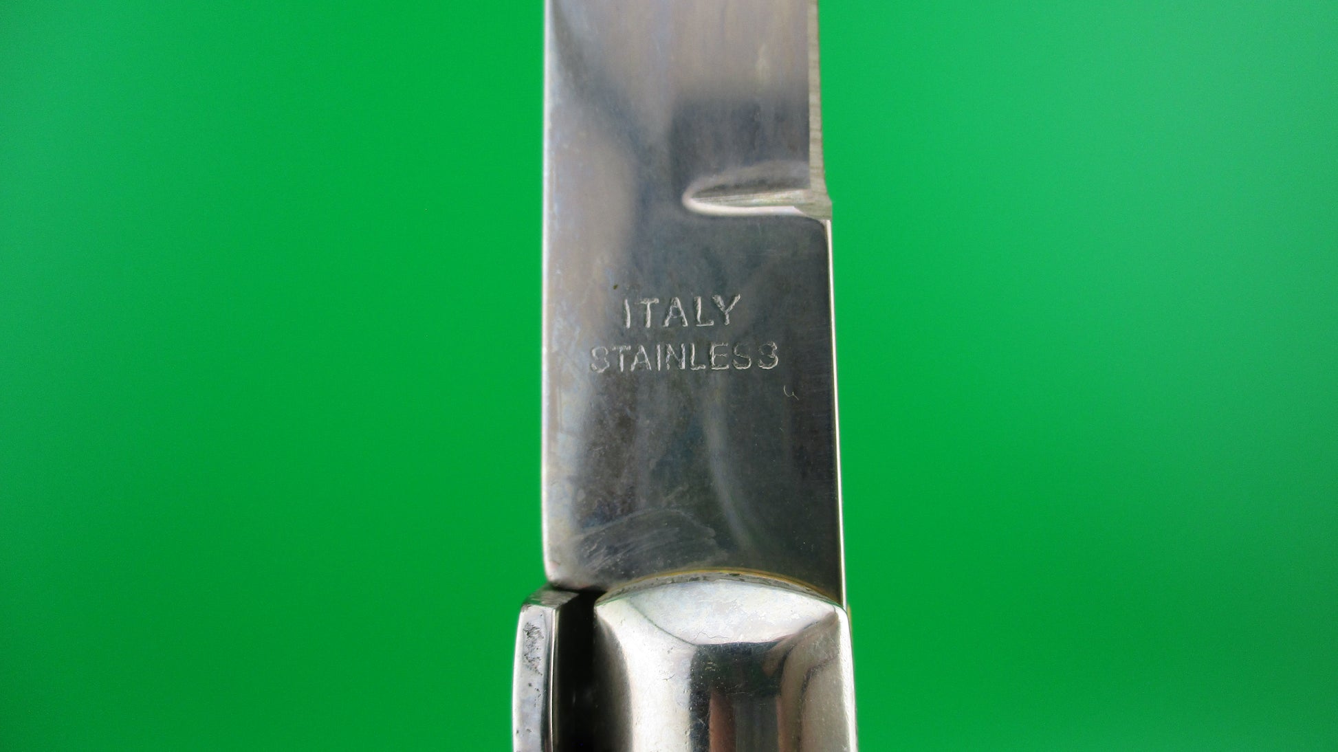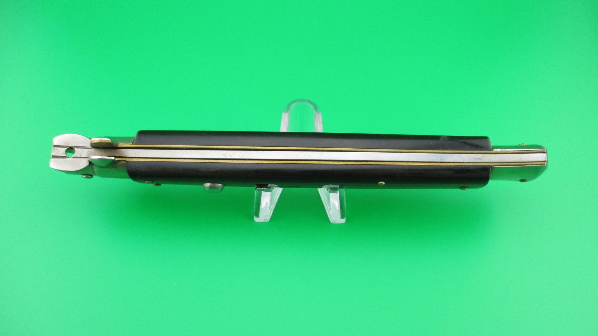 INOX ITALY STAINLESS 33cm Black Italian swivel bolster stiletto automatic knife. Measures a little over 18cm (7.25 inches) closed and 33cm (13 inches) open with brass liners that extend behind the guards on the top rear bolster only. Also that bolster is made of Nickel silver and the other 3 bolsters are steel as are the button and safety. I've seen this on other knives from this period (1980s & 90s). The bayonet style blade is full and retains all of the original finish and is stamped INOX on the front and ITALY STAINLESS on the rear ricasso (tang). Black synthetic scales are in excellent condition with just a few light handling marks. Works like new. Blade tip deep in the well, strong snap and tight lockup! Safety works. Nearly new condition.