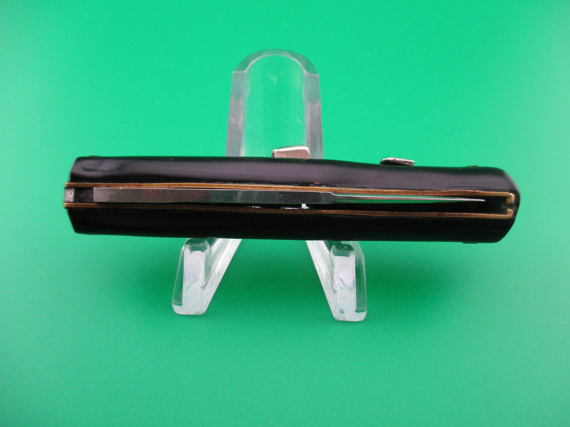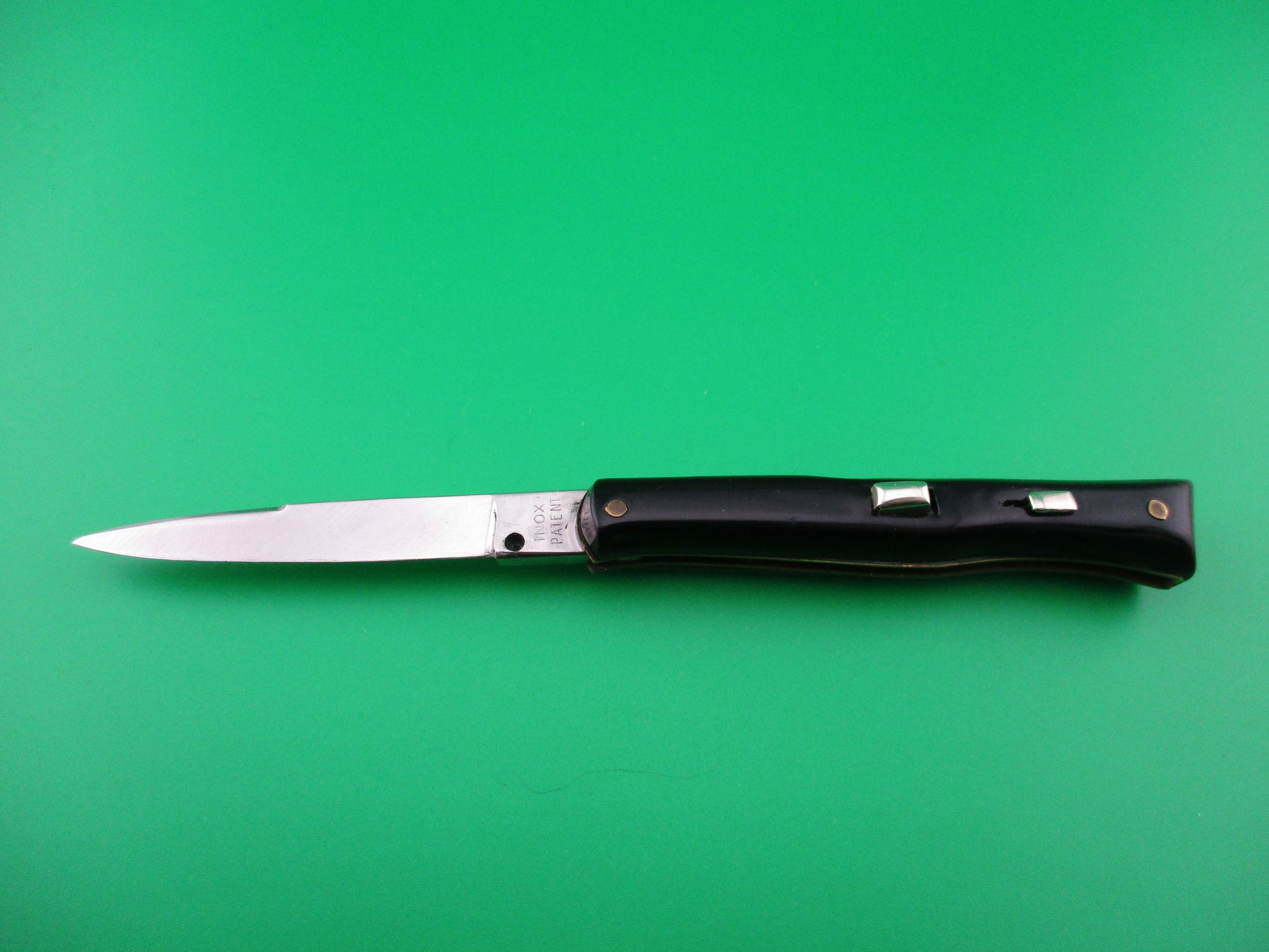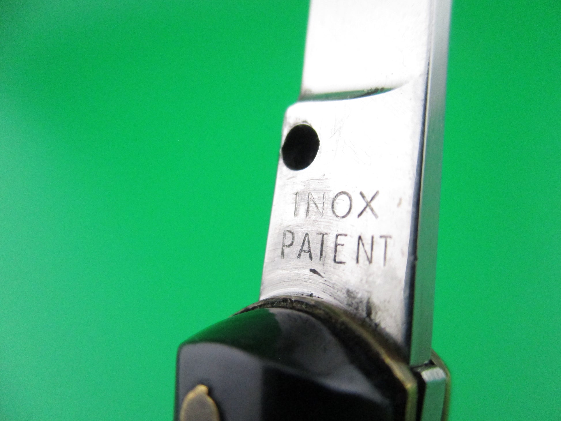 This is a really nice vintage Italian automatic knife stamped INOX PATENT on the ricasso (tang). This style is often stamped Ackermannchen and I don't know of any other name for it, so I'm going with that. As far as I can see the markings are the only difference. The knife measures just 14.5cm (5.75 inches) open with brass liners and nickel silver plated button and safety cap. The flat grind swedge blade appears to be full with much of the original factory finish and some light scratches. The black synthetic scales are in very nice condition with no cracks and slight shrinkage with some light scratches. The knife works great with the blade tip sitting deep in the well closed, good snap and good lockup open. This is a backspring release knife so you press on a grooved tab on the exposed backspring in the wrap around handles. Safety works. Beautiful old Italian INOX PATENT automatic knife.