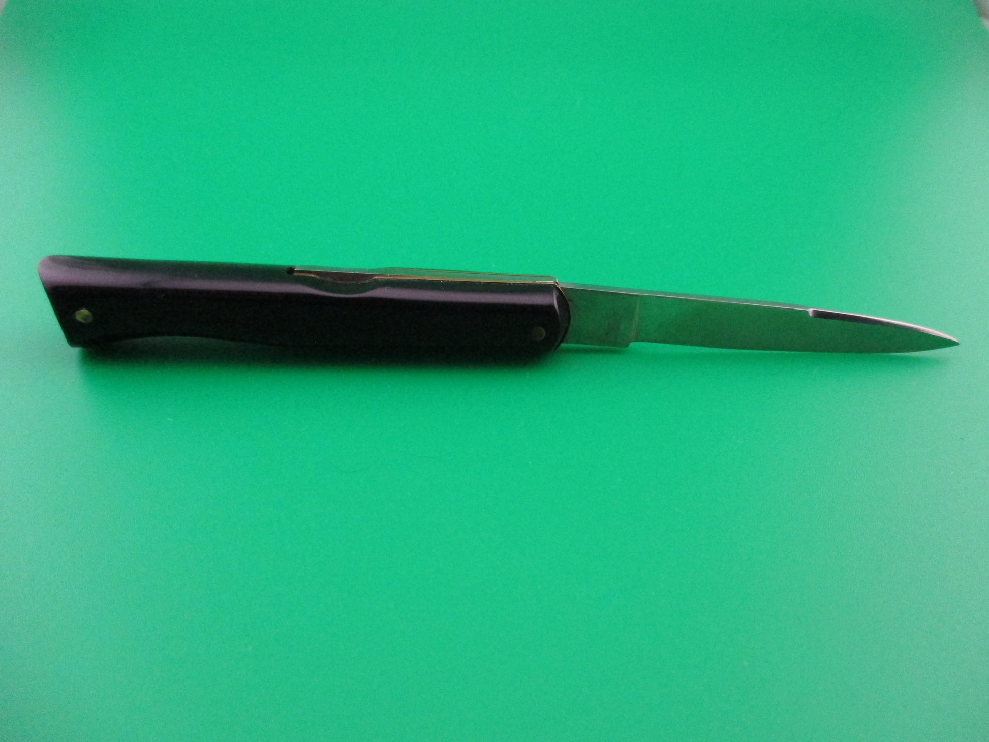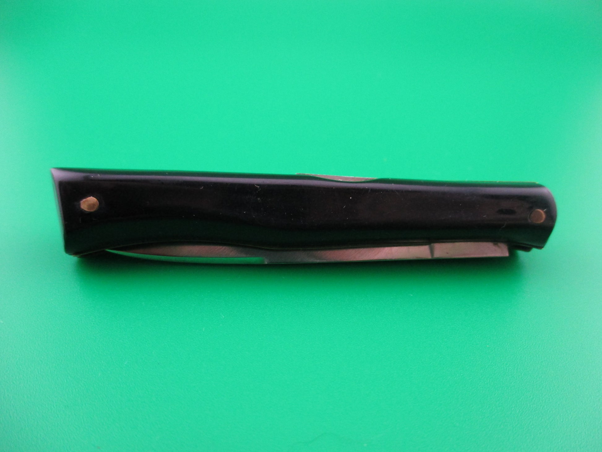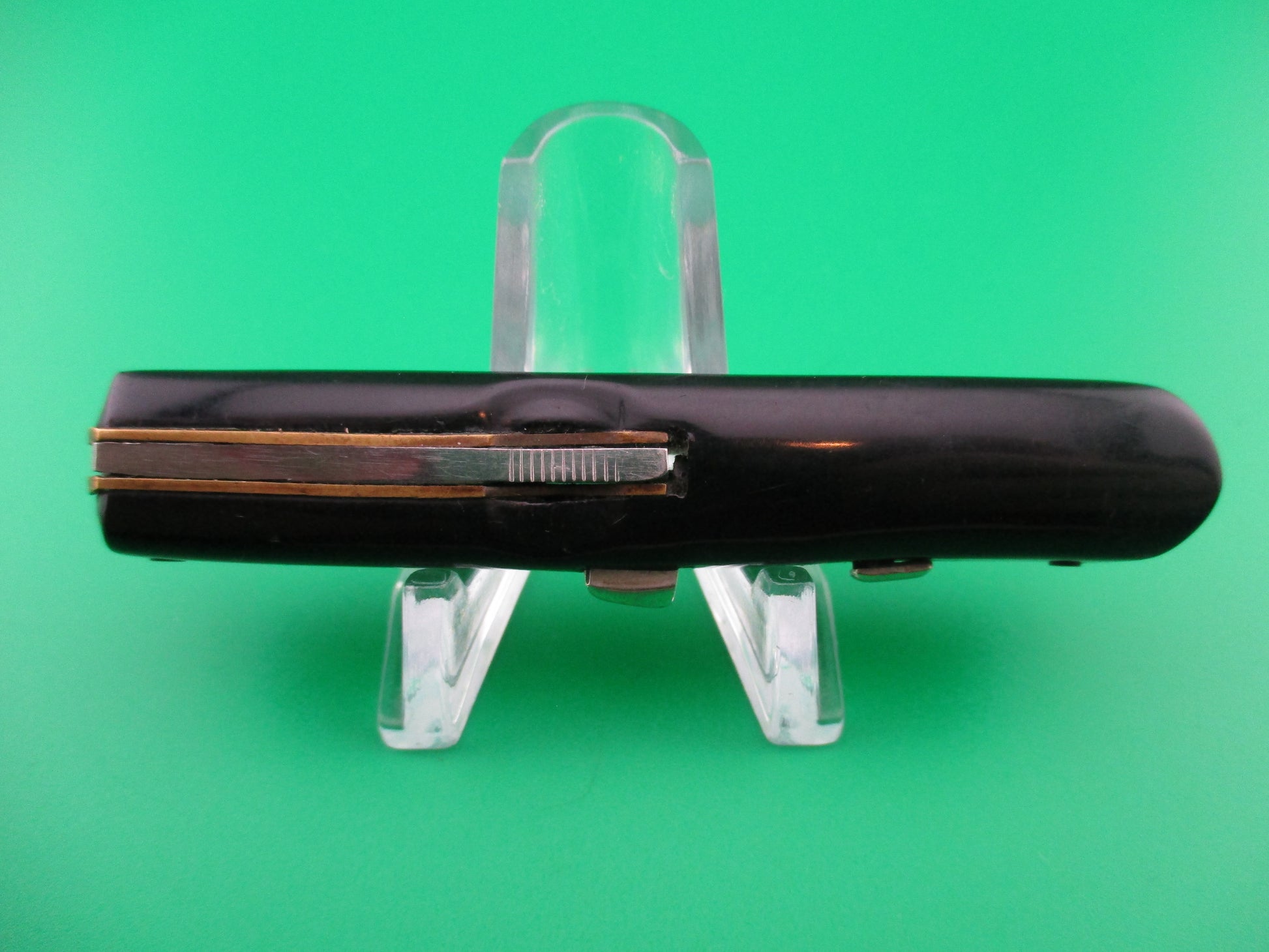 This is a really nice vintage Italian automatic knife stamped INOX PATENT on the ricasso (tang). This style is often stamped Ackermannchen and I don't know of any other name for it, so I'm going with that. As far as I can see the markings are the only difference. The knife measures just 14.5cm (5.75 inches) open with brass liners and nickel silver plated button and safety cap. The flat grind swedge blade appears to be full with much of the original factory finish and some light scratches. The black synthetic scales are in very nice condition with no cracks and slight shrinkage with some light scratches. The knife works great with the blade tip sitting deep in the well closed, good snap and good lockup open. This is a backspring release knife so you press on a grooved tab on the exposed backspring in the wrap around handles. Safety works. Beautiful old Italian INOX PATENT automatic knife.