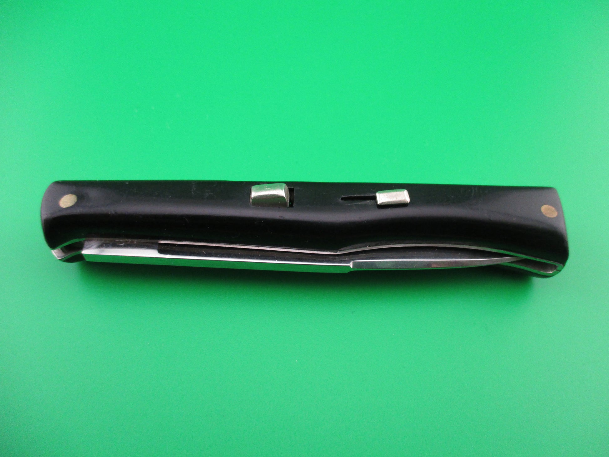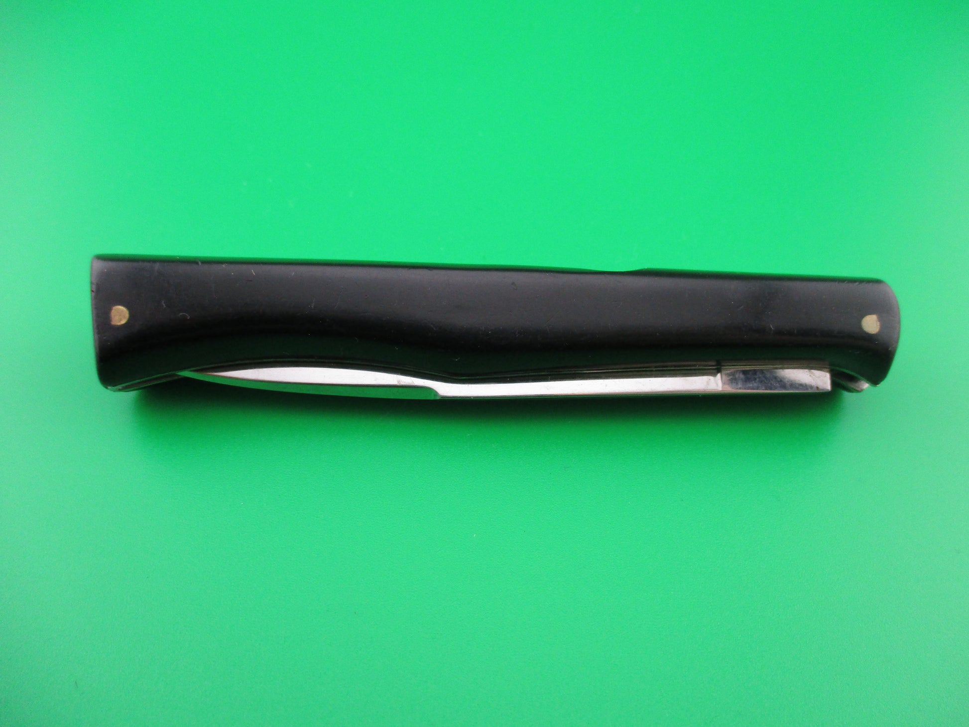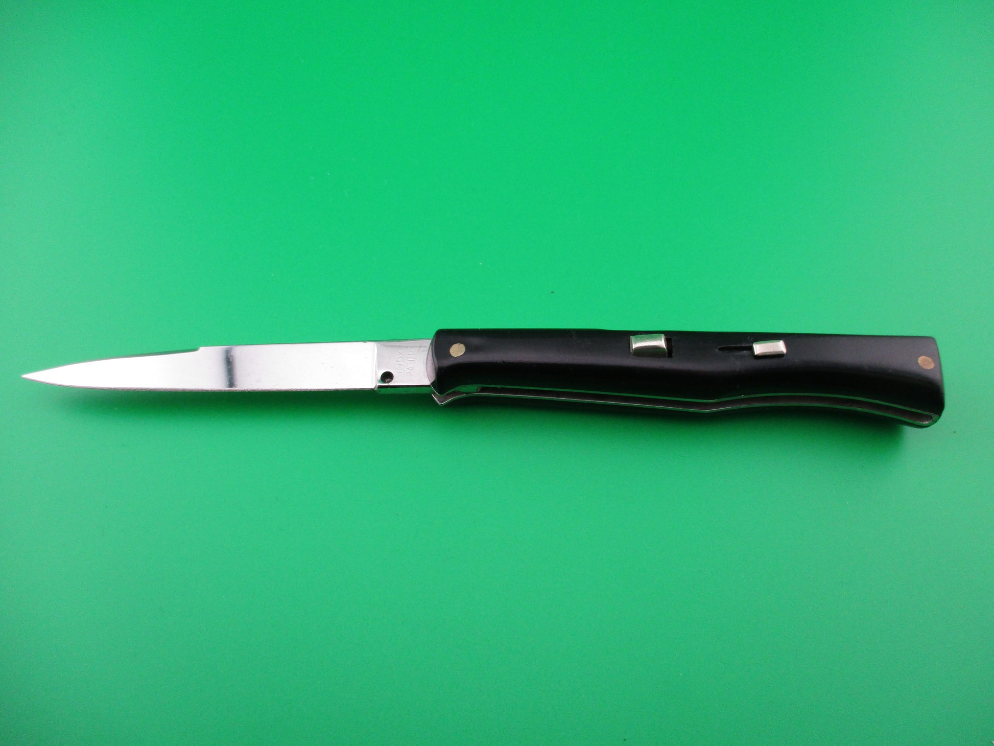 This is a really nice vintage Italian automatic knife stamped INOX PATENT on the ricasso (tang). This style is often stamped Ackermannchen and I don't know of any other name for it, so I'm going with that. As far as I can see the markings are the only difference. The knife measures just under 18cm (7 inches) open with steel liners and nickel silver plated button and safety cap. The flat grind swedge blade appears to be full with the original factory finish and some light scratches. The black synthetic scales are in very nice condition with no cracks or shrinkage with some handling marks/light scratches. The knife works great with the blade tip sitting deep in the well closed, good snap and good lockup open. This is a backspring release knife so you press on a grooved tab on the exposed backspring in the wrap around handles. Beautiful old Italian INOX PATENT automatic knife.