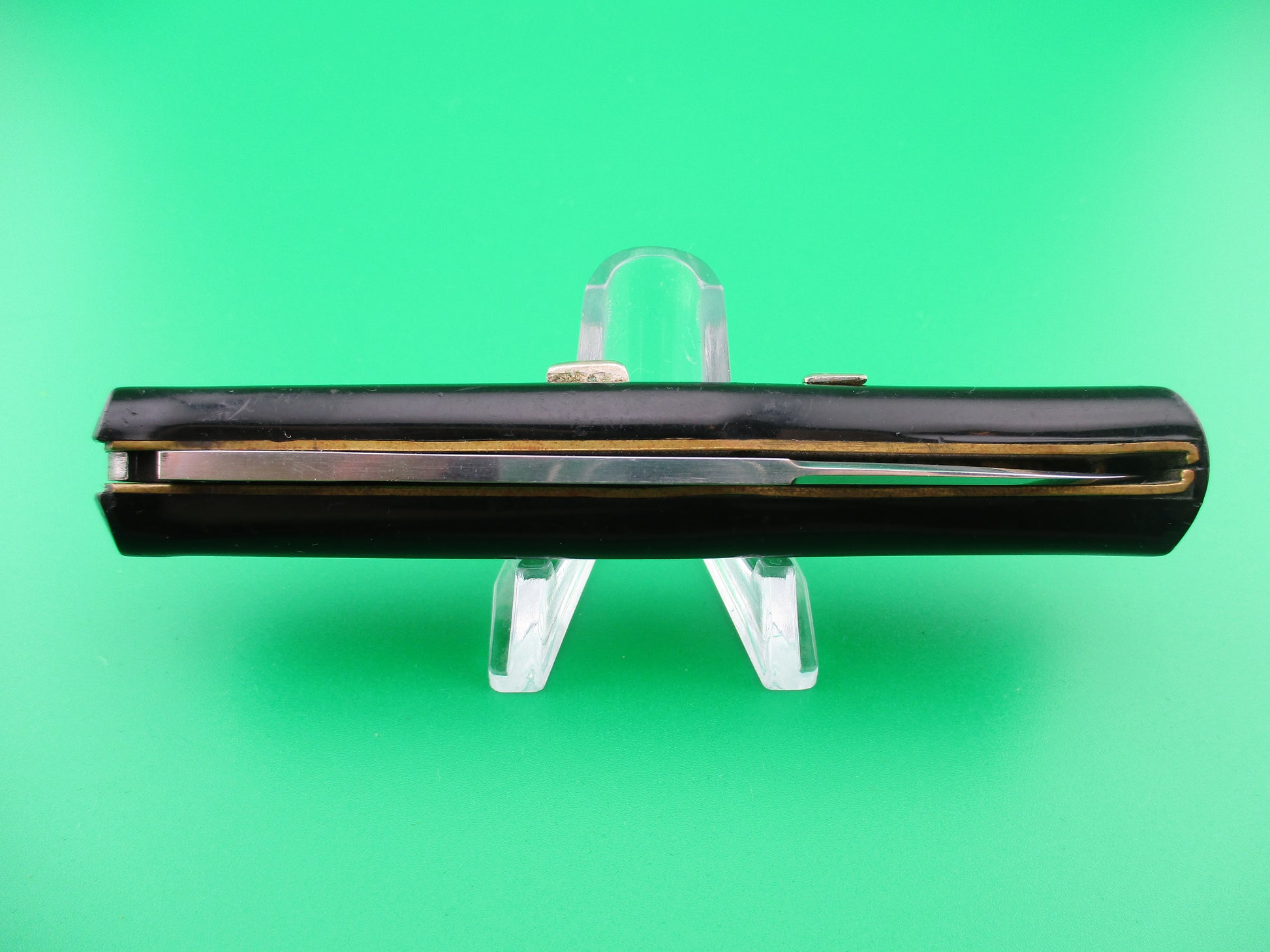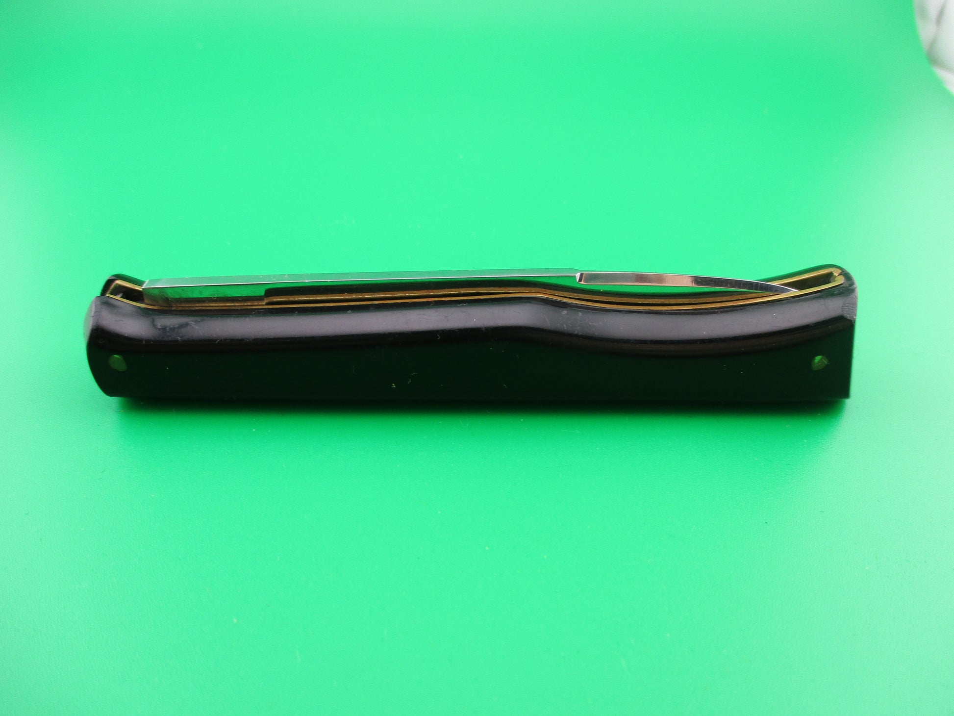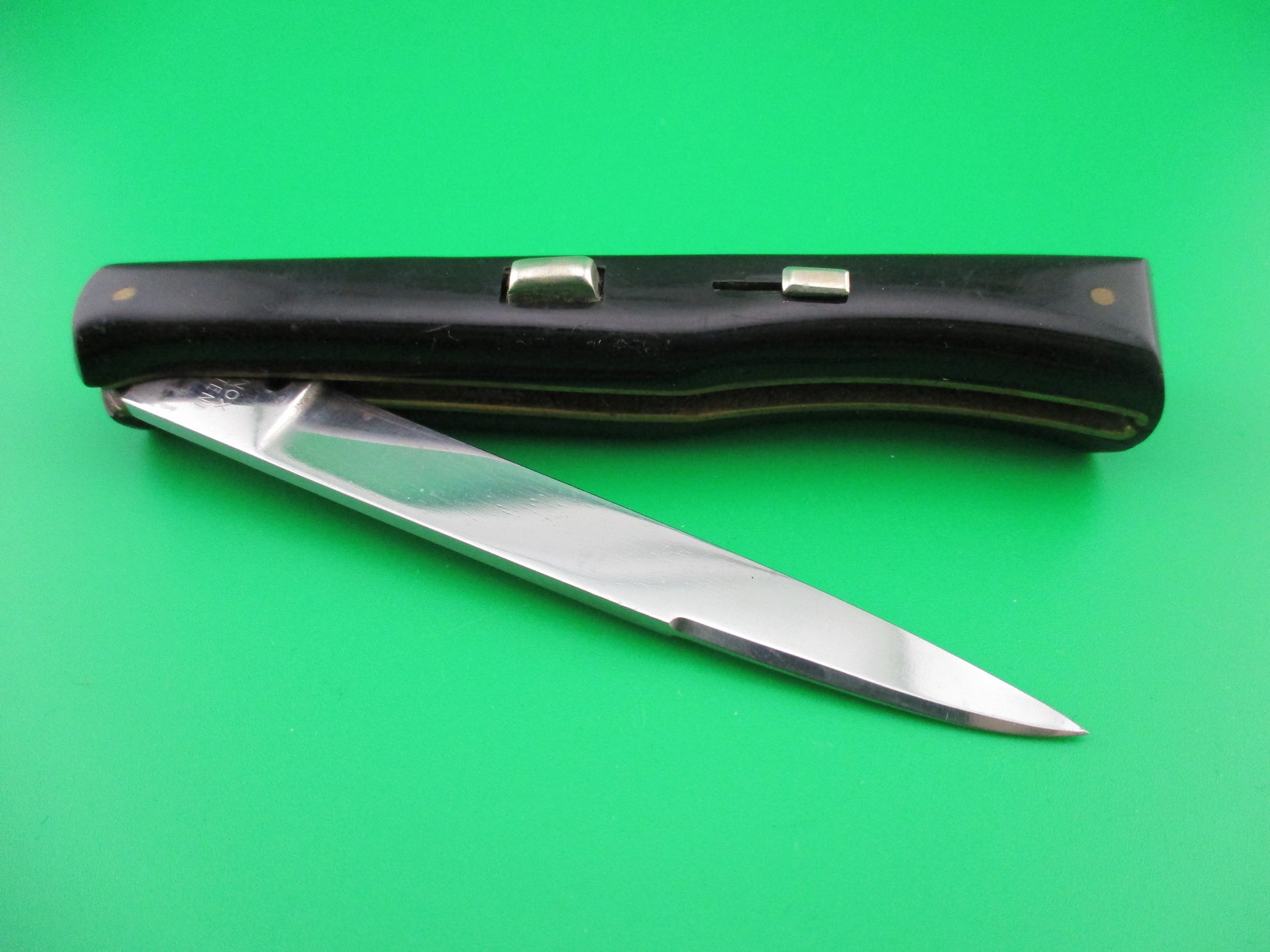 This is a nice vintage Italian automatic knife stamped INOX PATENT on the ricasso (tang). This style is often stamped Ackermannchen and I don't know of any other name for it, so I'm going with that. As far as I can see the markings are the only difference. The knife measures just under 21cm (8.25 inches) open with brass liners and nickel silver button and safety cap. The blade appears to be full with the original factory finish and some light scratches. The black synthetic scales are in very nice condition with no cracks and only a little shrinkage and some scuffs on the back edge as seen in pics. The knife works great with the blade tip sitting deep in the well closed, good snap and Tight lockup open. This is a backspring release knife so you press on a grooved tab on the exposed backspring in the wrap around handles. Safety works. Beautiful old Italian INOX PATENT automatic knife.