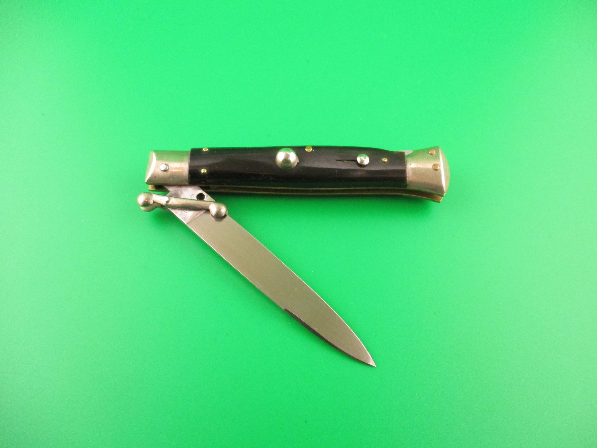 Vintage Inox PATENT 21cm Italian Swing guard switchblade knife made in Italy in the 1960s or 70s. The knife measures 20.5cm (8 1/18 inches) open and 4 3/8 inches closed with D stamped brass liners & pins and nickel silver bolsters, guards, button & safety cap. The flat swedge blade is 100% full with original finish and some very light scratches and the ricasso is stamped Inox in cursive with the reverse stamped PATENT. The genuine horn scales are mostly black and in great condition. The knife works great with blade tip below liners closed, Strong snap and tight lockup. Does not rattle if shaken when open. Safety works. EX+ condition.
