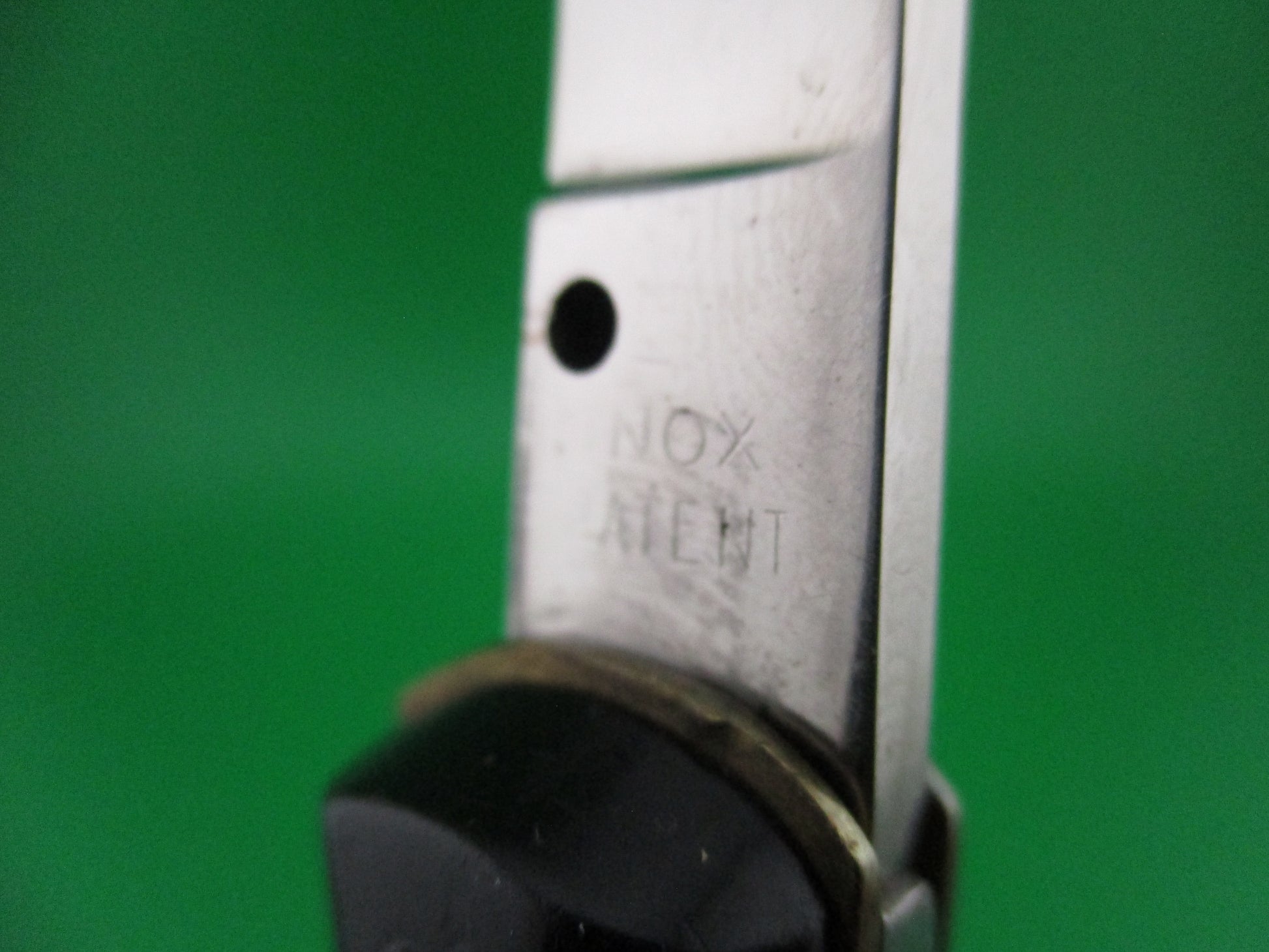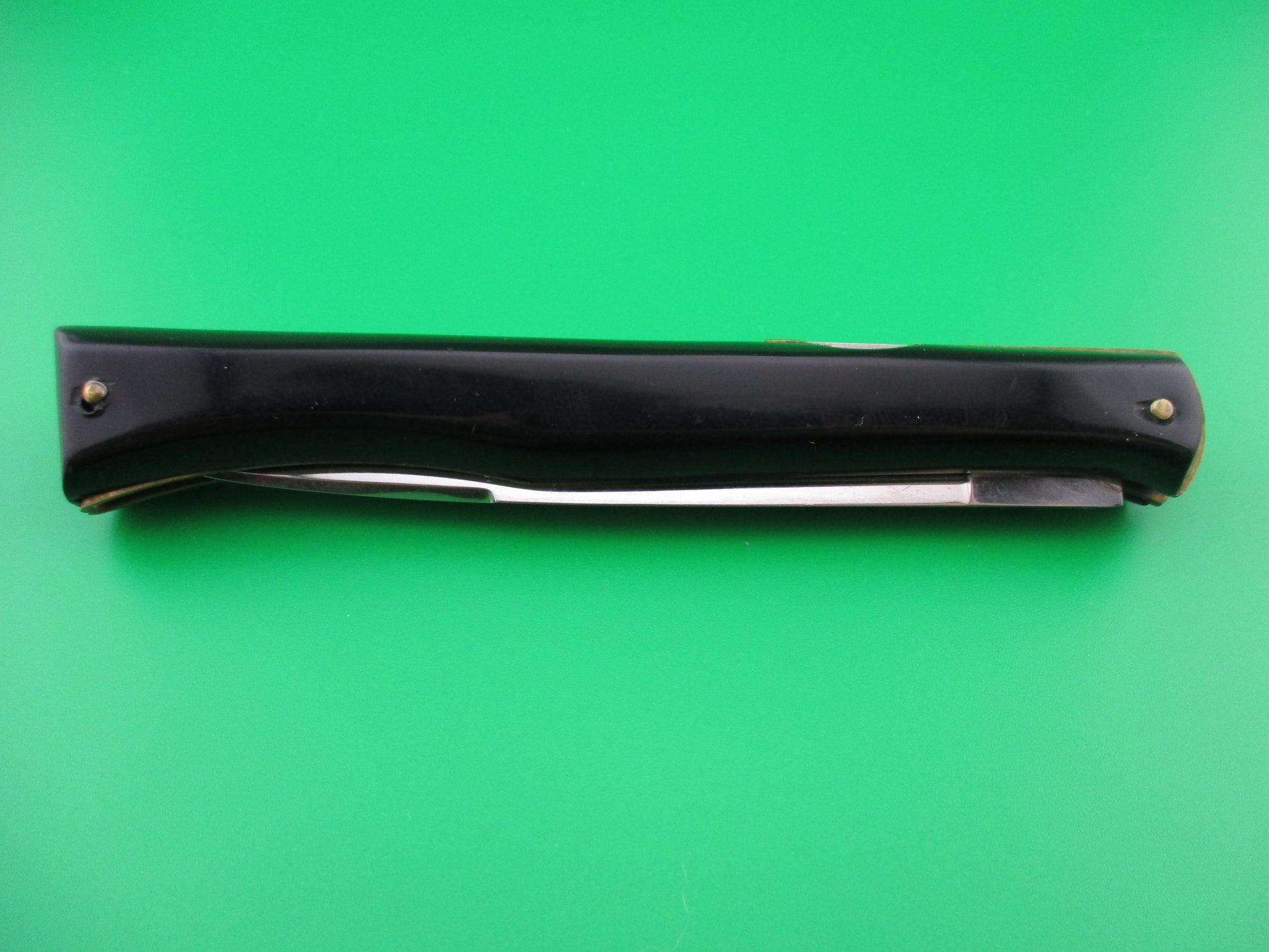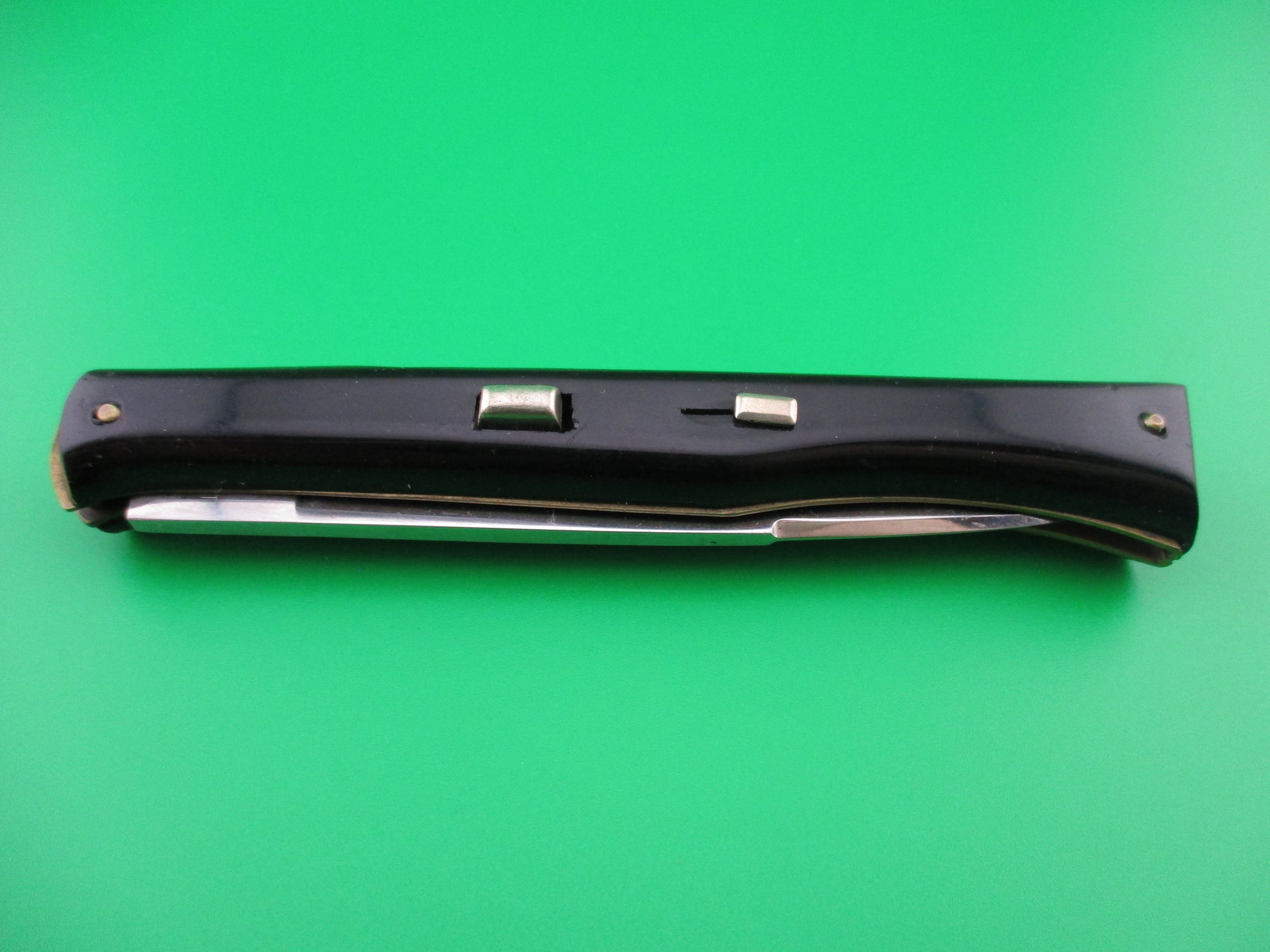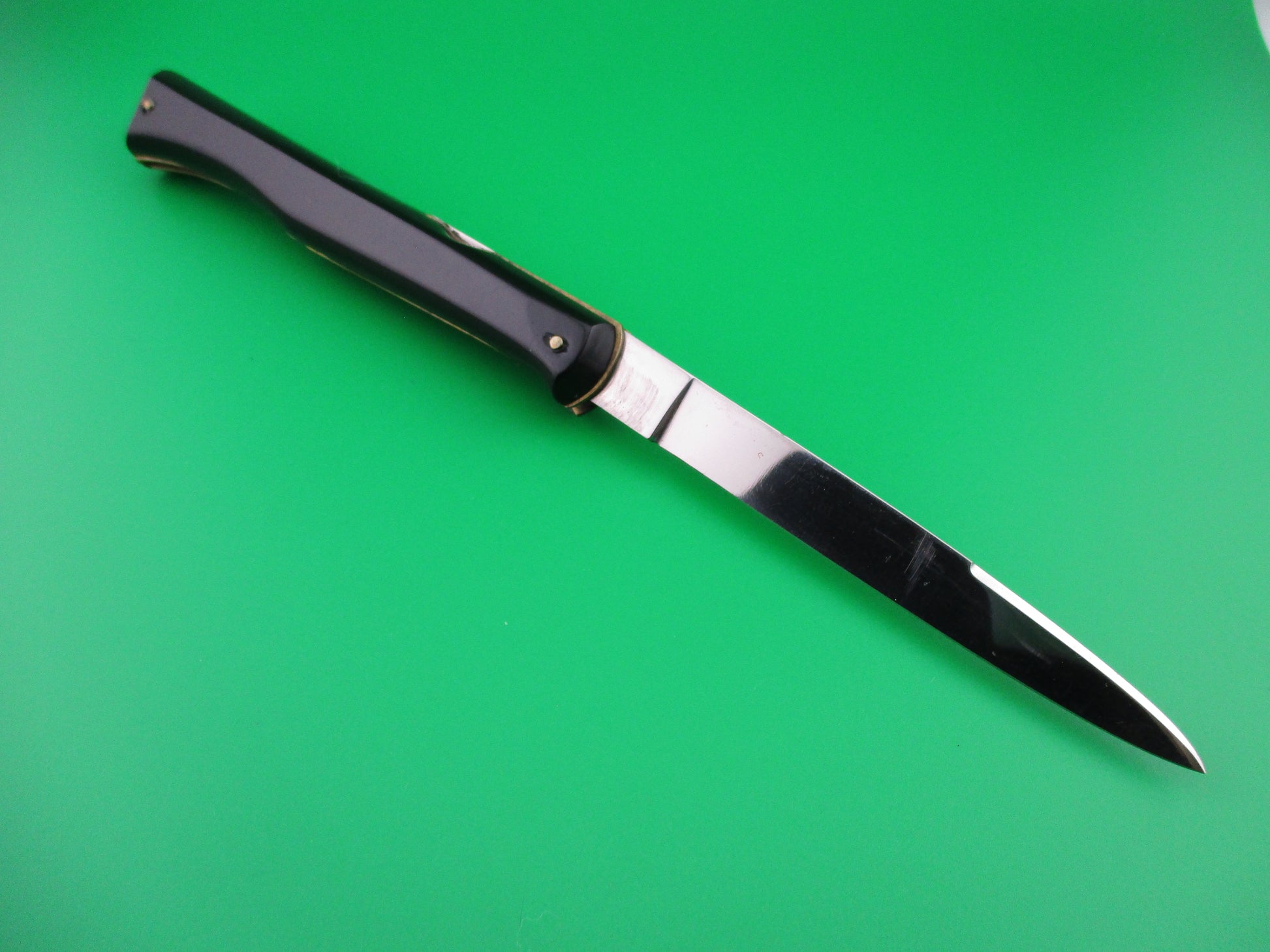 This is a nice vintage Italian automatic knife stamped INOX PATENT on the ricasso (tang). This style is often stamped Ackermannchen and I don't know of any other name for it, so I'm going with that. As far as I can see the markings are the only difference. The knife measures just under 24cm (9.25 inches) open with brass liners and nickel silver button and safety cap. The blade appears to be full with the original factory finish and some light scratches. The black synthetic scales are in very nice condition with no cracks and only a little shrinkage. The knife works great with the blade tip sitting deep in the well closed, good snap and Tight lockup open. This is a backspring release knife so you press on a grooved tab that is the only exposed backspring in the wrap around handles. Beautiful old Italian INOX PATENT automatic knife.
