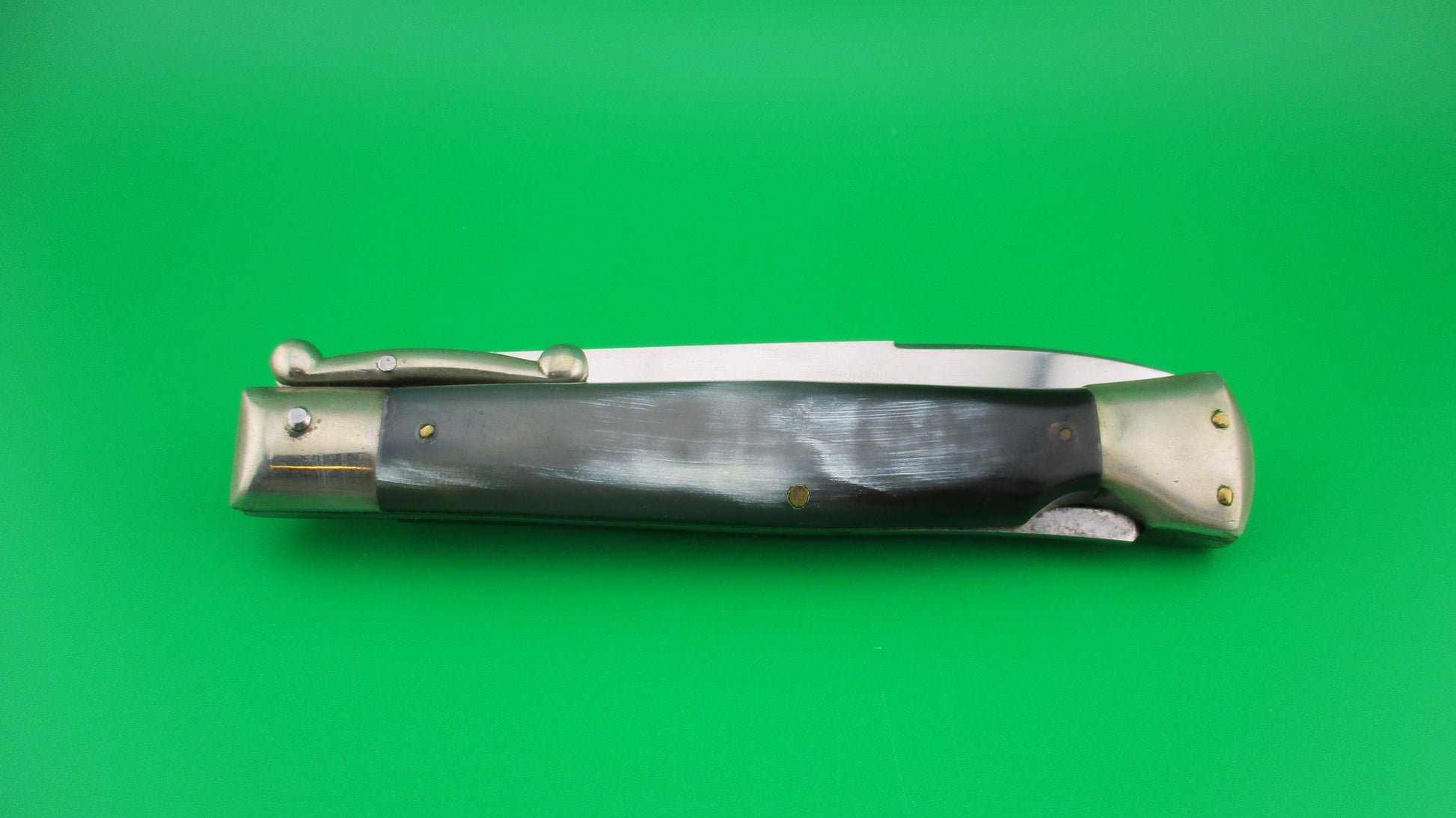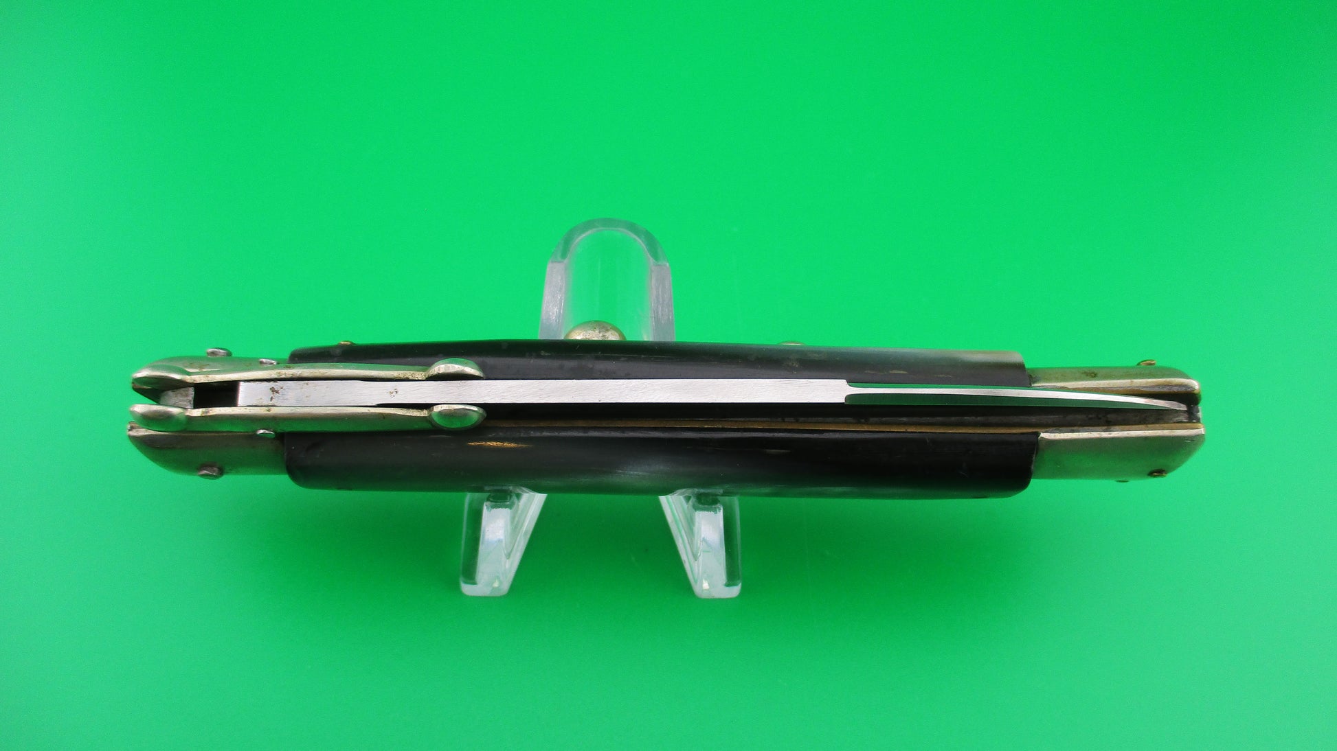 Inox 23cm Italian Swing Guard Vintage 1960s or 70s automatic knife measures 23cm (9 1/16 inches) open with D stamped brass liners and nickel silver bolsters, guards, button and safety. The flat grind swedge spear point blade is 99% full, or better with most of the original finish intact and some light scratches. The ricasso is stamped Inox slanted and in script and backside is blank. The genuine horn scales range in colors of black, tan, white and translucent gray/green and are in excellent condition with some light handling marks. The knife works great with the blade tip deep and centered in the well closed, good snap and good lockup with about 1/16" movement each way at the tip which is pretty normal for these. Safety works. EX+ condition.