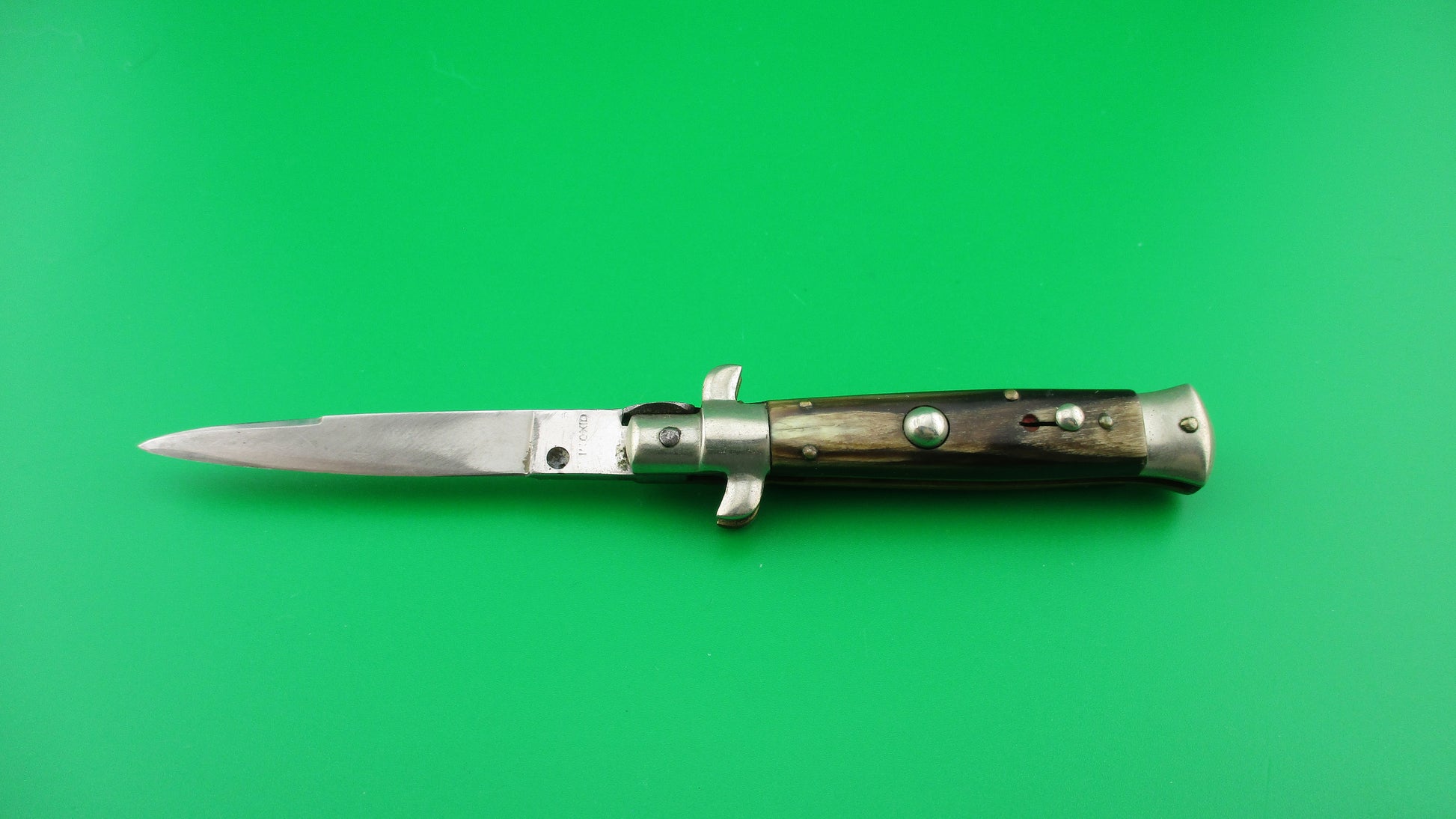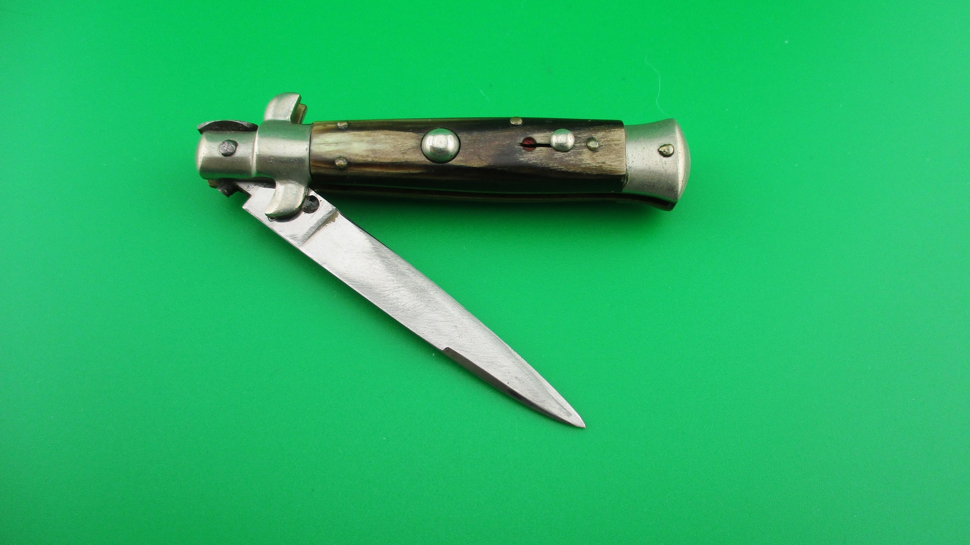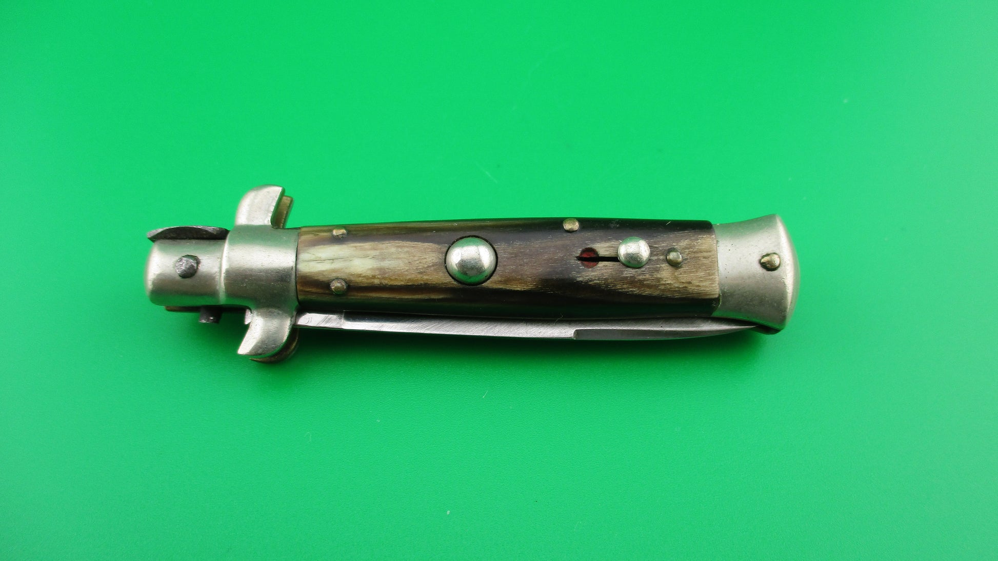 INOXID 14cm Italian Picklock 1950s Vintage automatic knife measures 14cm (5.5 inches) open with brass liners & pins with nickel silver bolsters, button and safety. Flat grind swedge blade is mostly full and shiny (about 96%) with light scratches and is stamped INOXID on the ricasso (tang). The horn scales range in color from dark brown to tan to cream and are in excellent condition with Red Dot safety. The knife works well with blade tip centered and below the liners closed, good snap and good lockup with just a bit of movement. No rattle if shaken with blade open. You have to "pick" lift the locking tab with your thumbnail to "unlock" the blade to be closed. Safety works. VG+ condition.