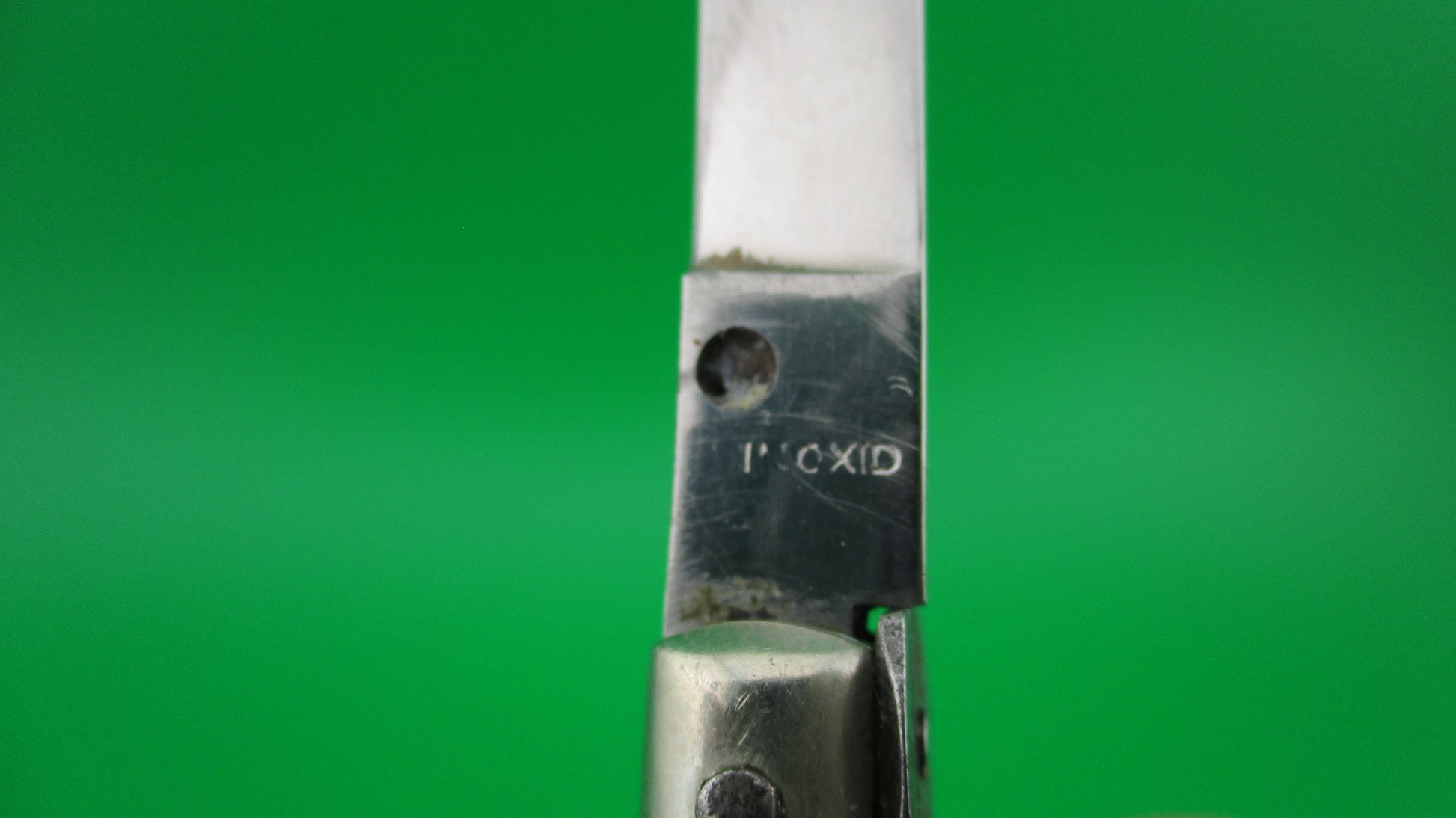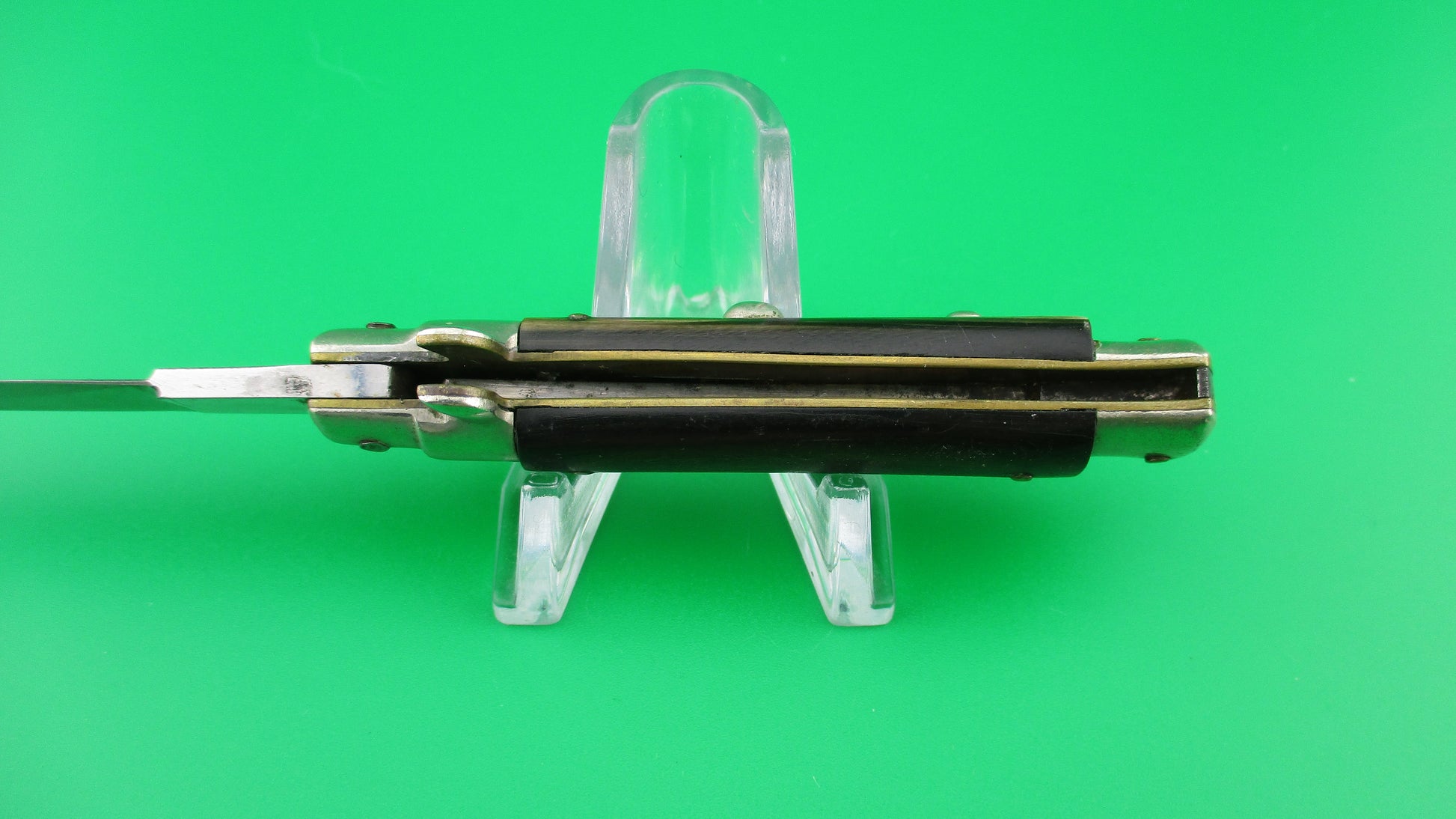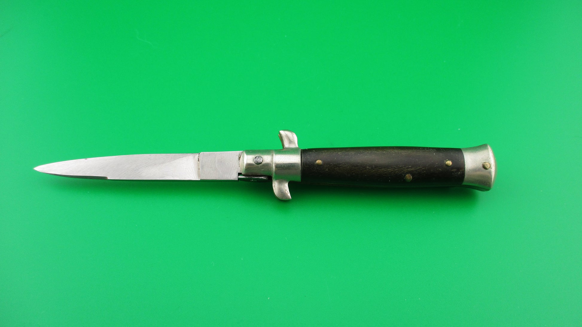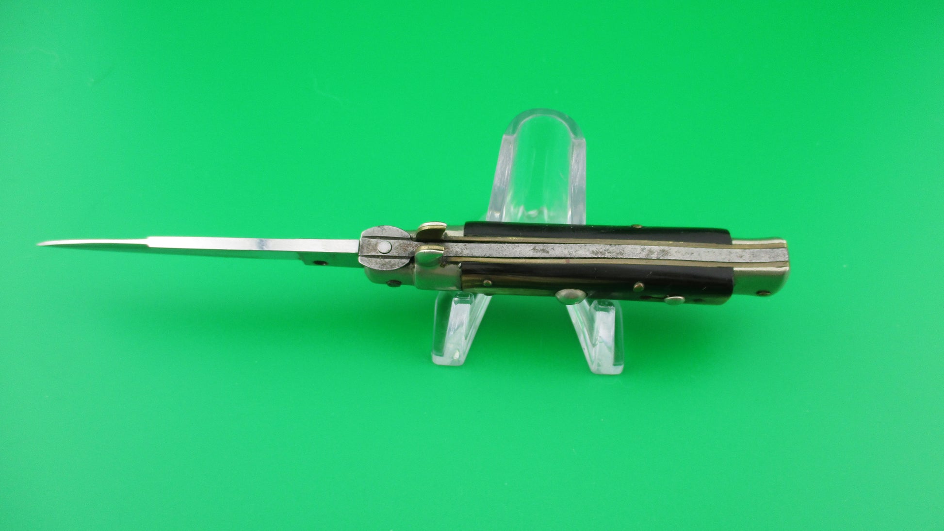 INOXID 14cm Italian Picklock 1950s Vintage automatic knife measures 14cm (5.5 inches) open with brass liners & pins with nickel silver bolsters, button and safety. Flat grind swedge blade is mostly full and shiny (about 96%) with light scratches and is stamped INOXID on the ricasso (tang). The horn scales range in color from dark brown to tan to cream and are in excellent condition with Red Dot safety. The knife works well with blade tip centered and below the liners closed, good snap and good lockup with just a bit of movement. No rattle if shaken with blade open. You have to "pick" lift the locking tab with your thumbnail to "unlock" the blade to be closed. Safety works. VG+ condition.