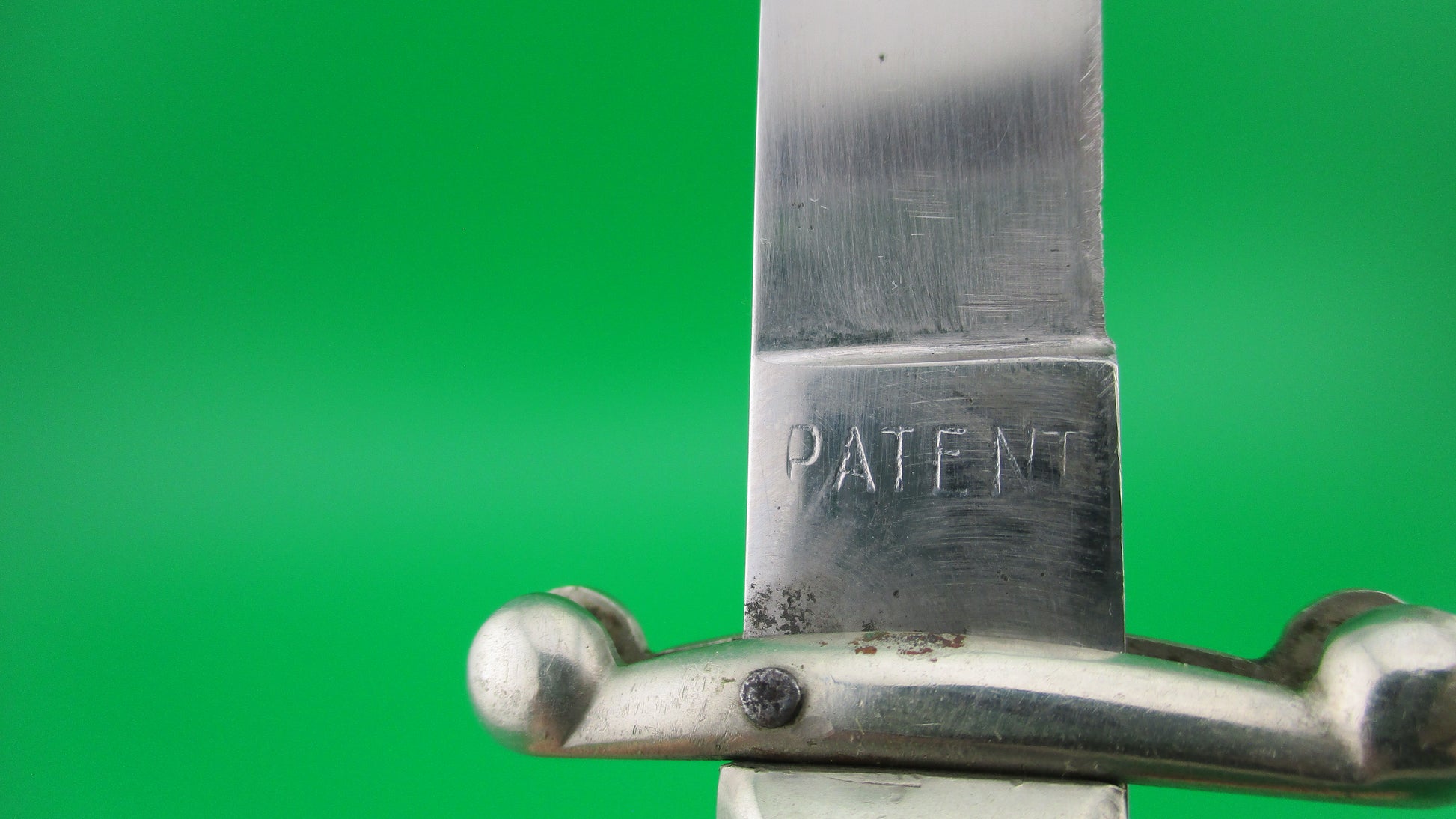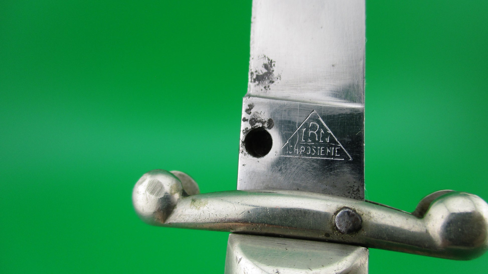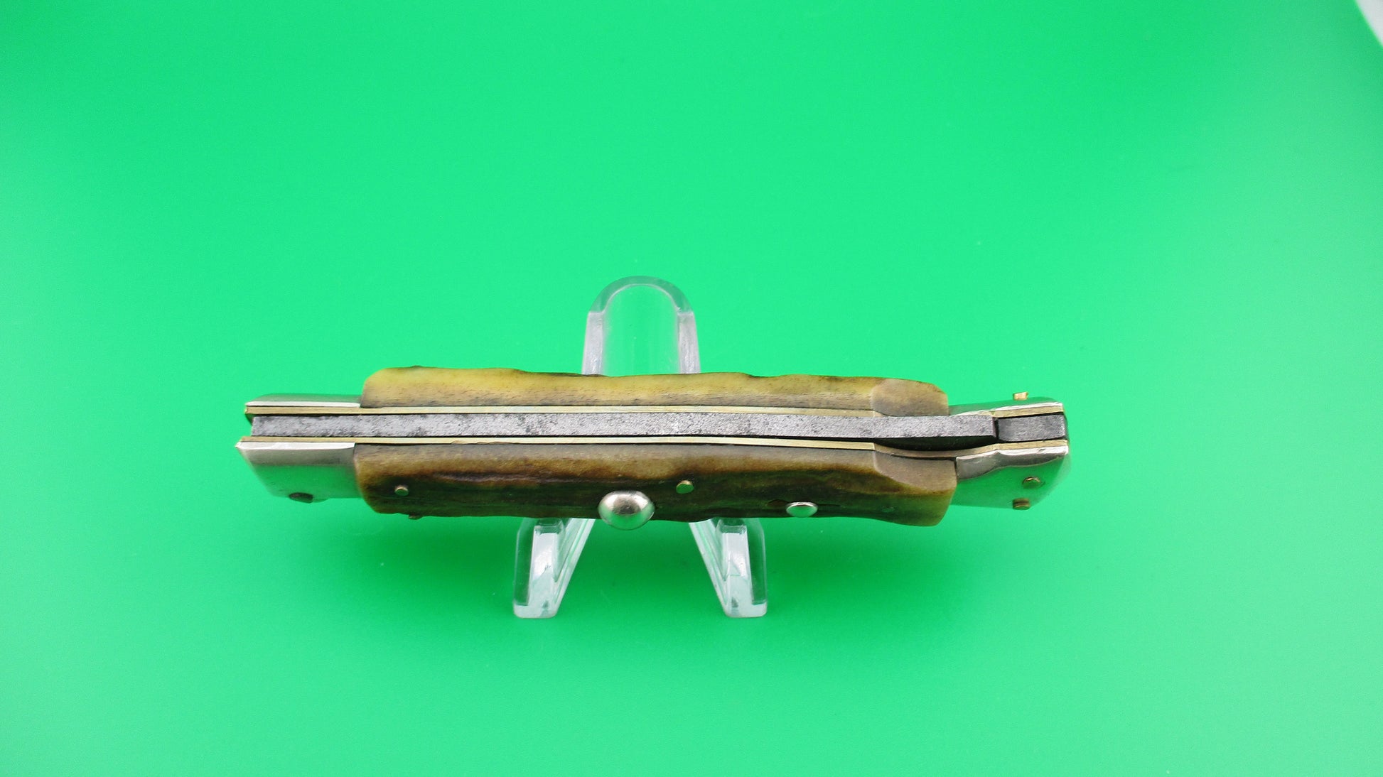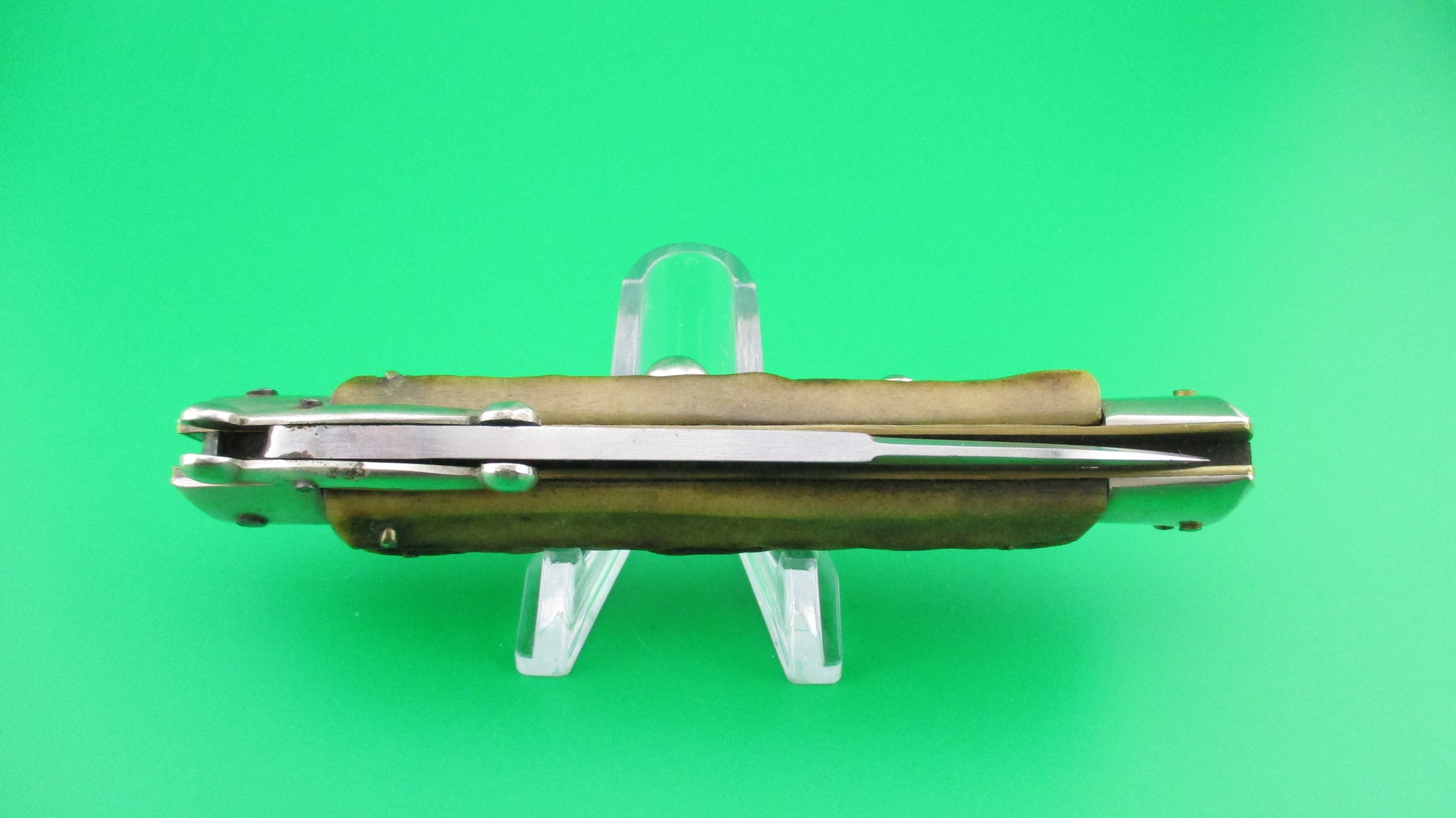 Vintage 1960s IRN Ich Rostenie PATENT 21cm Italian Swing Guard Stag Red Dot automatic knife measures 20.4cm (8 inches) open with D stamped brass liners and nickel silver bolsters, button and guards. The flat swedge blade is 96% full with light scratches from opening/use and is marked IRN Ich Rostenie inside a triangle on the front and PATENT on the rear ricasso. The stag scales are in Great condition with no cracks or chips and have a Red dot safety. The knife works great with blade tip below liners when closed, good snap and good lockup with about 1/8 inch up and down at tip that snaps back when you let go. Safety works. EX- condition.