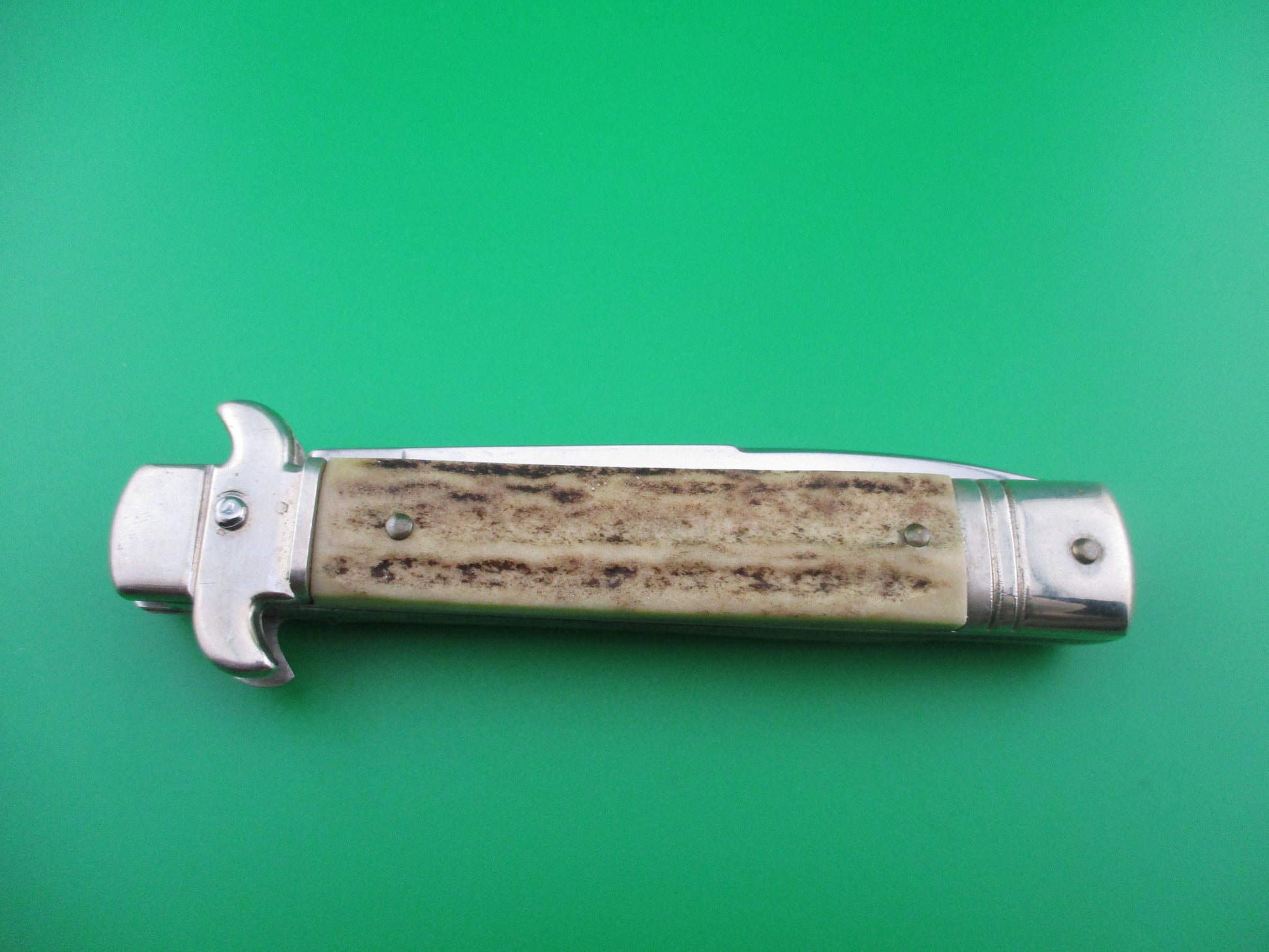 Leverletto by Bill DeShivs AKC Italy switchblade. It measures 4.5 inches closed and just under 8 inches open. Nickel silver bolsters and lever with stag scales. Works great and is in EX+ condition with only some light handling marks.