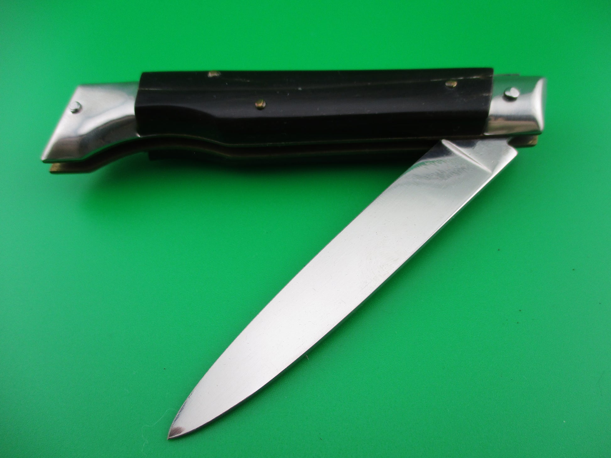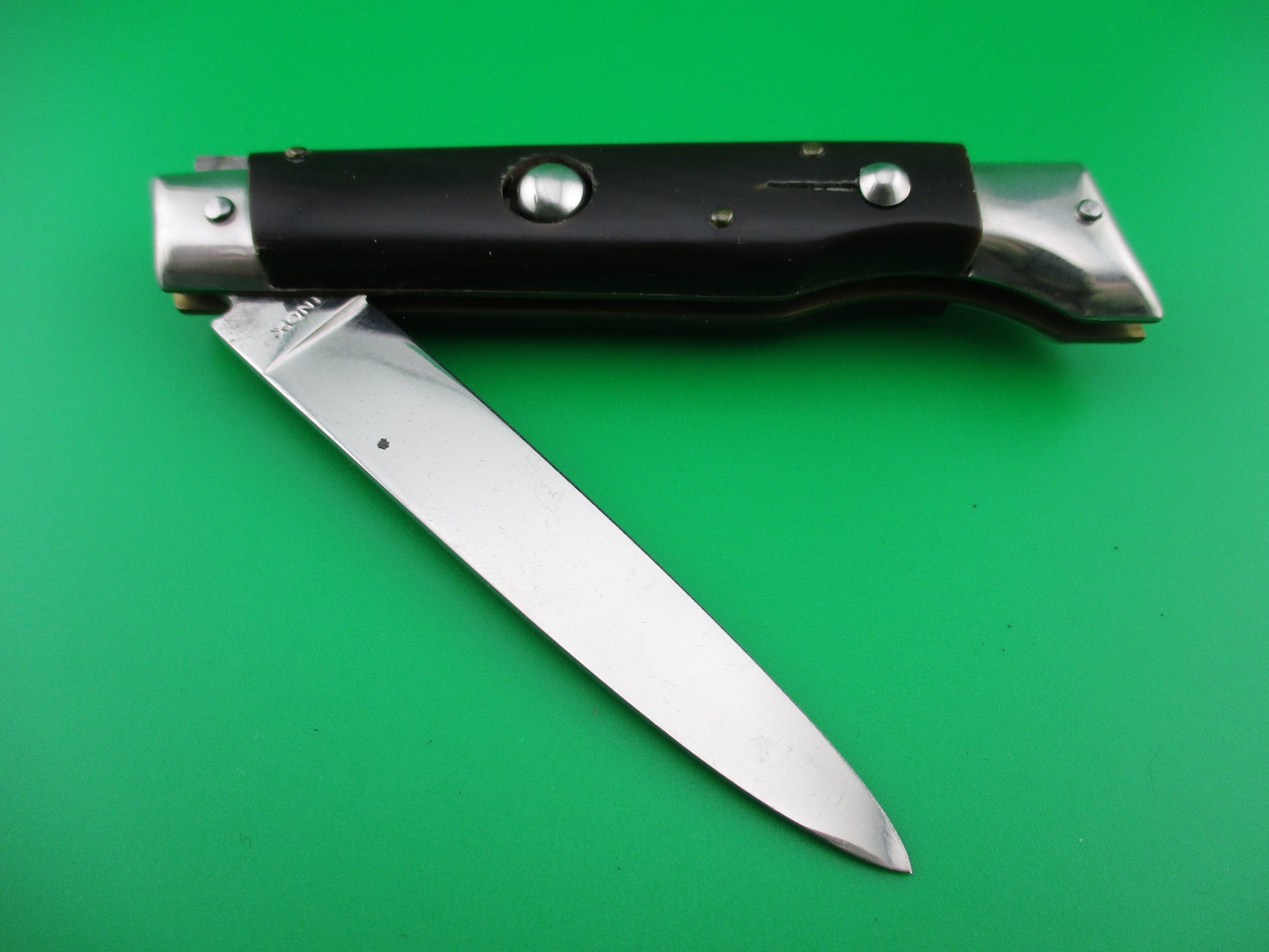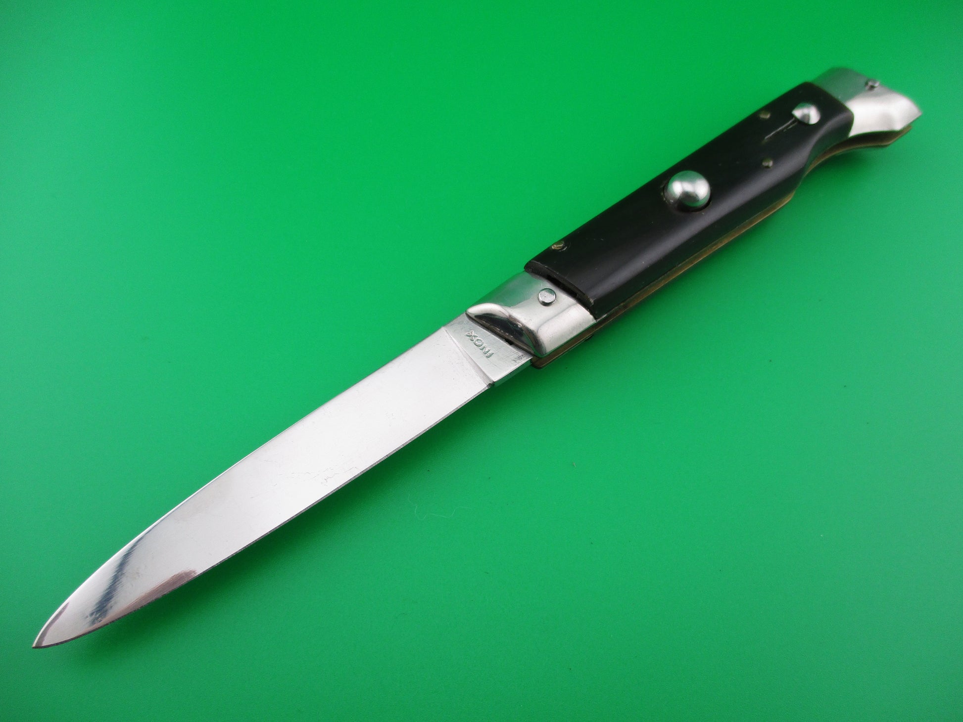 Italian 20cm INOX Vintage Slant Bolster automatic knife. I believe these are from the 1970s and are BoBc (Button open, Button close) knives. This one measures 20cm (7.75 inches) open with brass liners and nickel silver bolsters and button. The flat grind blade appears to be full with all of the factory finish and is stamped INOX on the tang. This knife works great with the blade tip seating deep in the well closed, strong snap and tight lockup. The safety works. EX+ vintage Italian slant bolster automatic knife.