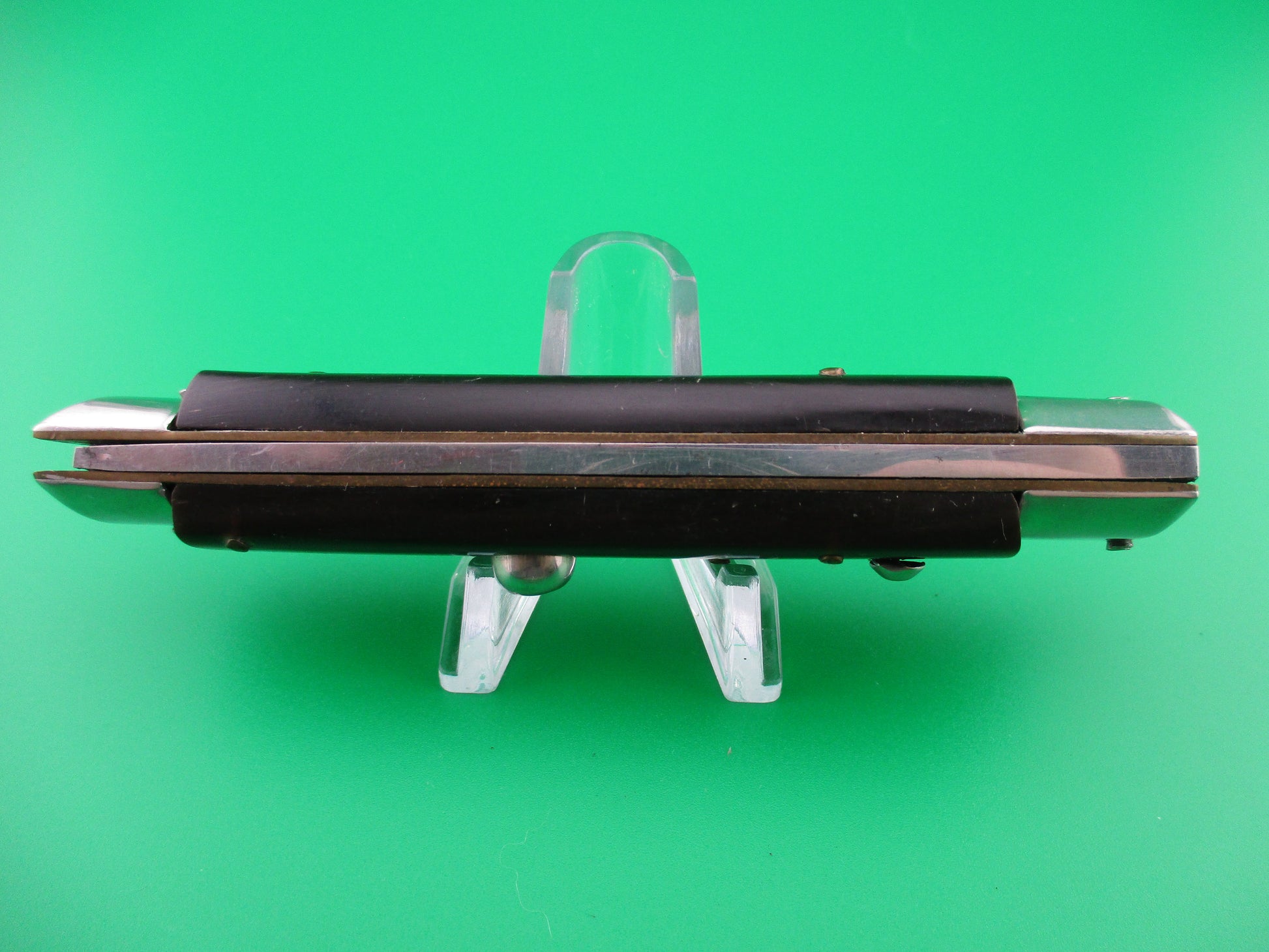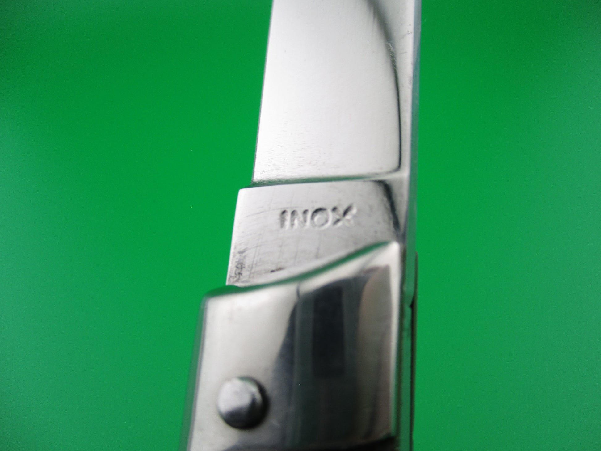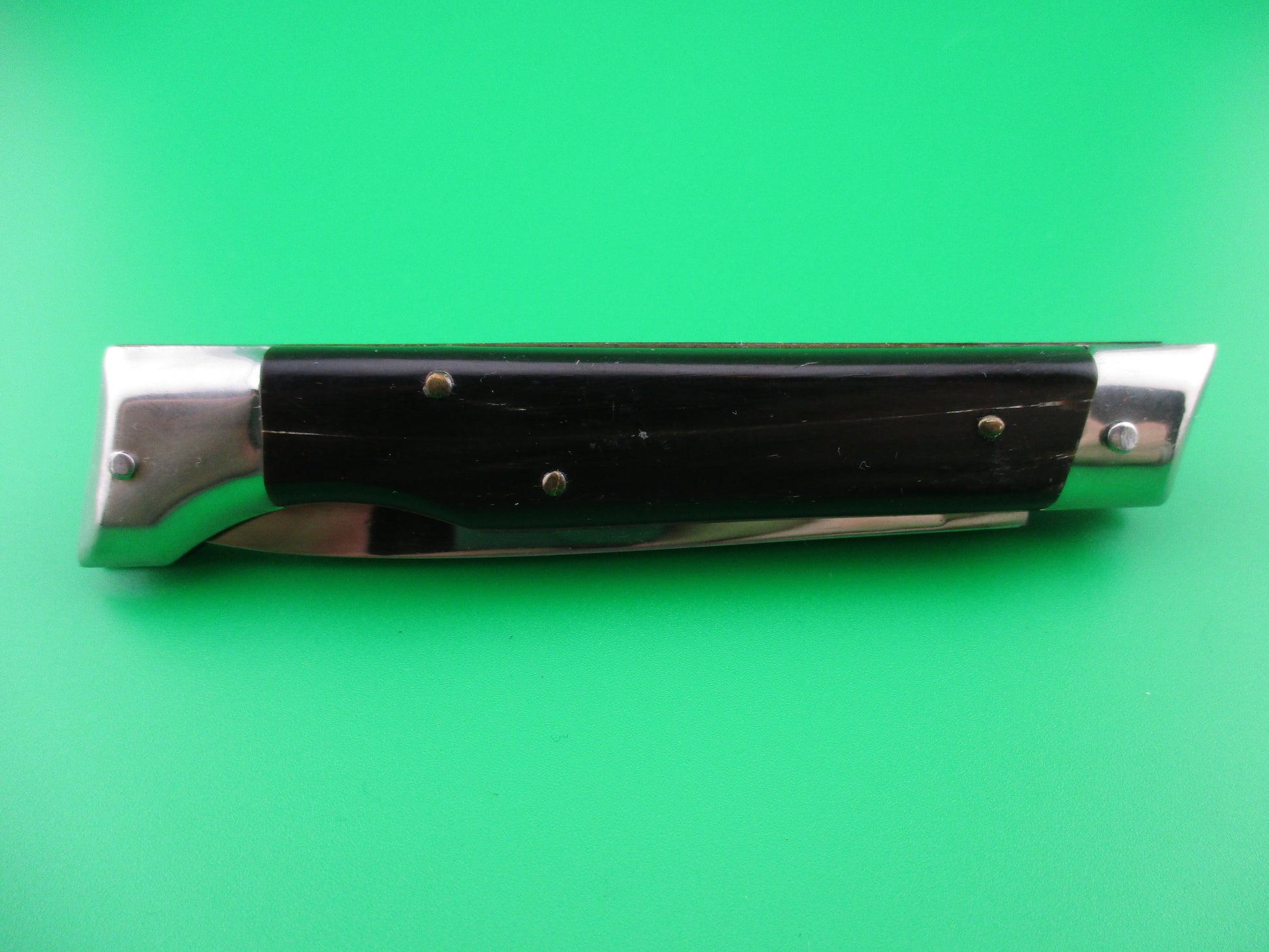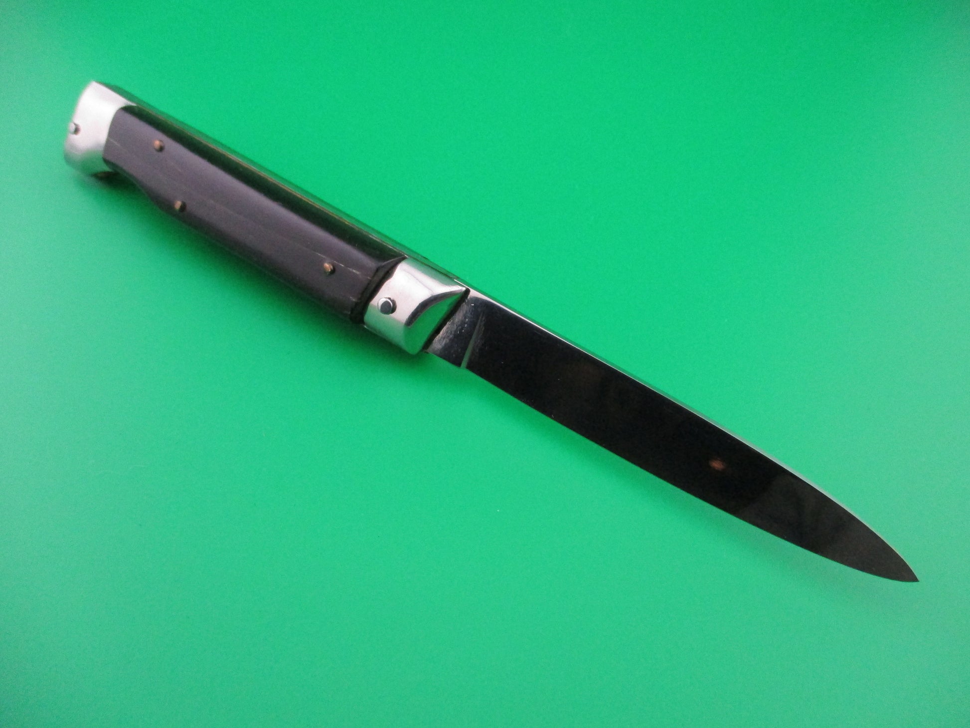 Italian 20cm INOX Vintage Slant Bolster automatic knife. I believe these are from the 1970s and are BoBc (Button open, Button close) knives. This one measures 20cm (7.75 inches) open with brass liners and nickel silver bolsters and button. The flat grind blade appears to be full with all of the factory finish and is stamped INOX on the tang. This knife works great with the blade tip seating deep in the well closed, strong snap and tight lockup. The safety works. EX+ vintage Italian slant bolster automatic knife.