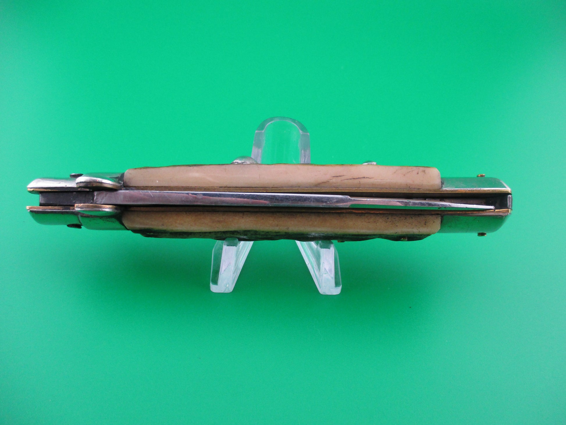 Nice old Italian BoBc stiletto switchblade marked Rostfrei PATENT. The knife measures a little under 22cm (8 5/8 inches) open with brass liners and nickel silver bolsters, button and safety cap. The flat grind swedge blade is nearly full with most of the original factory finish and is marked Rostfrei diagonally (slant) on the tang and PATENT on the rear with lots of light scratches from use/sharpening. The scales are nice thick stag and are in good condition with a couple cracks that you can see on the front scale through two pins. This BoBc (button to open, button to close) knife works great with the blade tip sitting below the liners when closed, good snap and good lockup. Safety works well. Very nice old Italian Stag stiletto automatic knife from the 1960s, or 70s.