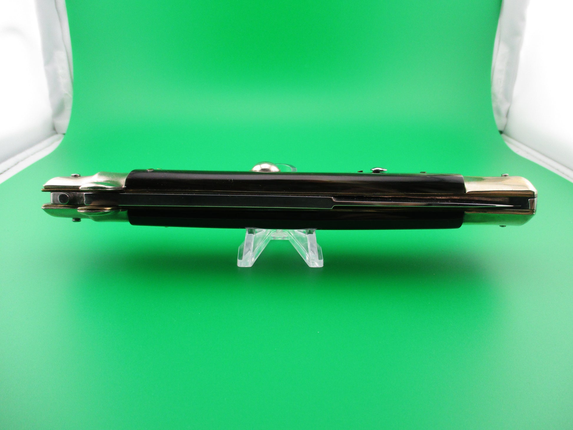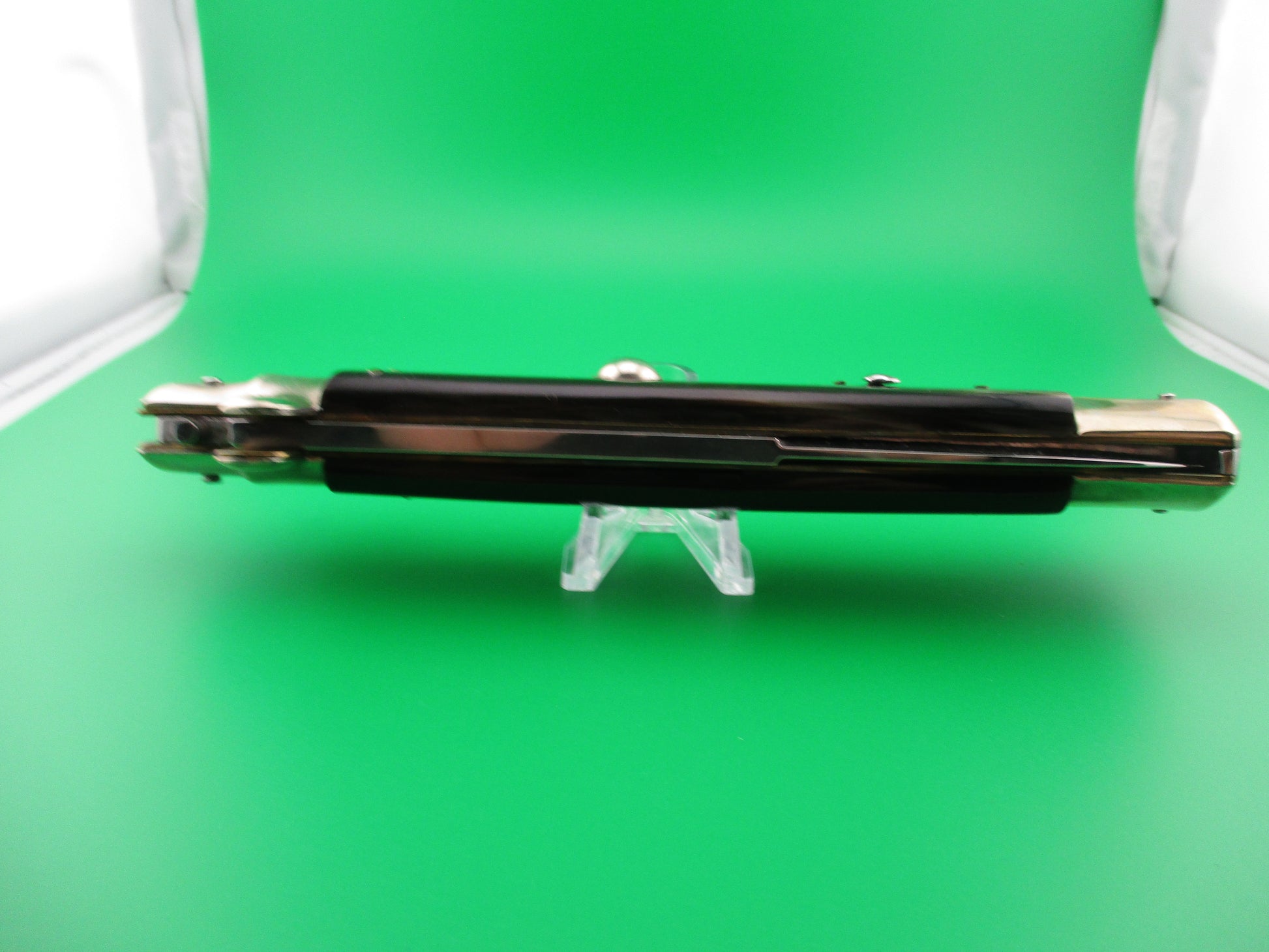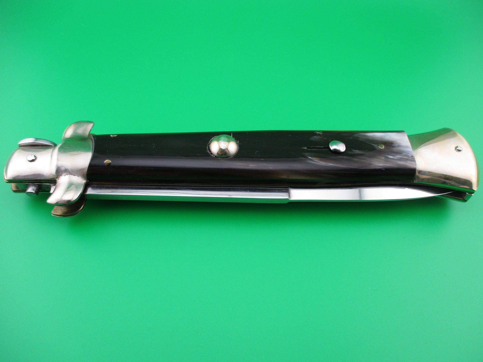 This Beautiful Italian switchblade measures 37cm (15 inches) open and the blade is marked ROSTFREI ITALY. The liners are brass with nickel silver bolsters and button. The bayonet style blade is full with original factory finish. This is a swivel bolster knife so you push down on the front right finger guard to swivel/pivot the bolster to release the blade to be closed. The scales are horn and are mostly black with a little streaking on the lower front scale. The knife works great with the blade tip seating deep, strong snap and tight lockup open. Safety works. Though it came to me in a two piece AGA Campolin box I don't think it was sold by AGA Campolin. Although it looks like new I suspect it's from the 1980s and likely made by the middle Angelo Campolin and is just in a newer Campolin box, but I'm not sure. Either way it's a Gorgeous handful of Italian automatic steel and horn!