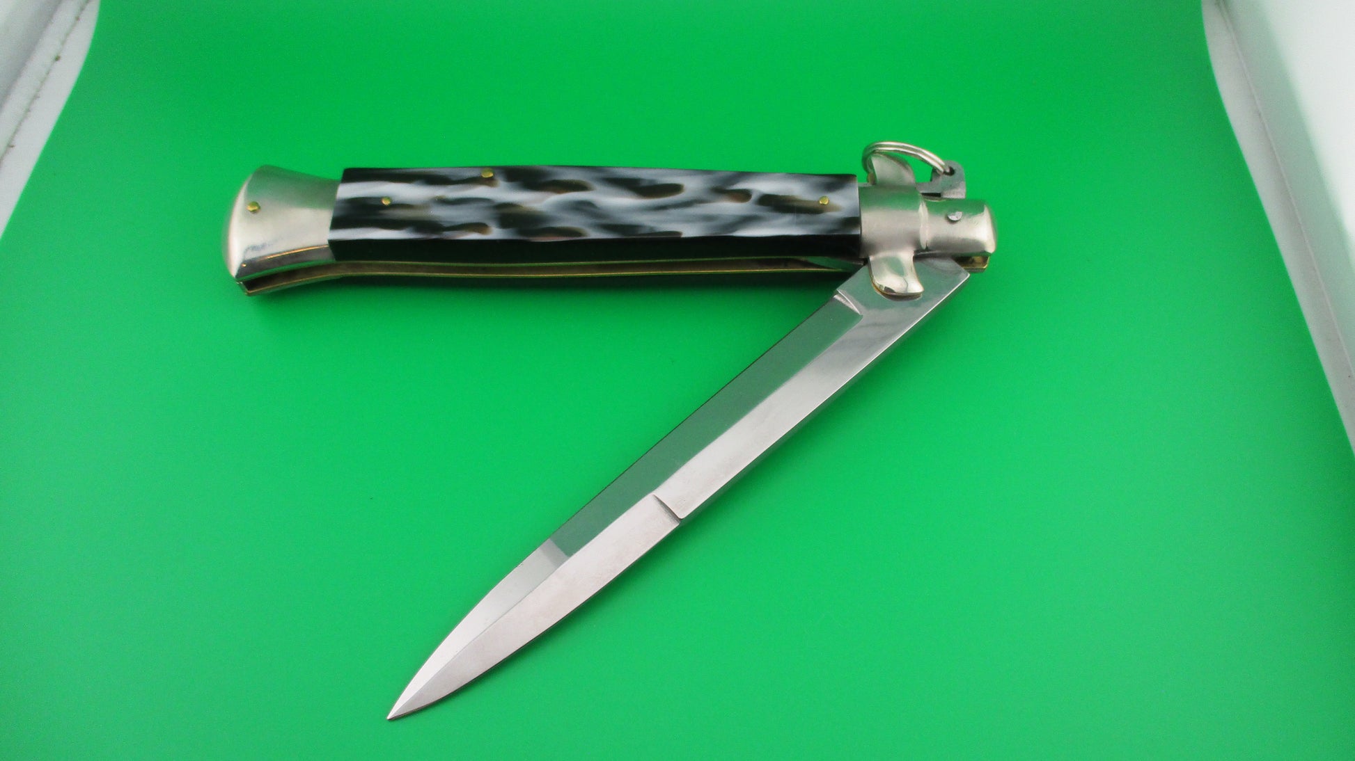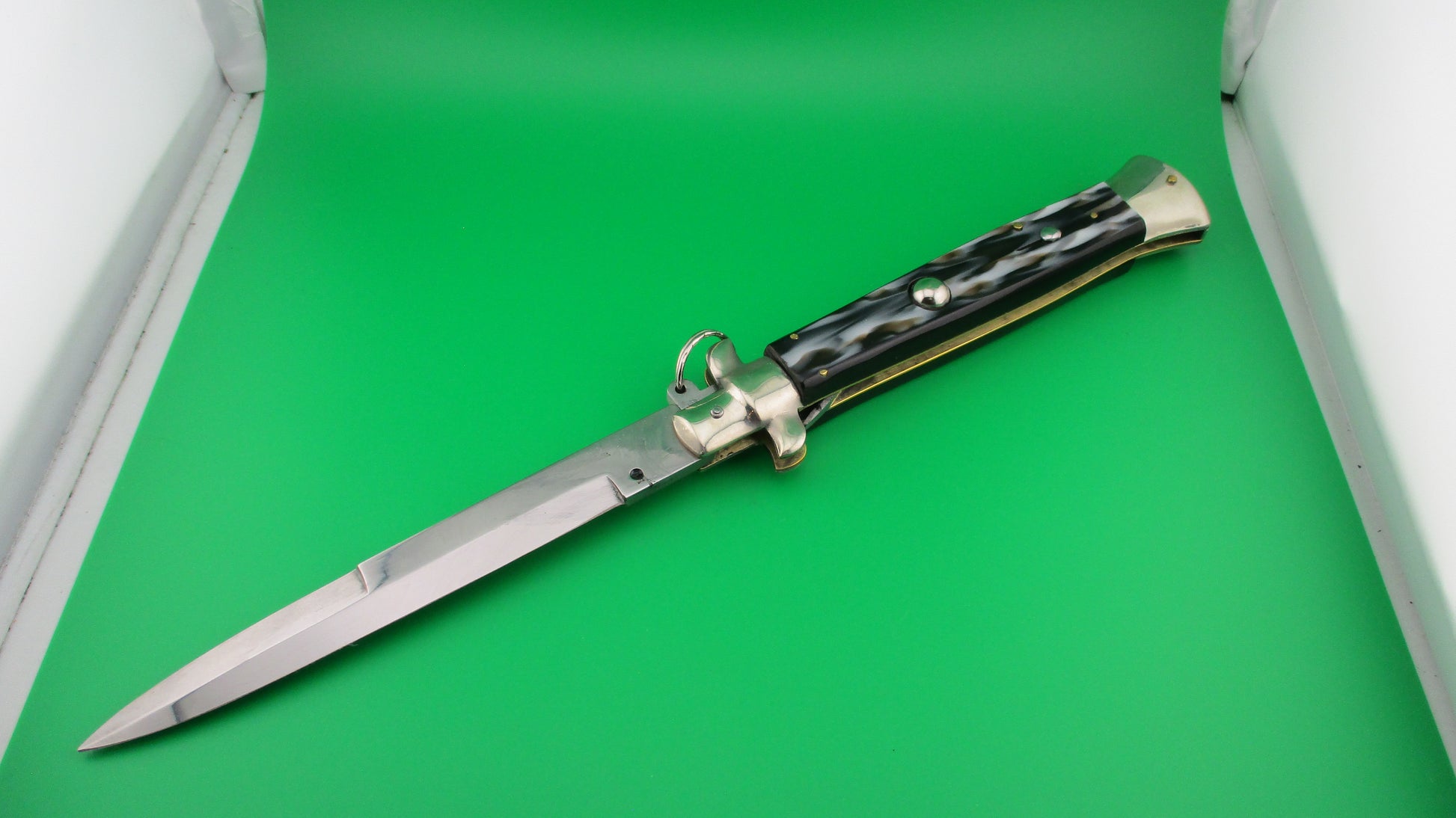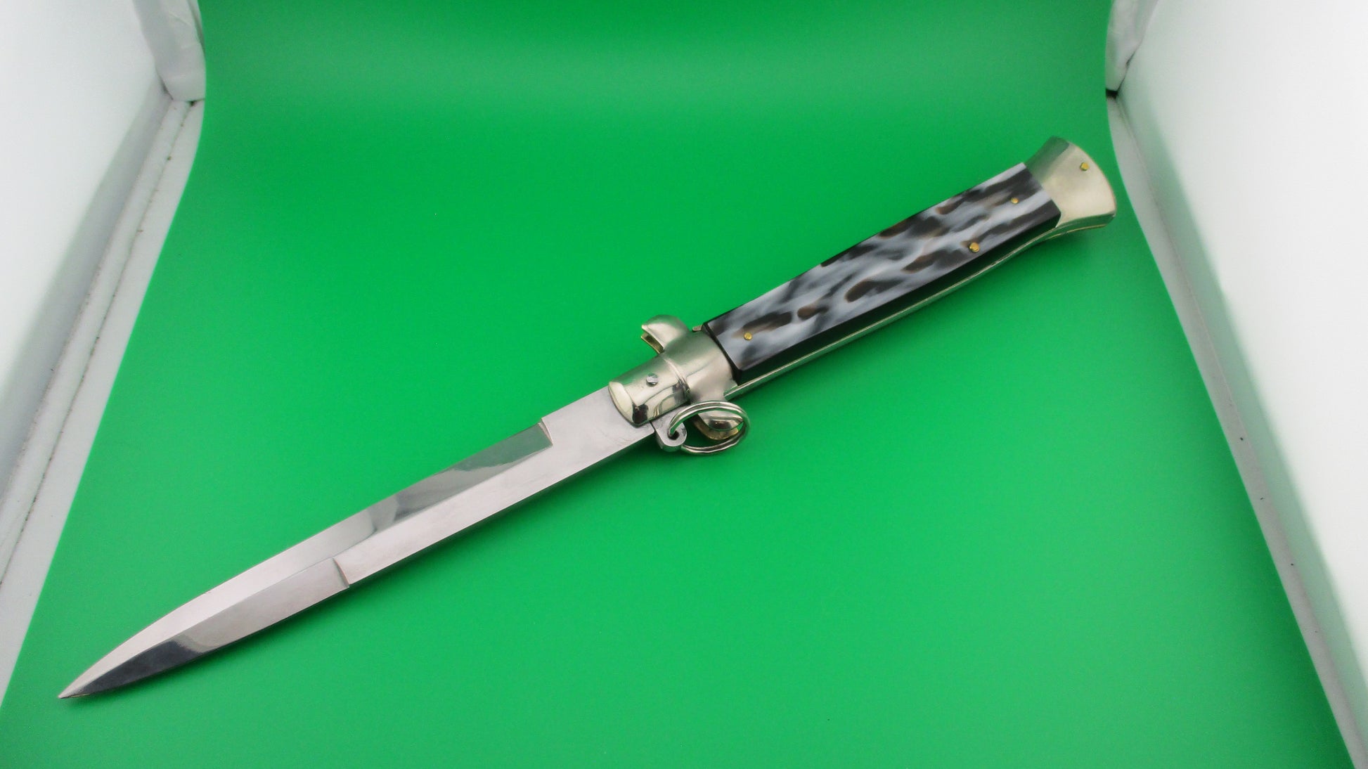 Italian 38cm Ring pull Stiletto automatic knife vintage Imitation horn. This knife was likely made in the 1980s by Falcon (Angelo Campolin II) and measures 37.5cm (14.75 inches) open with D stamped brass liners, nickel silver bolsters & button and steel ring pull and safety cap. The bayonet blade is full with factory finish and is sterile, with no markings on either side of the blade. The scales (handles) are synthetic Imitation horn with colors including black, white and brown and are in excellent condition and very attractive! The knife works like new with tip deep and centered in the well, strong snap and TIGHT lockup! It is made in with characteristics from the 1950s & 60s. Safety works. EX+ condition