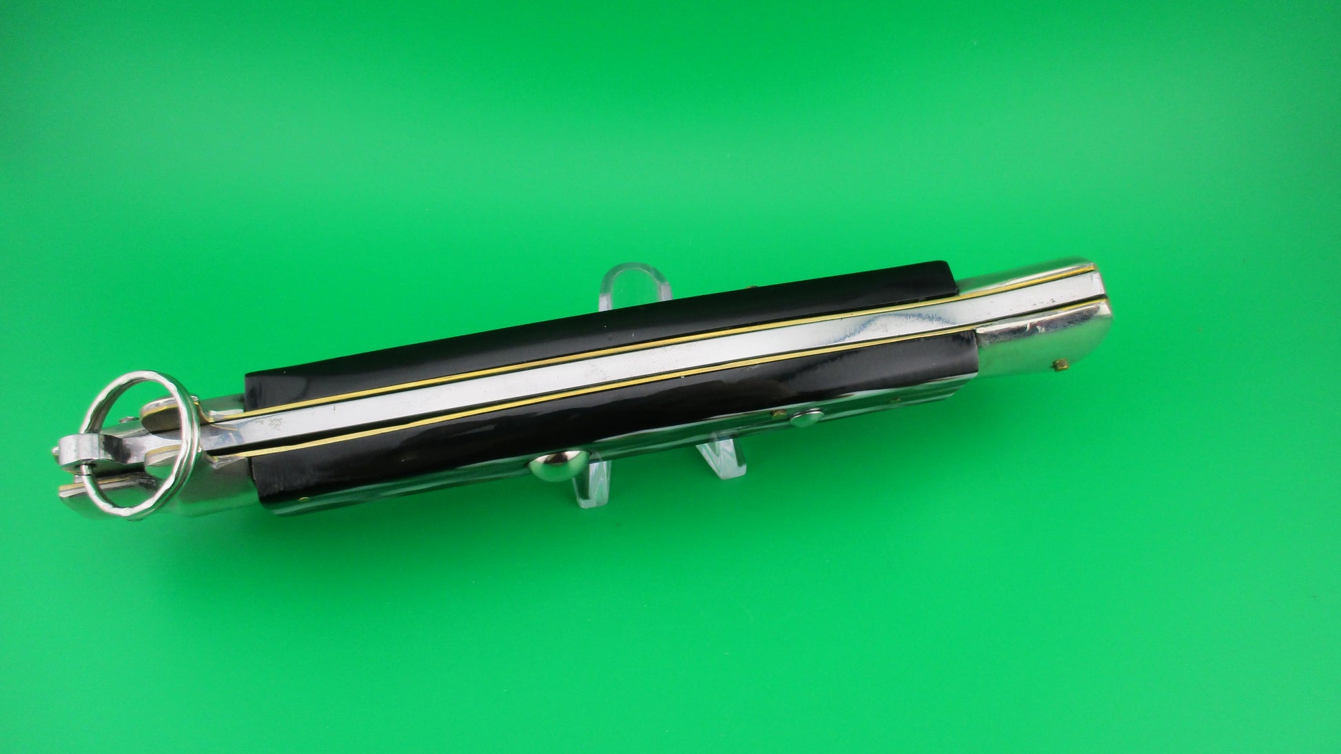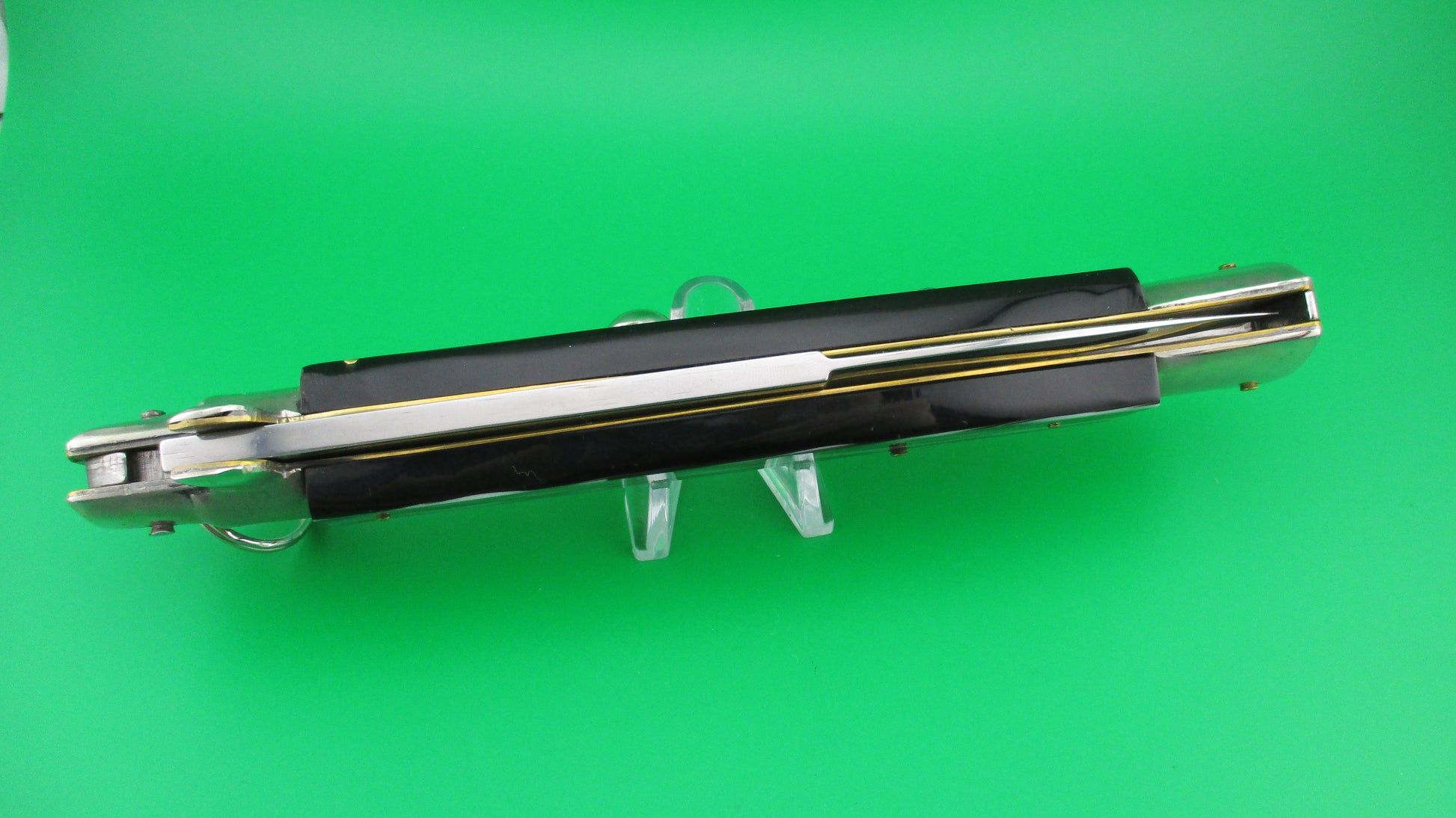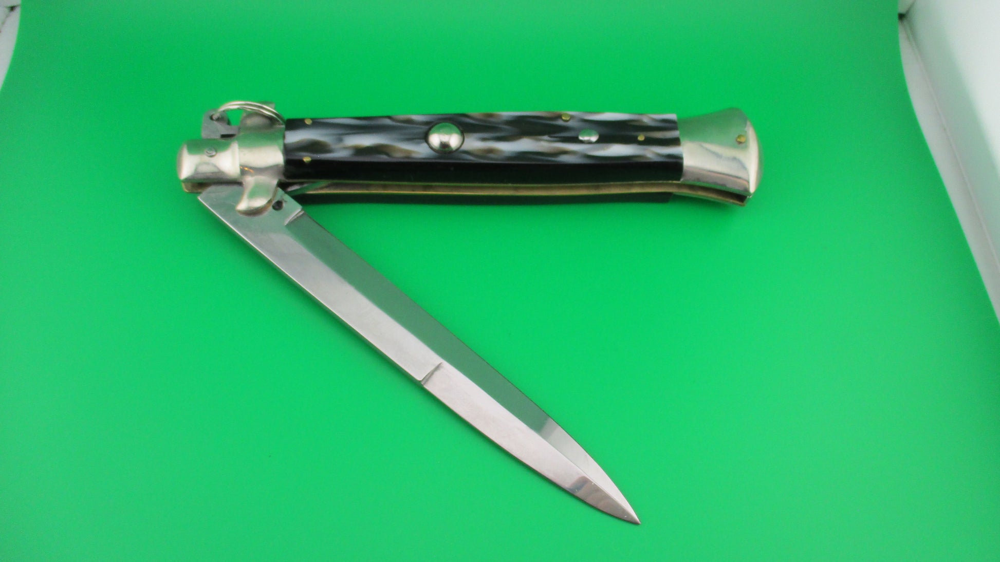 Italian 38cm Ring pull Stiletto automatic knife vintage Imitation horn. This knife was likely made in the 1980s by Falcon (Angelo Campolin II) and measures 37.5cm (14.75 inches) open with D stamped brass liners, nickel silver bolsters & button and steel ring pull and safety cap. The bayonet blade is full with factory finish and is sterile, with no markings on either side of the blade. The scales (handles) are synthetic Imitation horn with colors including black, white and brown and are in excellent condition and very attractive! The knife works like new with tip deep and centered in the well, strong snap and TIGHT lockup! It is made in with characteristics from the 1950s & 60s. Safety works. EX+ condition