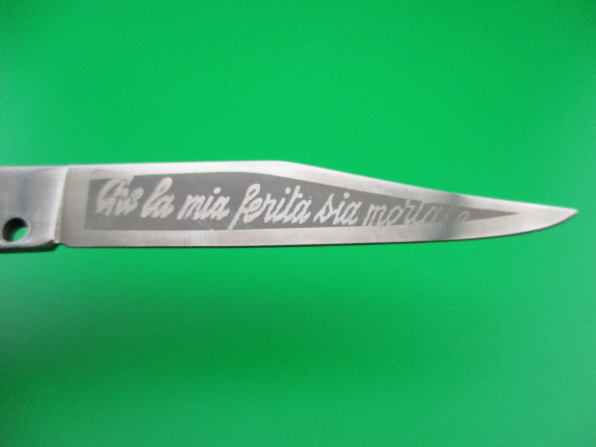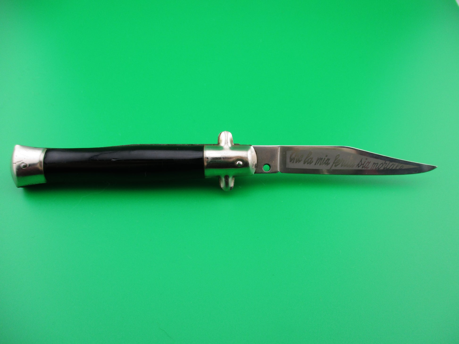 Very interesting Italian switchblade with writing on the blade that says Vendetta Corsa on the front and "Che la mia ferita sia mortale:, which translates to: "may all your wounds be mortal" roughly. There are many variations of Italian Vendetta Corsa switchblades in various shapes and sizes. This is the smallest one I've had measuring under 18cm (7 inches) open with steel liners and hollow scales/bolsters. The black scales have an emblem with a Corsican Moors Head and the word Corsica. The blade is full and very nice. The knife works great with the blade tip seating deep, good snap and tight lockup open. Safety works.
