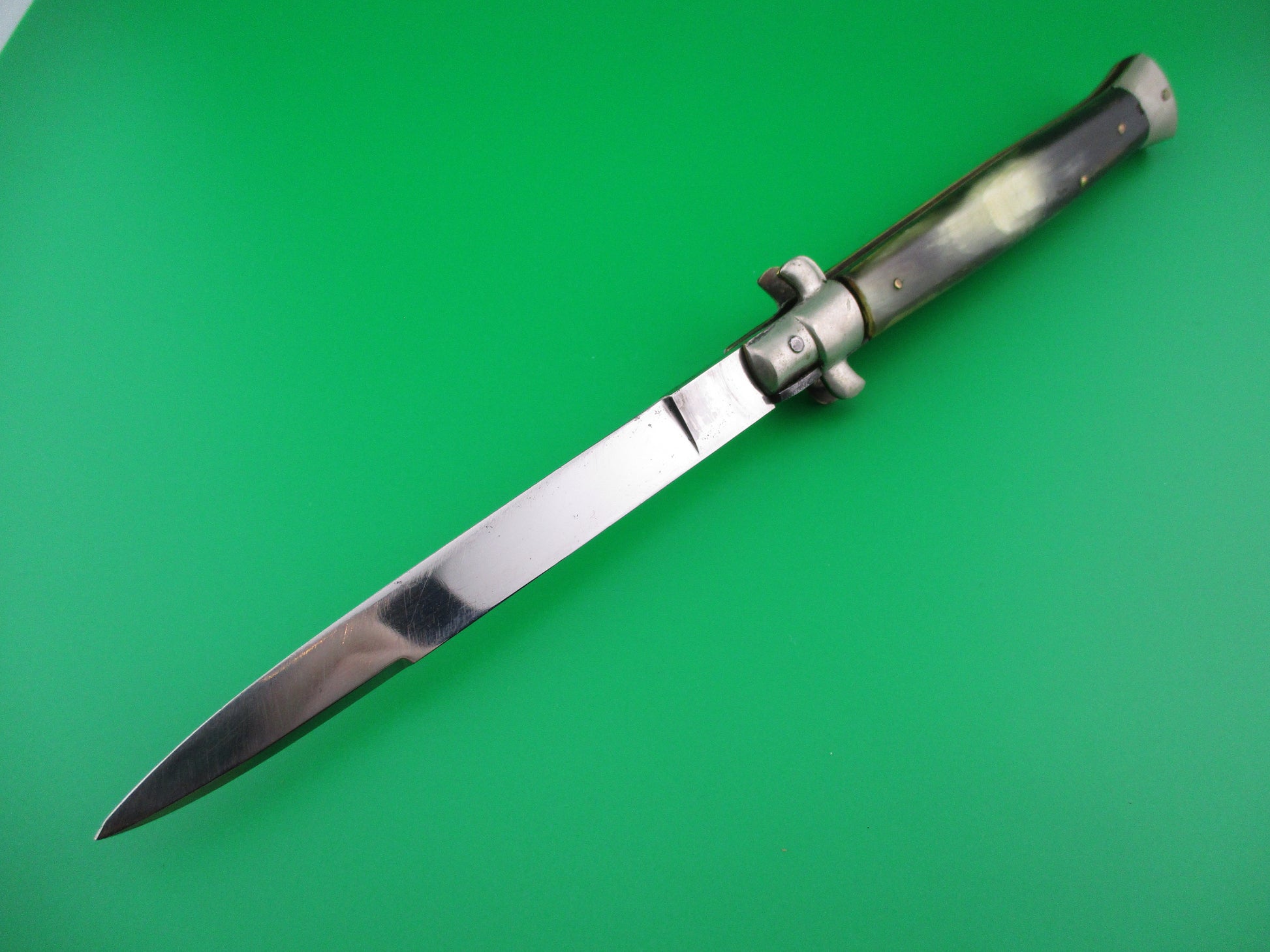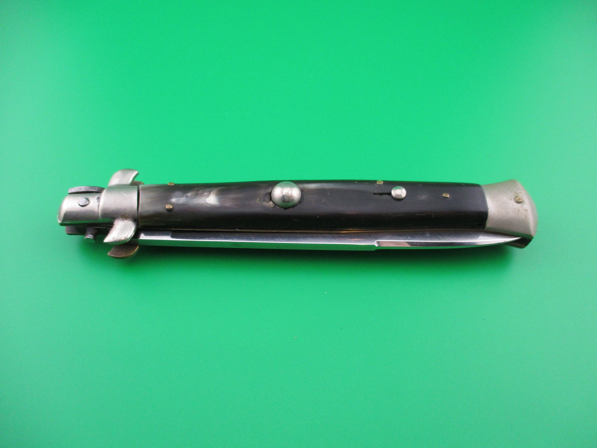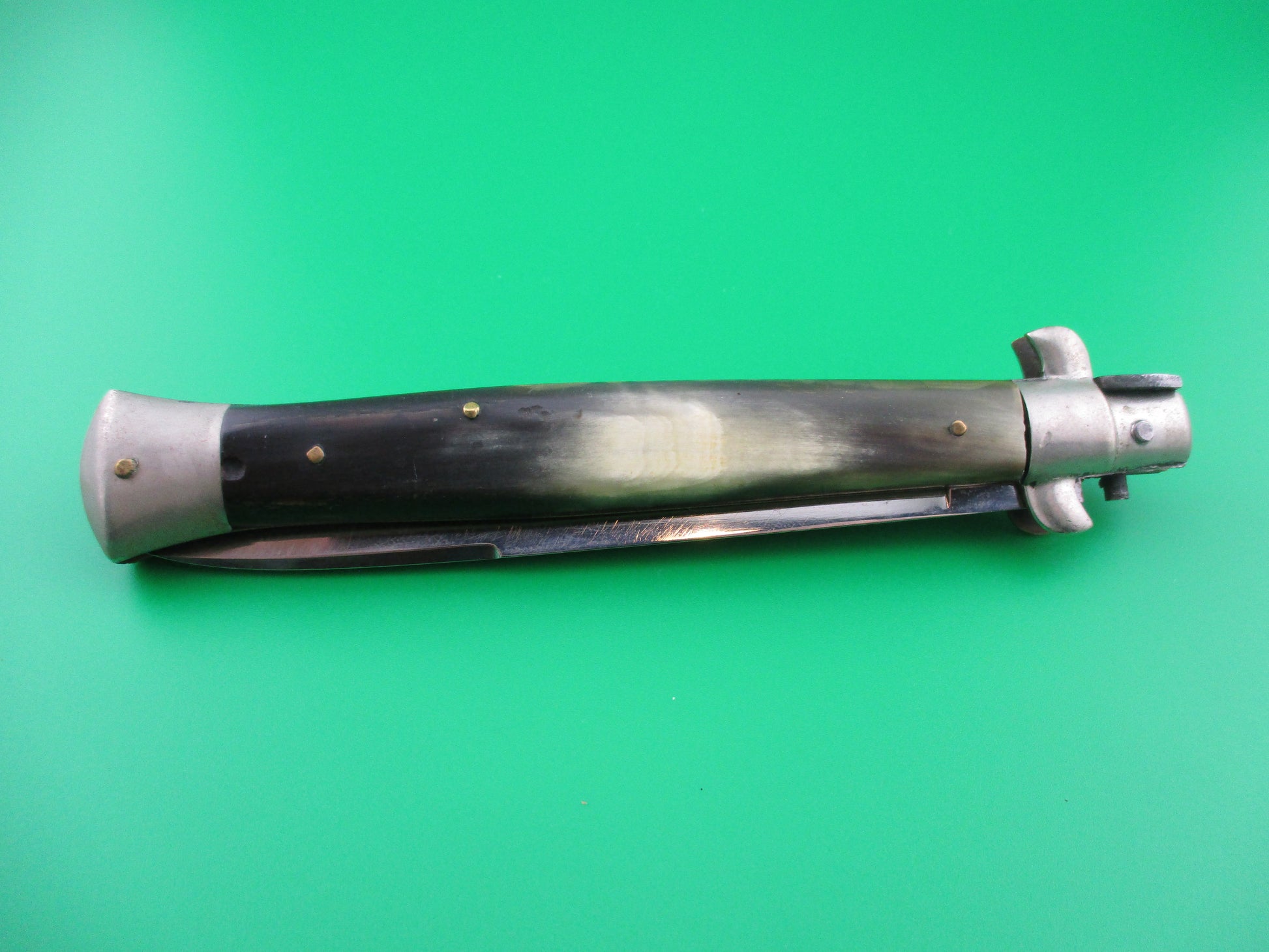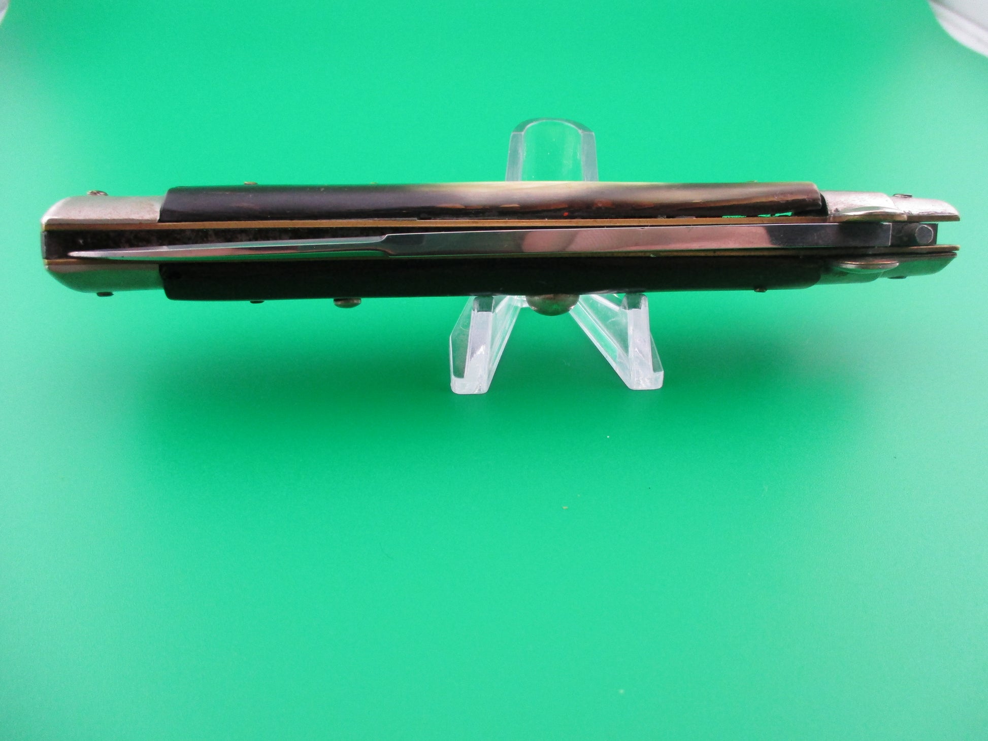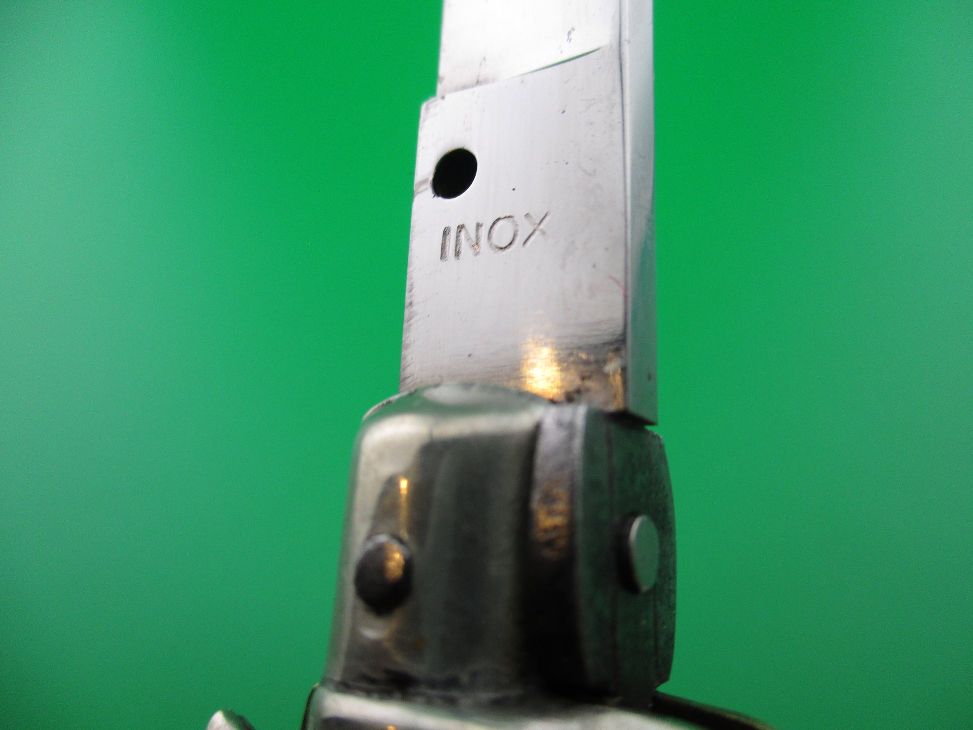 Nice old Italian transitional stiletto switchblade marked INOX. The knife measures a little under 28cm (11 inches) open with D stamped brass liners and nickel silver bolsters, safety cap and button. The flat grind swedge blade is nearly full with original factory finish and is marked INOX. The scales are dark horn with some green & cream and are in good condition with one small bug near the button. This swivel bolster knife works great with the blade tip sitting below the liners when closed, good snap and good lockup. Very nice old INOX transitional stiletto automatic knife from the 1960s, or 70s. Safety works. EX condition.