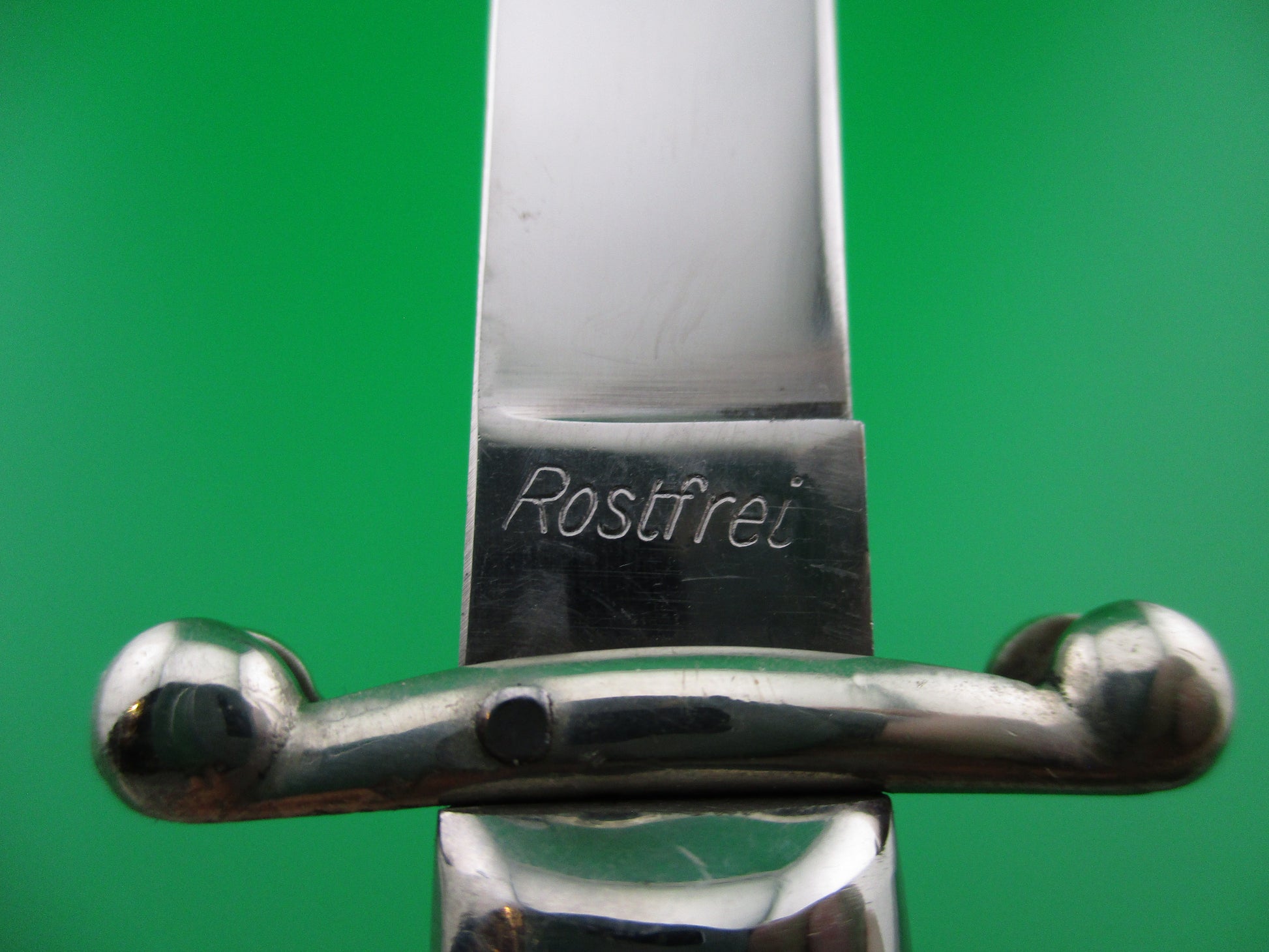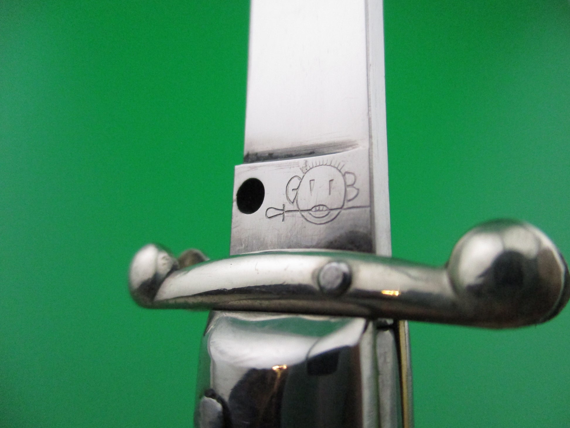 Nice old Italian swing guard with stag scales with Gustav Brenner stamp of head holding knife in teeth with G & B for ears. The knife measures 20.5cm (8 inches) open and has brass liners and nickel silver bolsters, guards, button and safety cap. The spear point blade is 100% full with all of the original factory finish with a few very light scratches and is stamped Rostfrei on the rear ricasso (tang). The gnarly stag scales are in Great condition with no cracks or chips and great Aged look. The knife works great with blade tip below liners when closed, STRONG snap and good lockup. Safety works. Super nice example of one of the smaller vintage Italian stag swingers with a special stamp. The Gustav Brenner knives were made to a little higher standard than comparable Italian switchblades in the day.