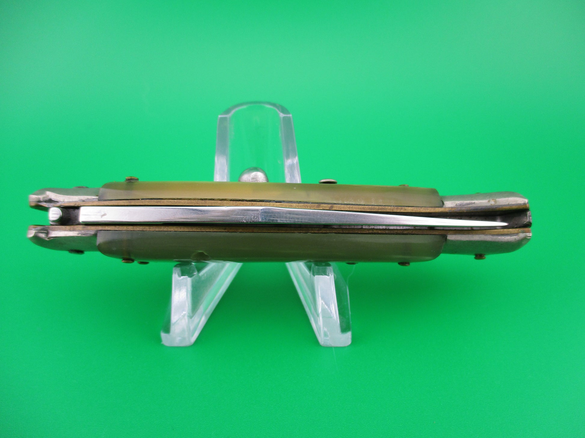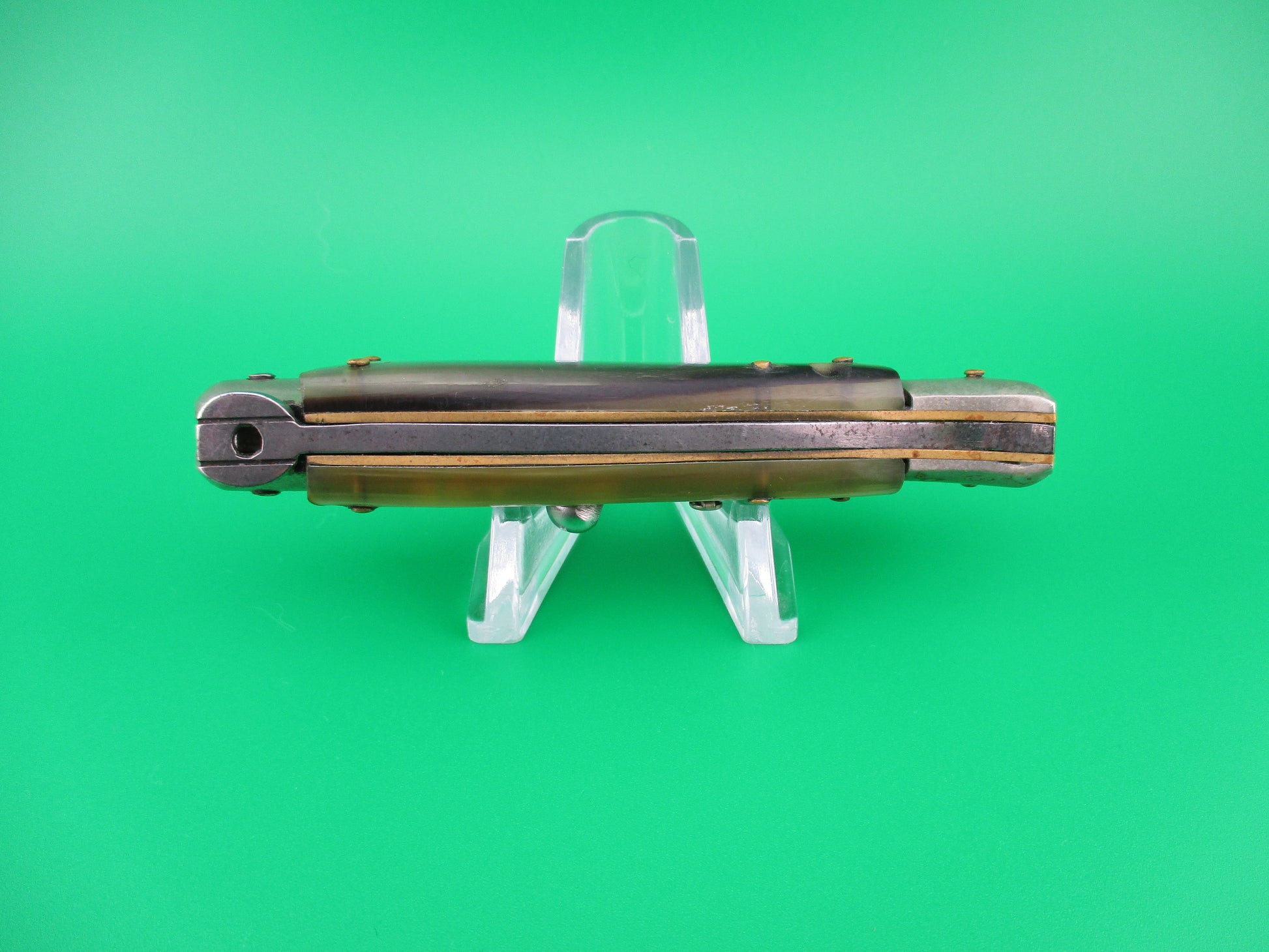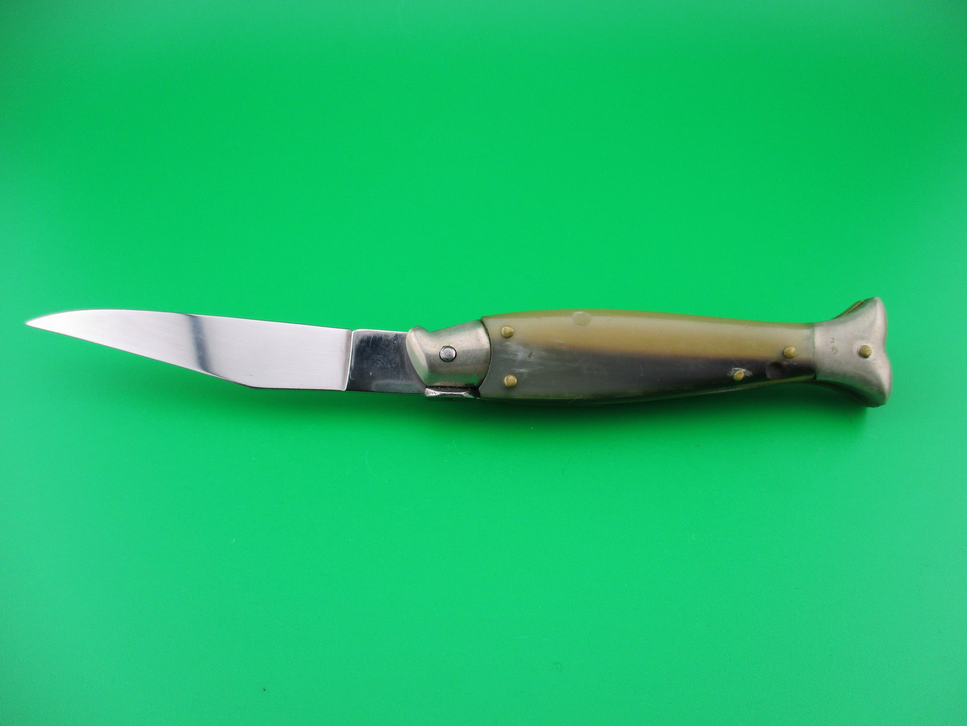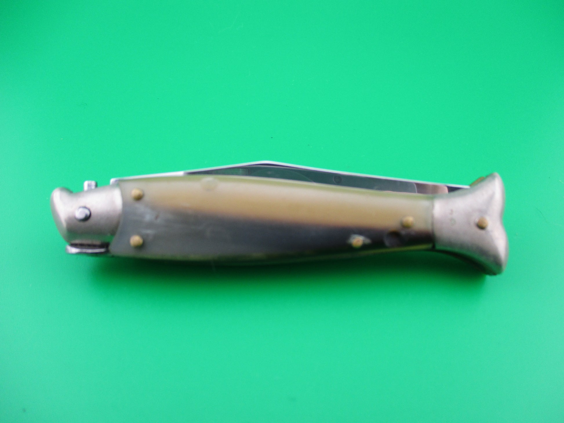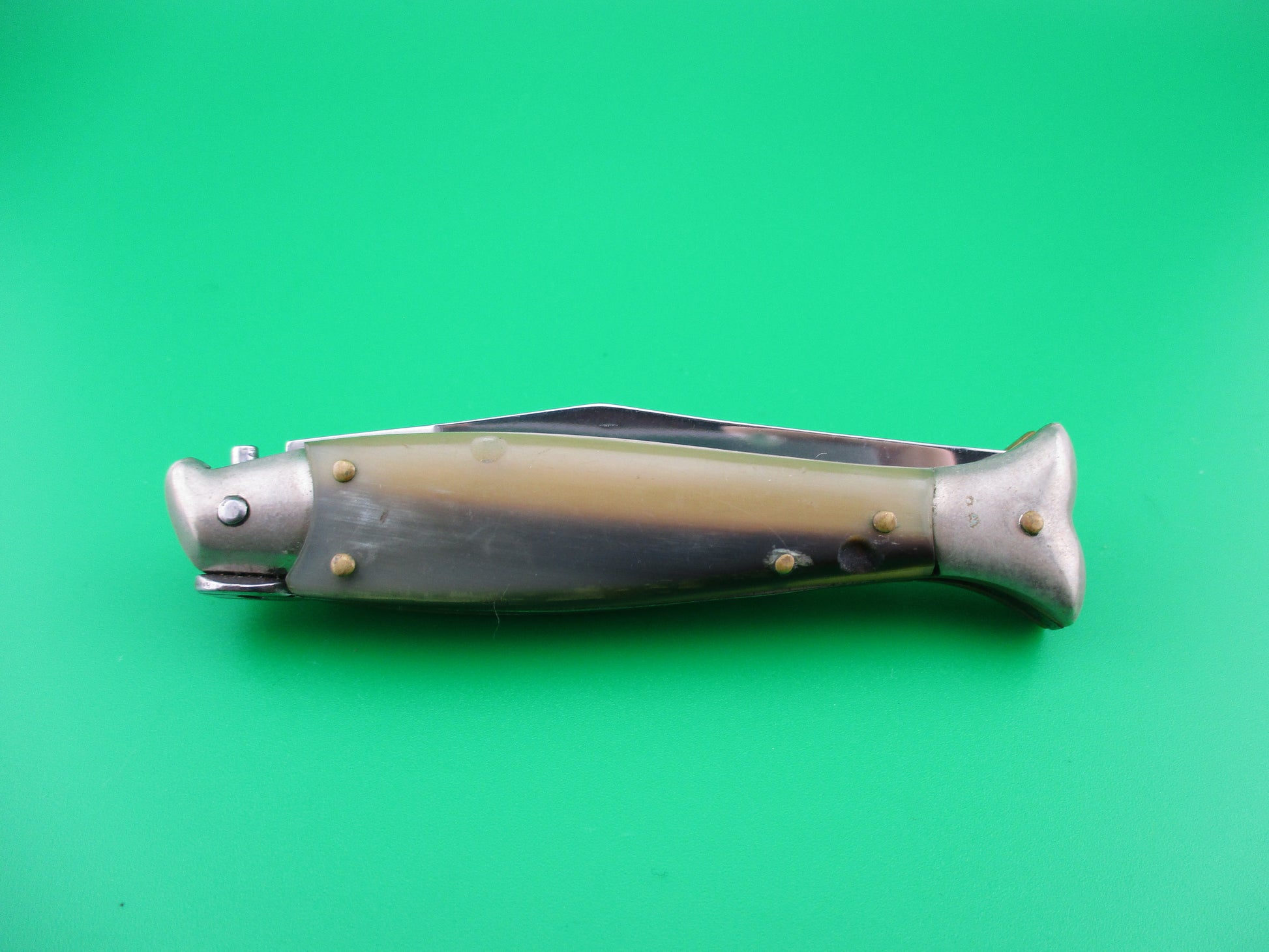 ITALY 16cm Italian Fishtail picklock vintage automatic knife most likely made in the 1980s. The knife measures 16cm (6.25 inches) open with brass liners and nickel silver bolsters, button and safety cap. The blade is full and retains all of the original factory finish. The horn scales (handles) are light colored and very attractive with one small bug bite in the back scale near the bottom (back). The knife works great with blade tip below liners closed, strong snap and TIGHT lockup when open. Safety works. EX+ condition.