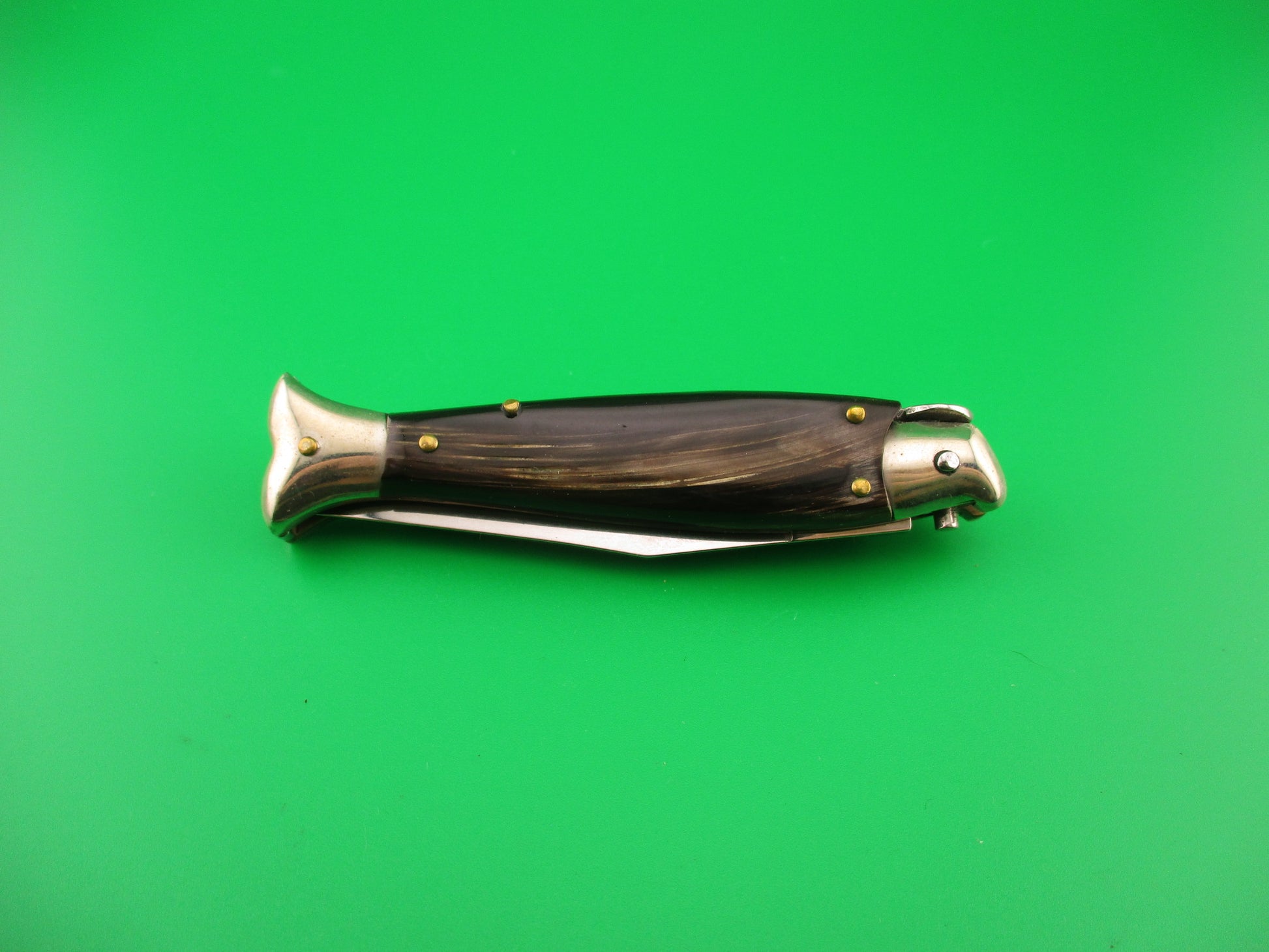 ITALY 16cm Italian Fishtail picklock vintage automatic knife most likely made in the 1980s. The knife measures just under 16cm (6.25 inches) open and 3.5 inches closed with brass liners and nickel silver bolsters, button and safety cap. The long clip blade is full and retains all of the original factory finish and the ricasso is stamped ITALY. The horn scales (handles) are mostly black with brown streaks and very attractive. The knife works great with blade tip below liners closed, strong snap and excellent lockup when open. Does not rattle if shaken with blade open. Safety works. EX+ condition.