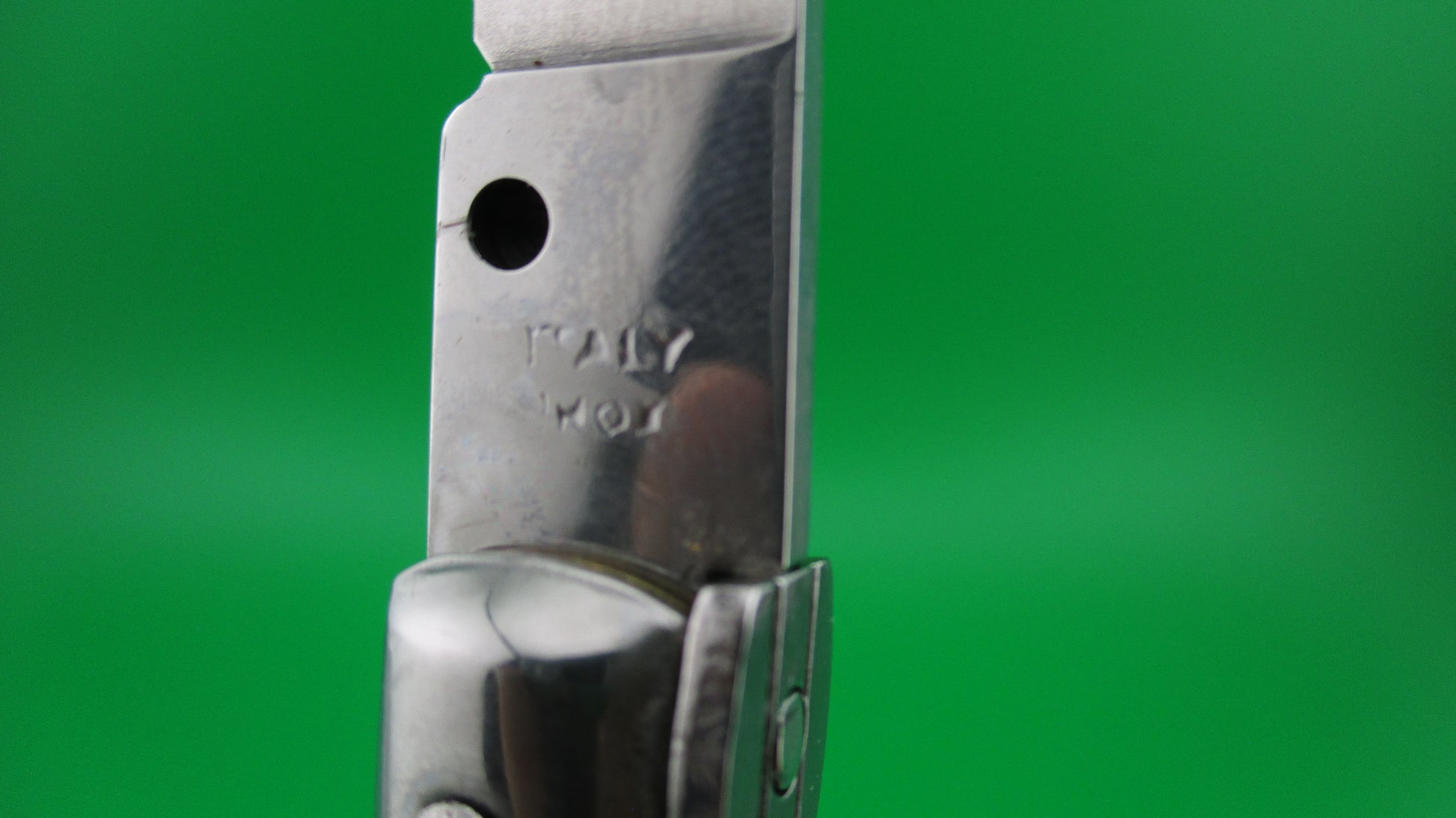 ITALY INOX 22cm Italian Stiletto Swivel bolster vintage automatic knife, most likely made in the 1990s. It measures 22.2cm (8 3/4 inches) open with brass liners & pins steel bolsters, button & safety. The flat grind blade is full with original factory finish and stamped ITALY INOX on the ricasso with some light scratches. Genuine Stag scales are in very nice condition. The knife works like new with blade tip below the liners closed, strong snap and TIGHT lockup open! Safety works. Nearly new condition.