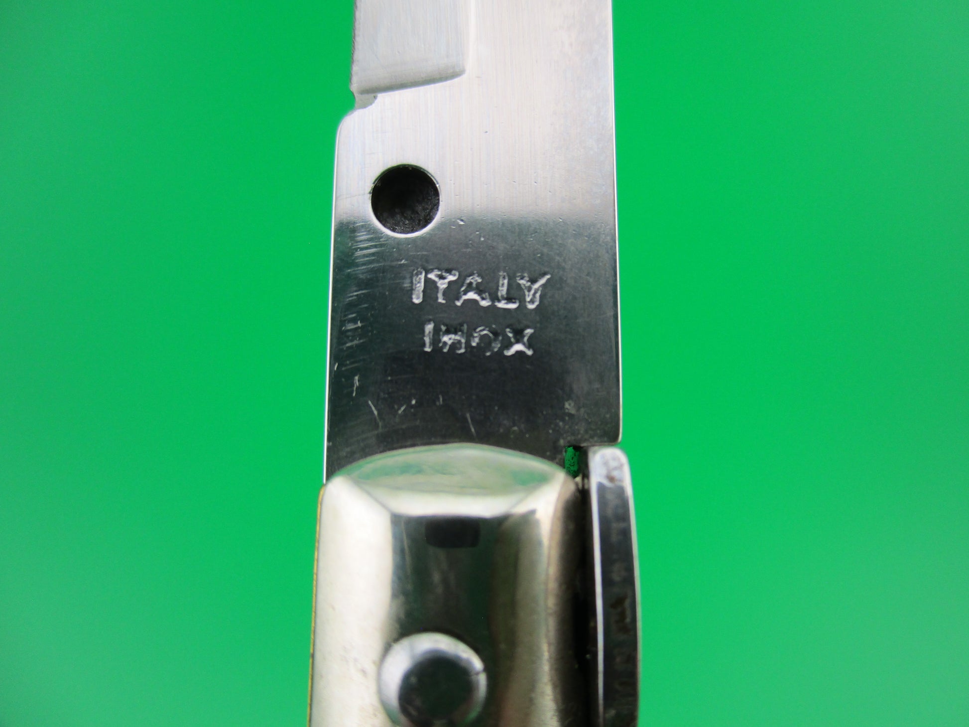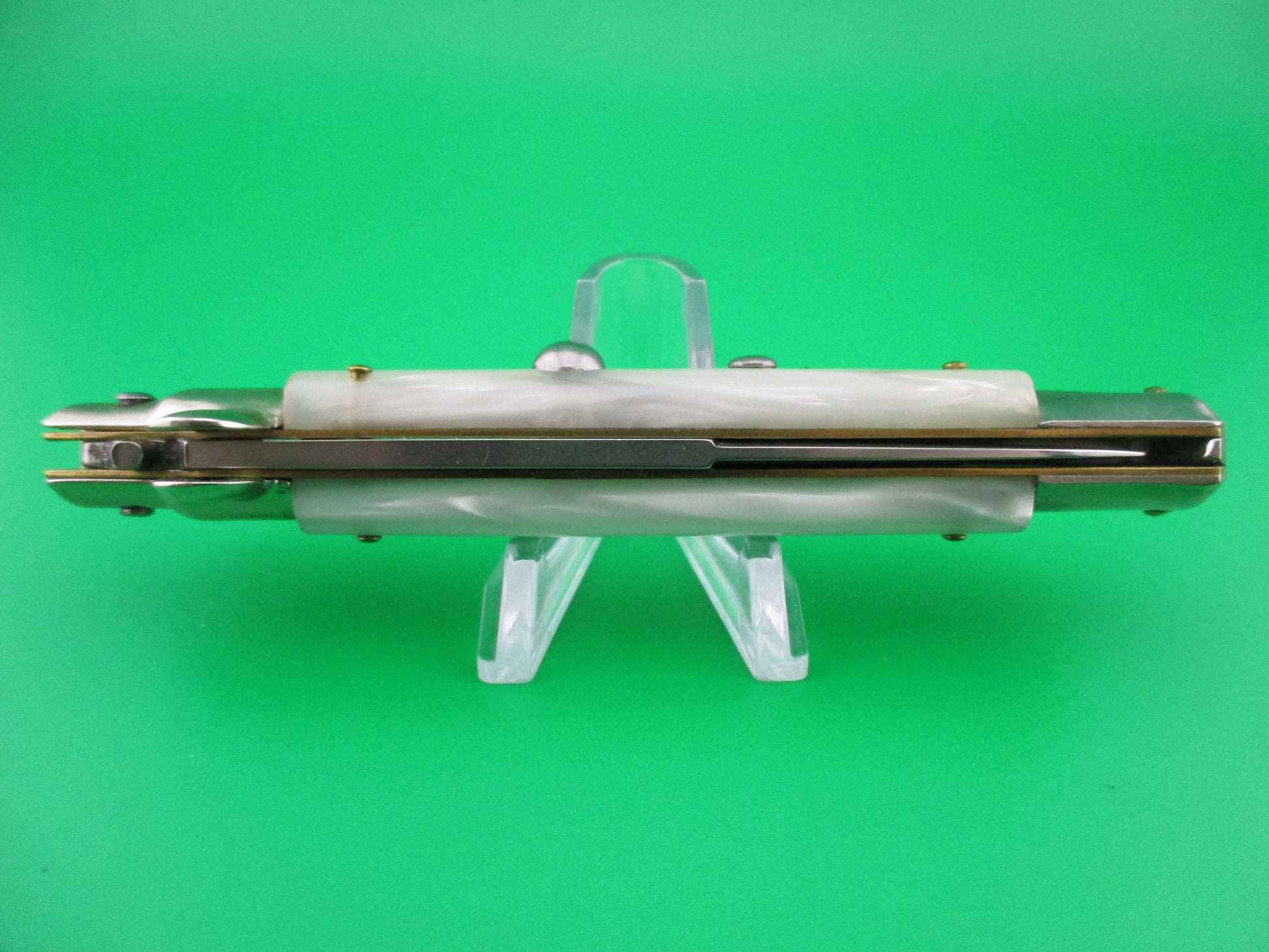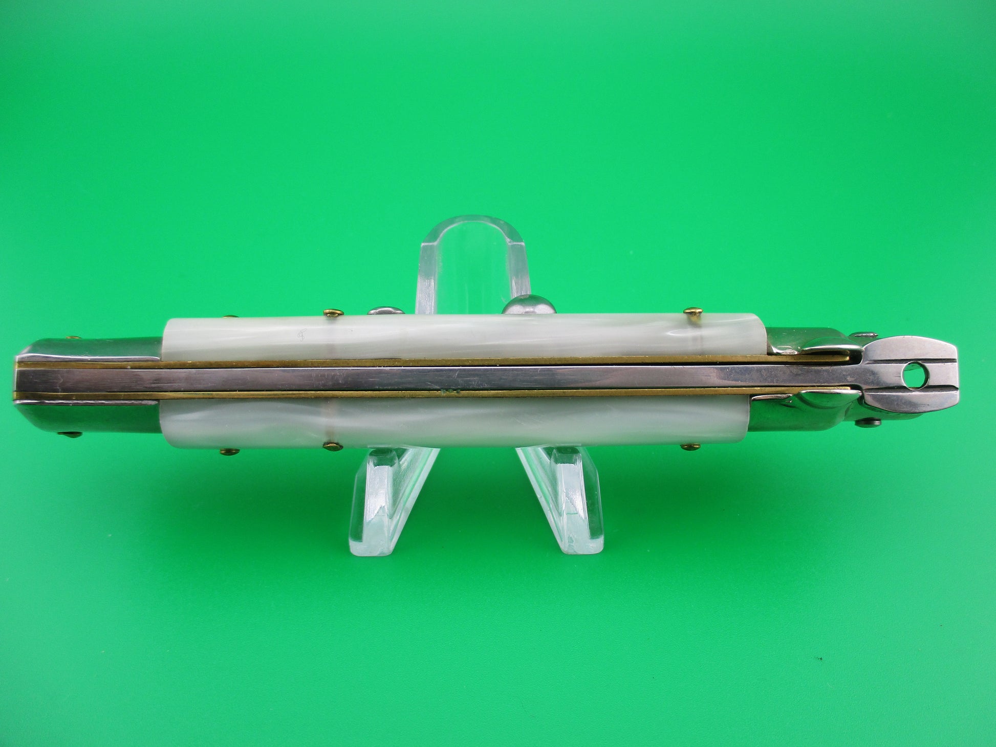 ITALY INOX 22cm Stiletto Pearlex Bayonet blade automatic knife. I believe this one is from the 1980s and it measures 12.5cm closed and a little over 22cm (8 3/4") open with brass liners and stainless steel bolsters, button and safety cap. The bayonet style blade is 100% full with original factory finish. The Pearlex scales are very attractive and in great condition. The knife works great with blade tip seating deep closed, good snap and tight lockup open. Safety works perfectly. EX++ condition.