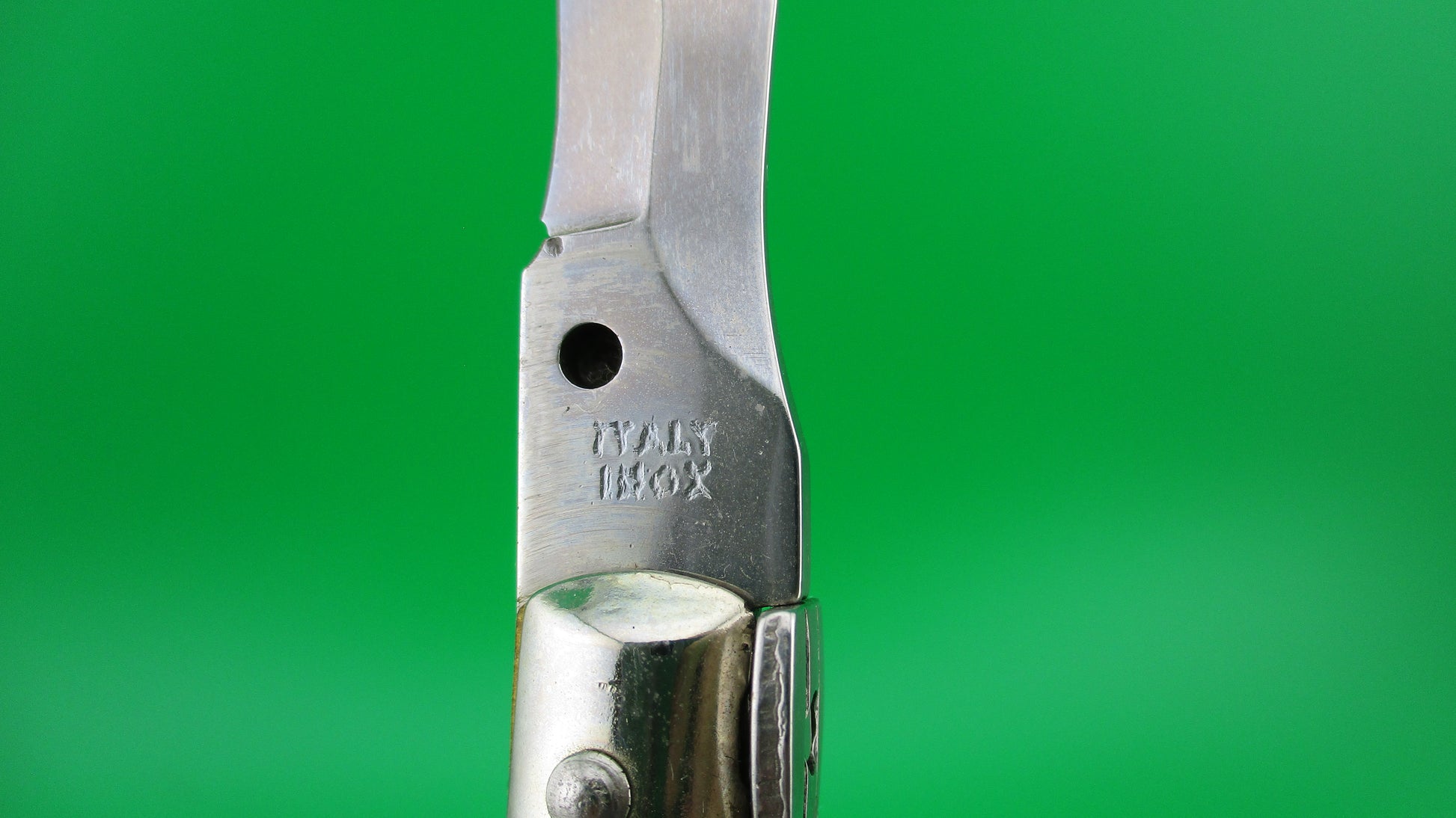 Vintage ITALY INOX 28cm Italian Stiletto KRIS black & gray swirl switchblade knife from 1980s or 90s. It measures 27.6cm (10 7/8 inches) open with brass liners and steel bolsters & button with brass safety cap. The KRIS blade is full with factory finish and stamepd ITALY INOX on the ricasso (tang). The synthetic scales are Black smoke (black & gray swirled) and in excellent condition. The knife works great with blade tip deep and centered in the well closed, strong snap and Tight lockup open. Rear Top (front) bolster is a little loose and moves a bit. Safety works. Nearly new condition.