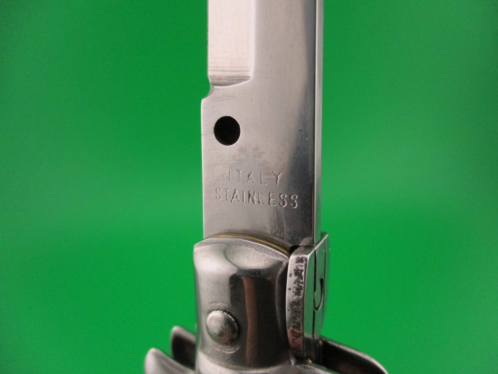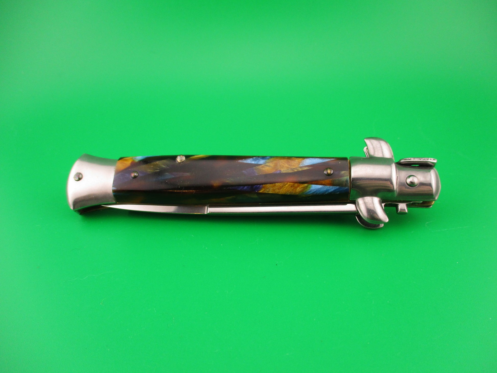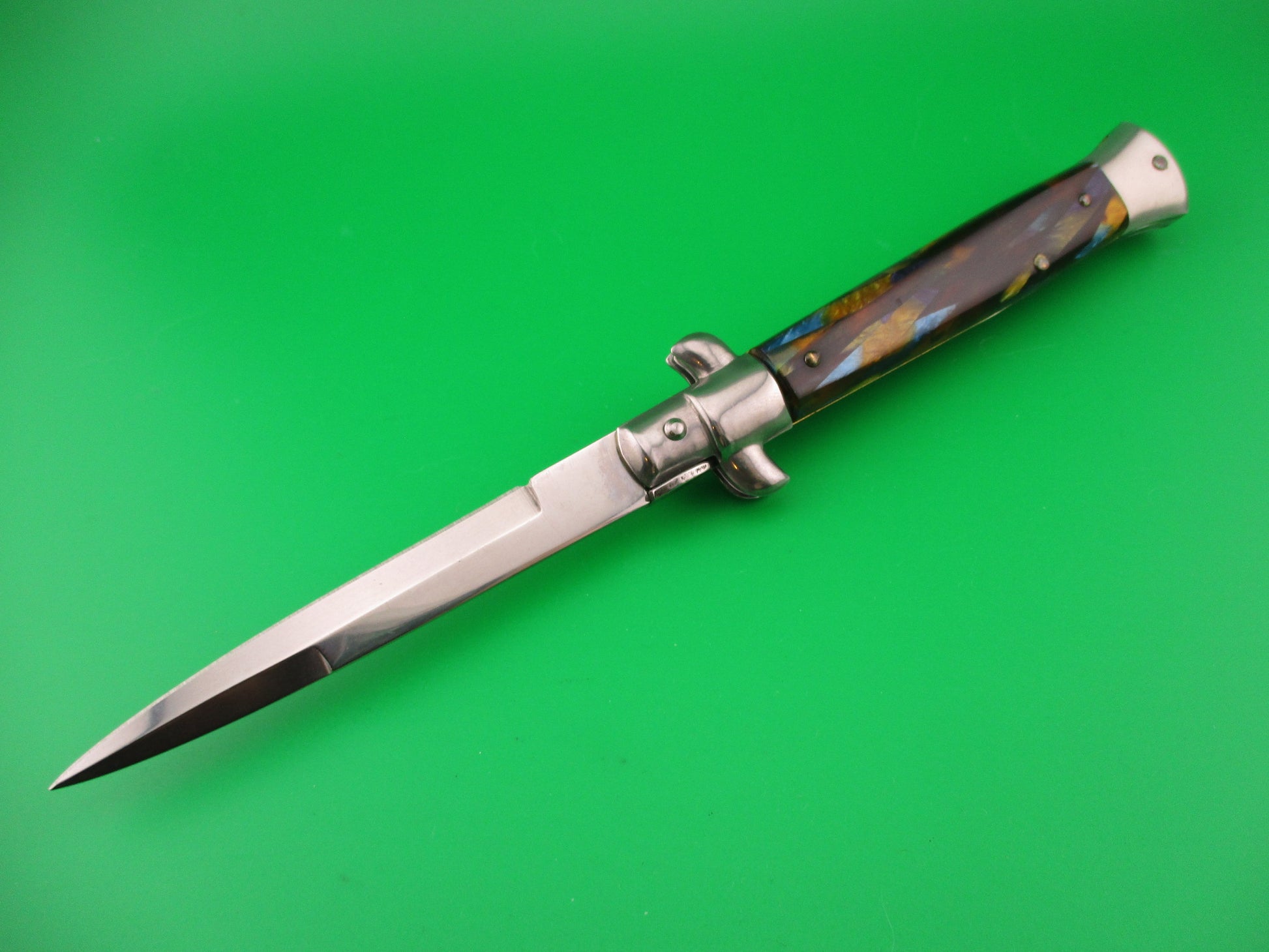 Vintage ITALY STAINLESS 22cm Italian Stiletto wild multi colored synthetic scales automatic knife most likely made in Italy in the 1980s or 90s. The knife measures 22.2cm (8.75 inches) open and 4 15/16 inches closed with brass liners and steel bolsters, button and safety cap. The bayonet grind blade is 100% full and retains original factory finish and is marked ITALY STAINLESS on the ricasso (tang). The multi colored mottled synthetic scales are very attractive and in nice condition with colors including tortoise & blue pearlex. The knife works well with blade tip deep & centered closed, Strong snap and Tight lockup open. Swivel bolster release to close. Safety works. Nearly new condition.