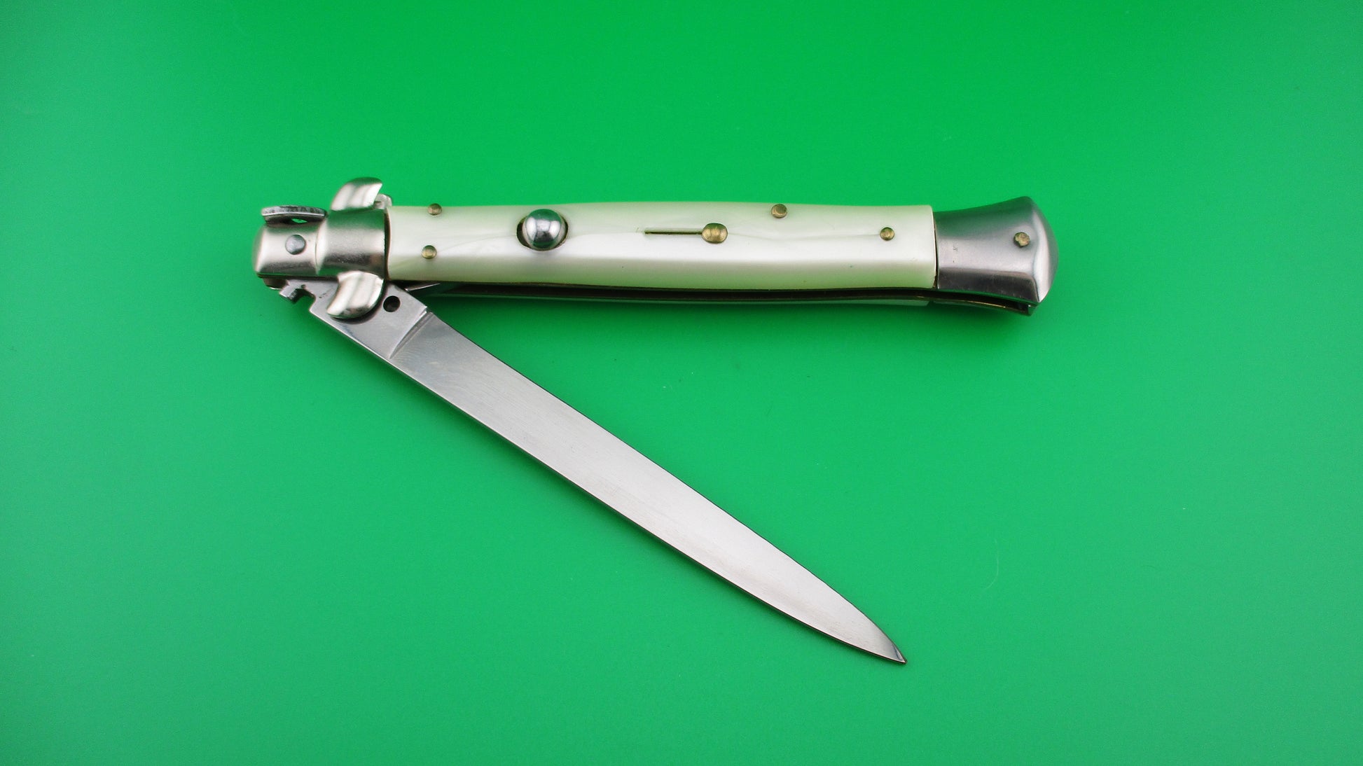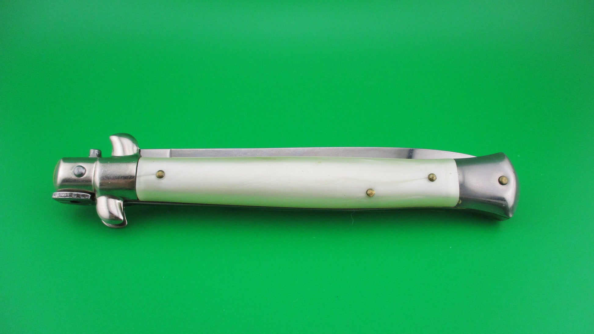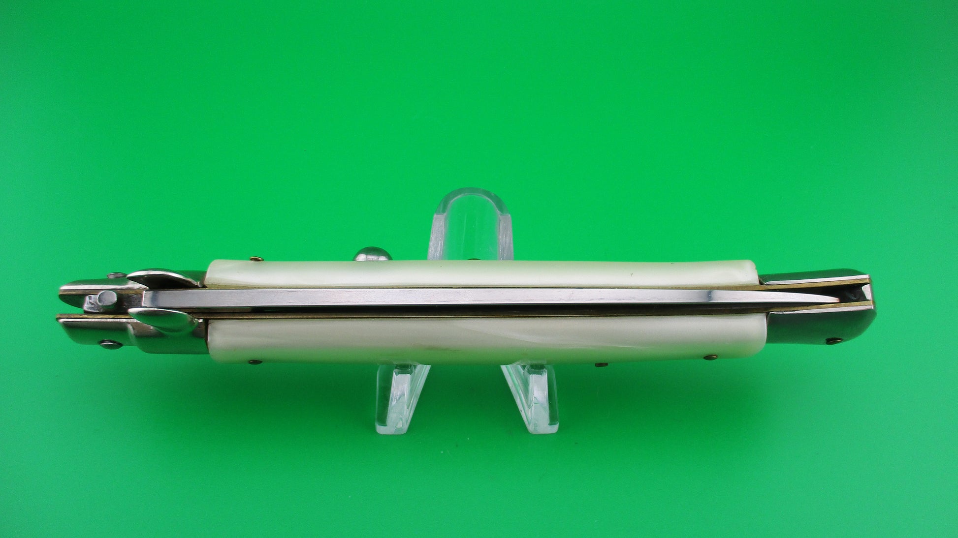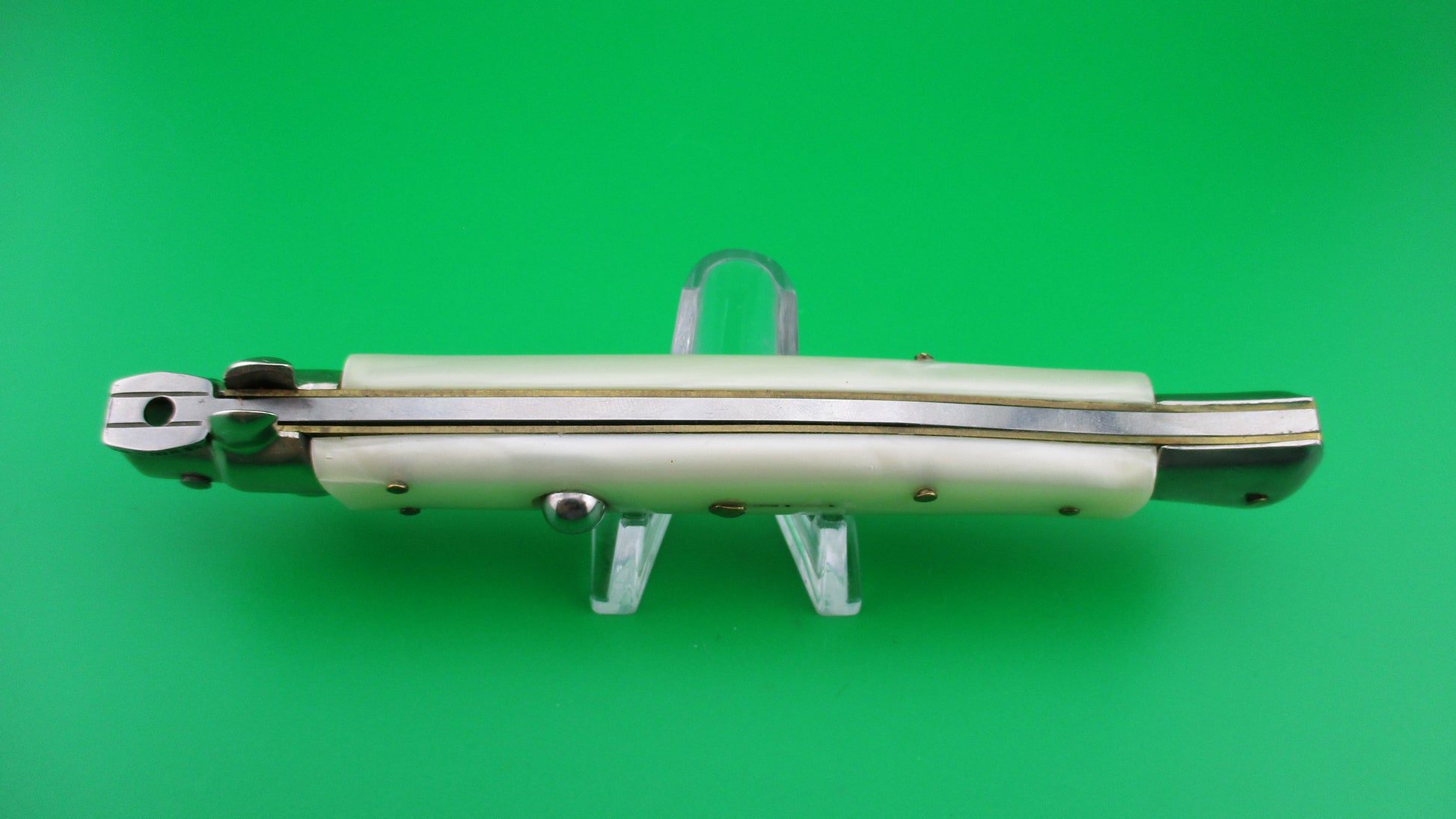 ITALY STAINLESS 28cm Italian Stiletto swivel bolster automatic knife most likely from the 1980s or 90s measures 27.5cm (10 13/16 inches) with brass liners and steel bolsters, button and brass safety cap. The Flat swedge blade is 100% full with original finish and the ricasso is stamped ITALY STAINLESS. The scales are synthetic imitation pearl and in excellent condition and held on with brass pins. The knife works great with blade tip seated deep and centered in the well, strong snap and tight lockup. Nearly new condition.