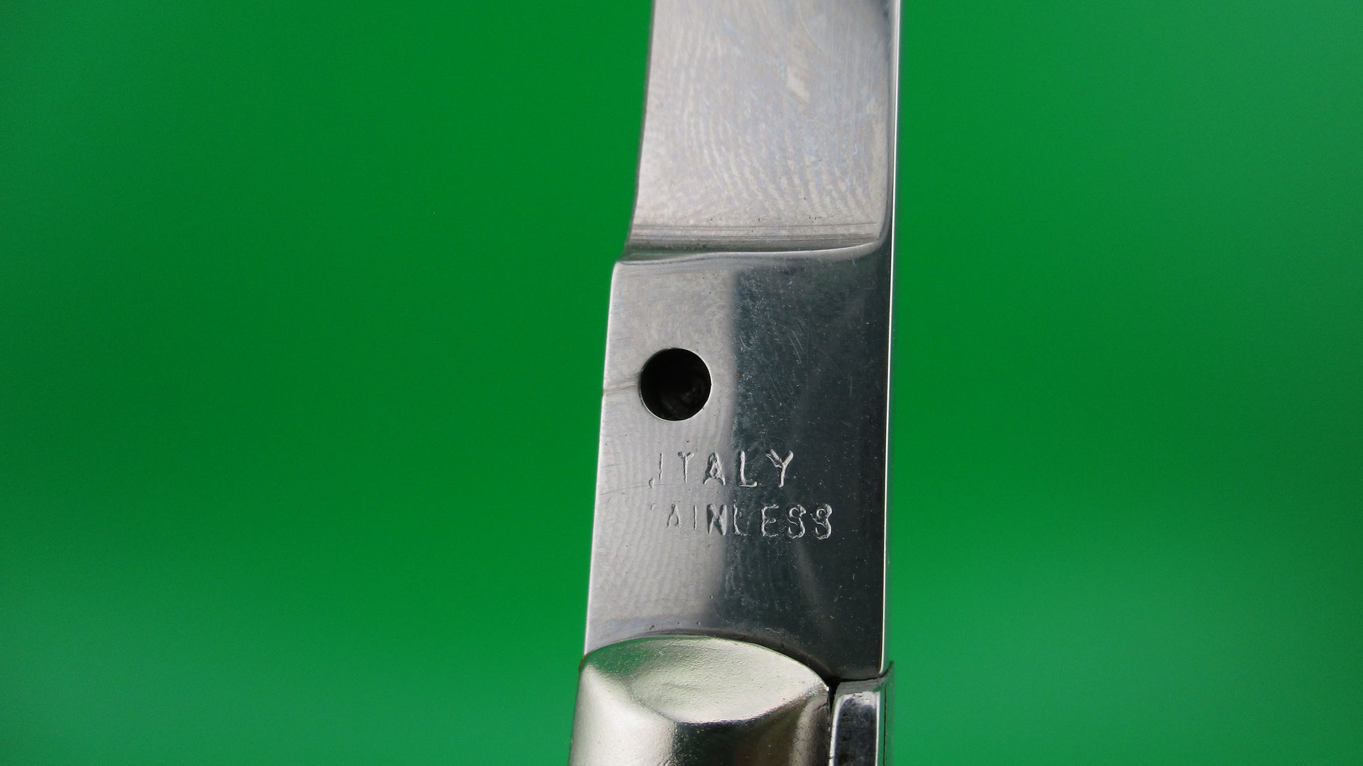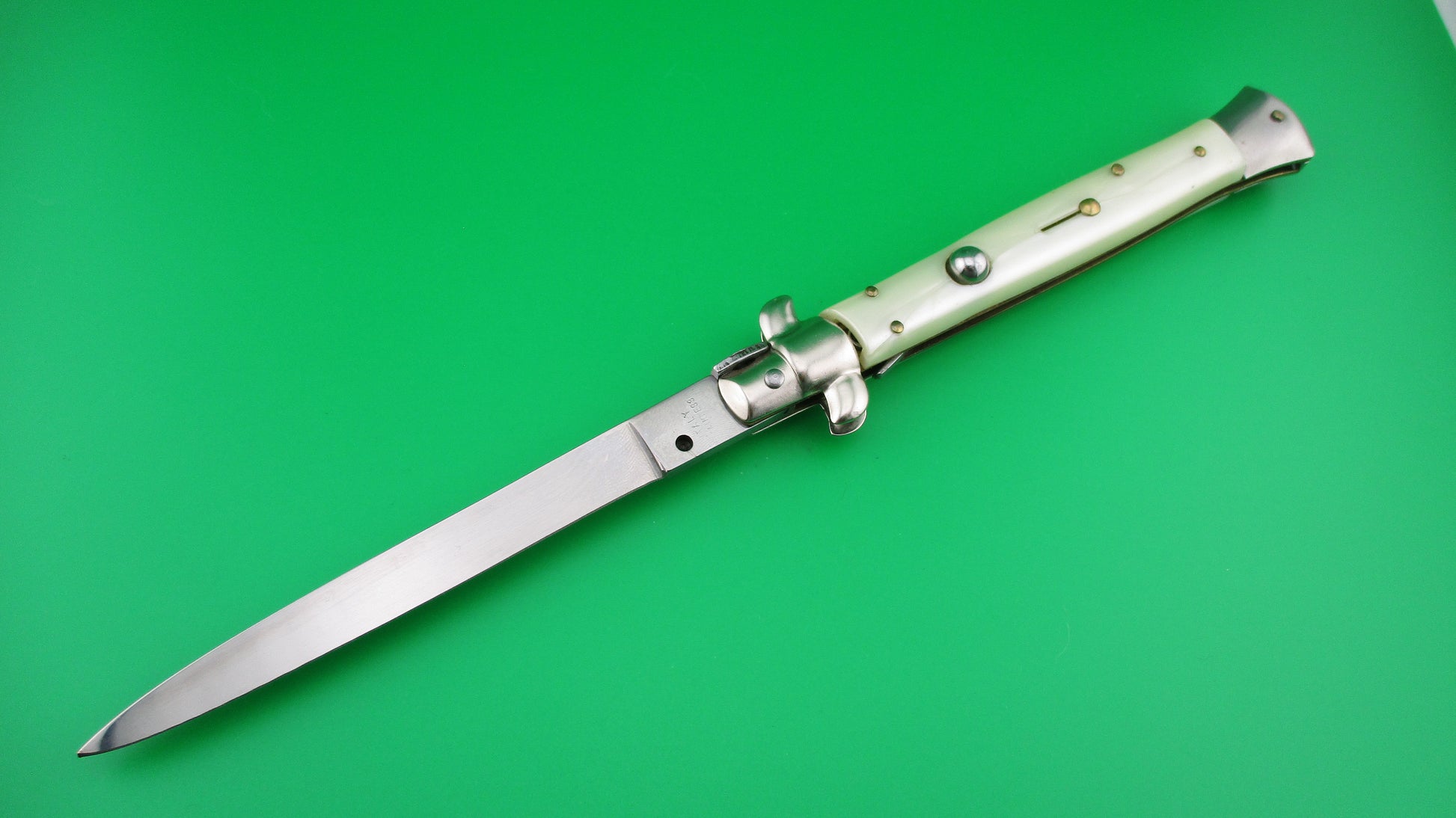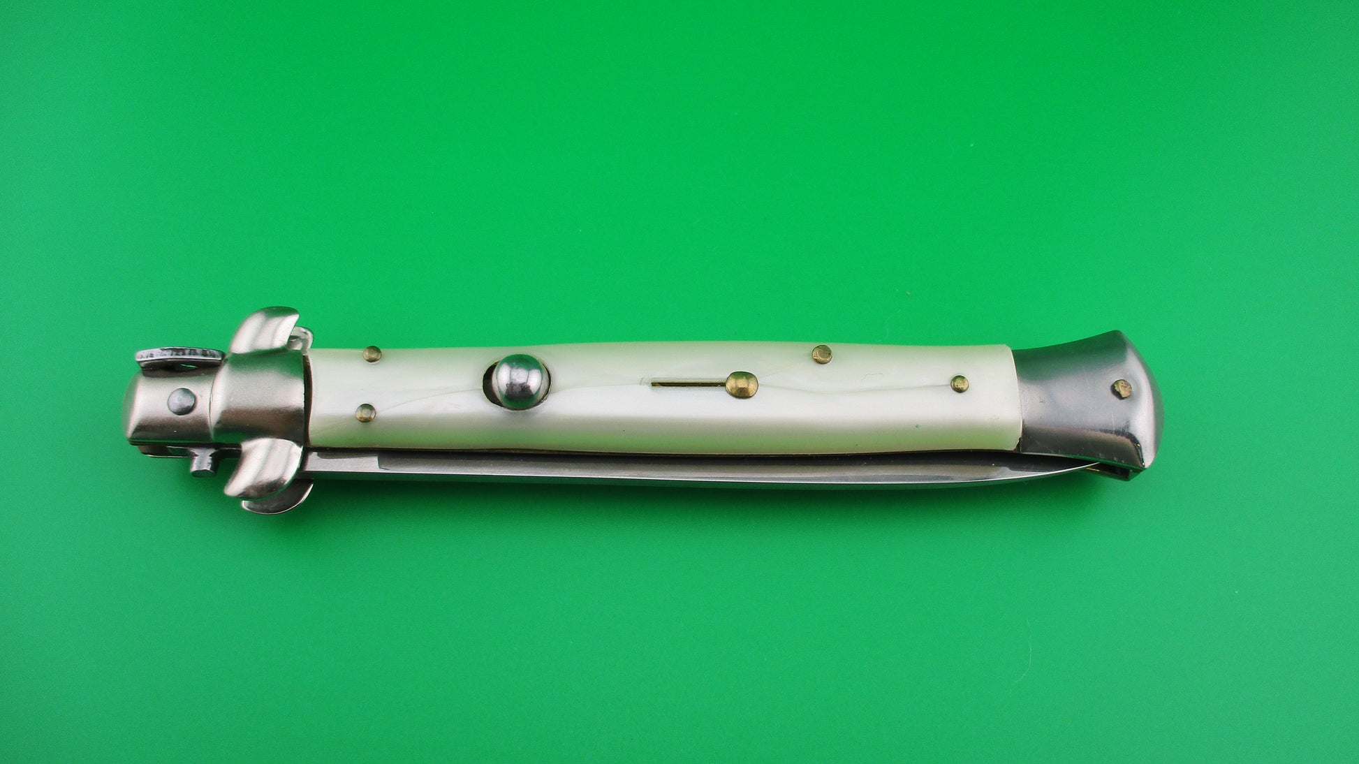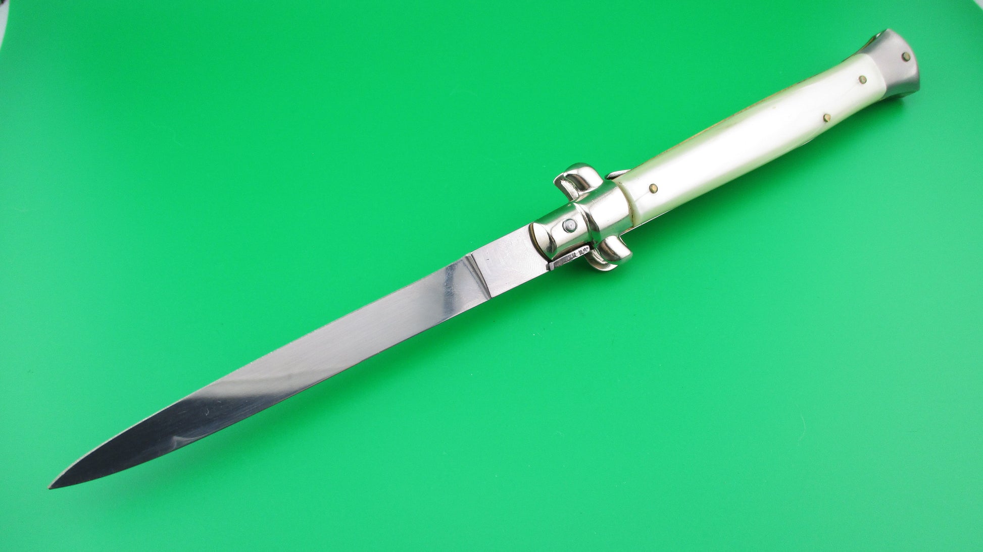 ITALY STAINLESS 28cm Italian Stiletto swivel bolster automatic knife most likely from the 1980s or 90s measures 27.5cm (10 13/16 inches) with brass liners and steel bolsters, button and brass safety cap. The Flat swedge blade is 100% full with original finish and the ricasso is stamped ITALY STAINLESS. The scales are synthetic imitation pearl and in excellent condition and held on with brass pins. The knife works great with blade tip seated deep and centered in the well, strong snap and tight lockup. Nearly new condition.