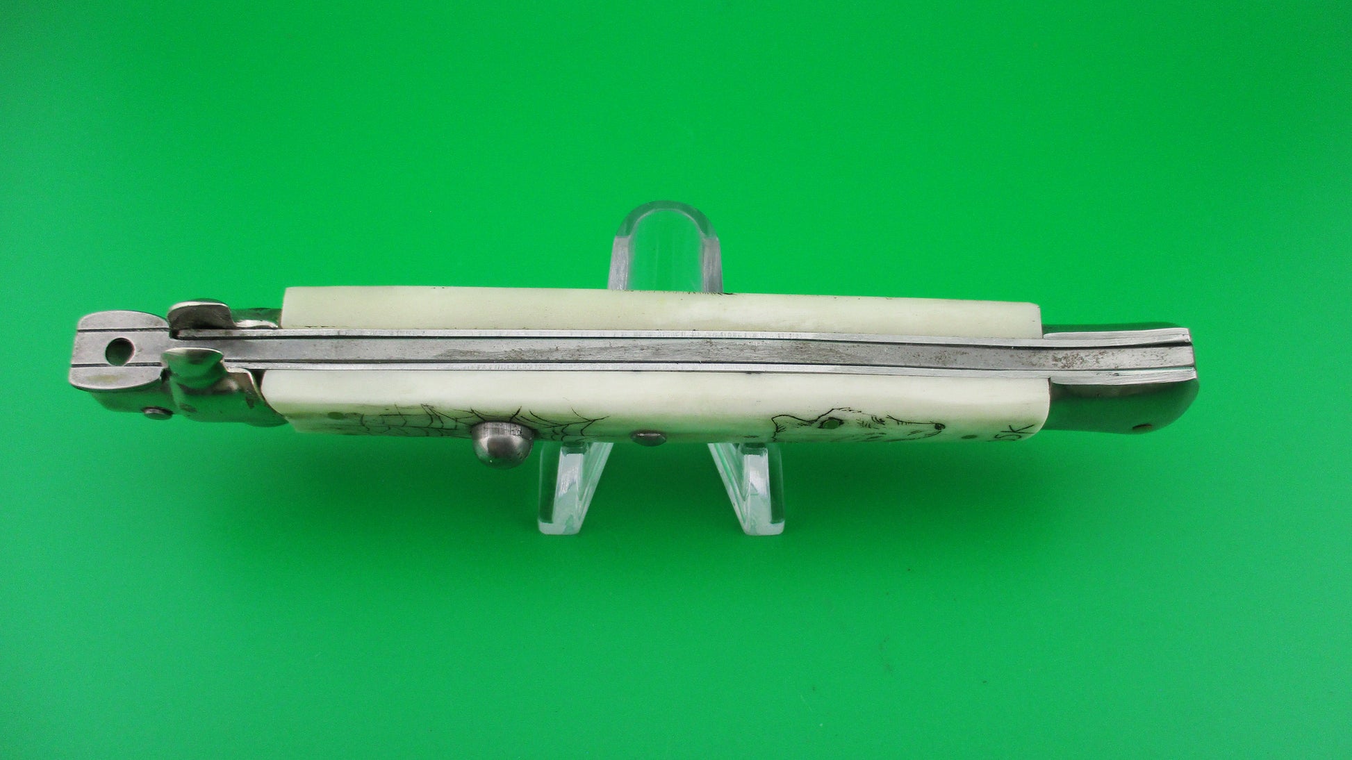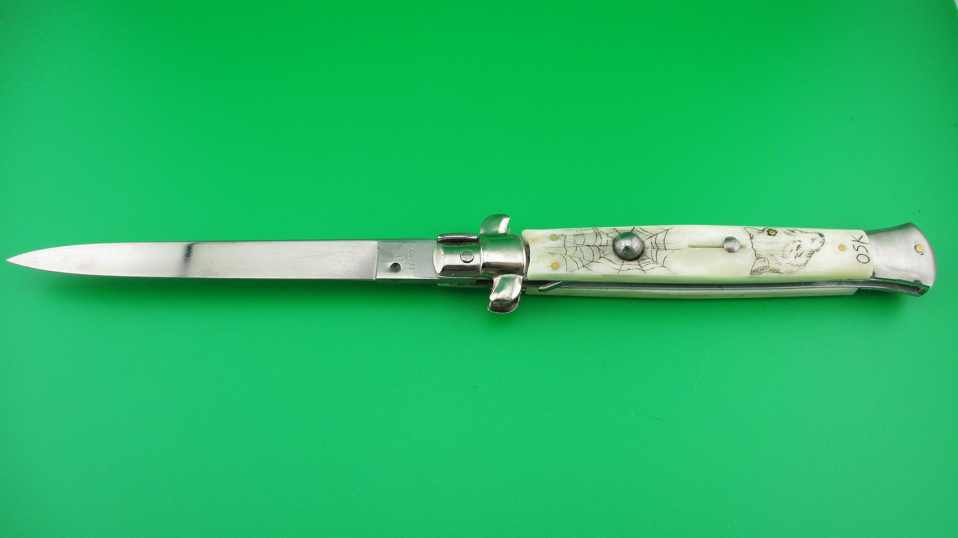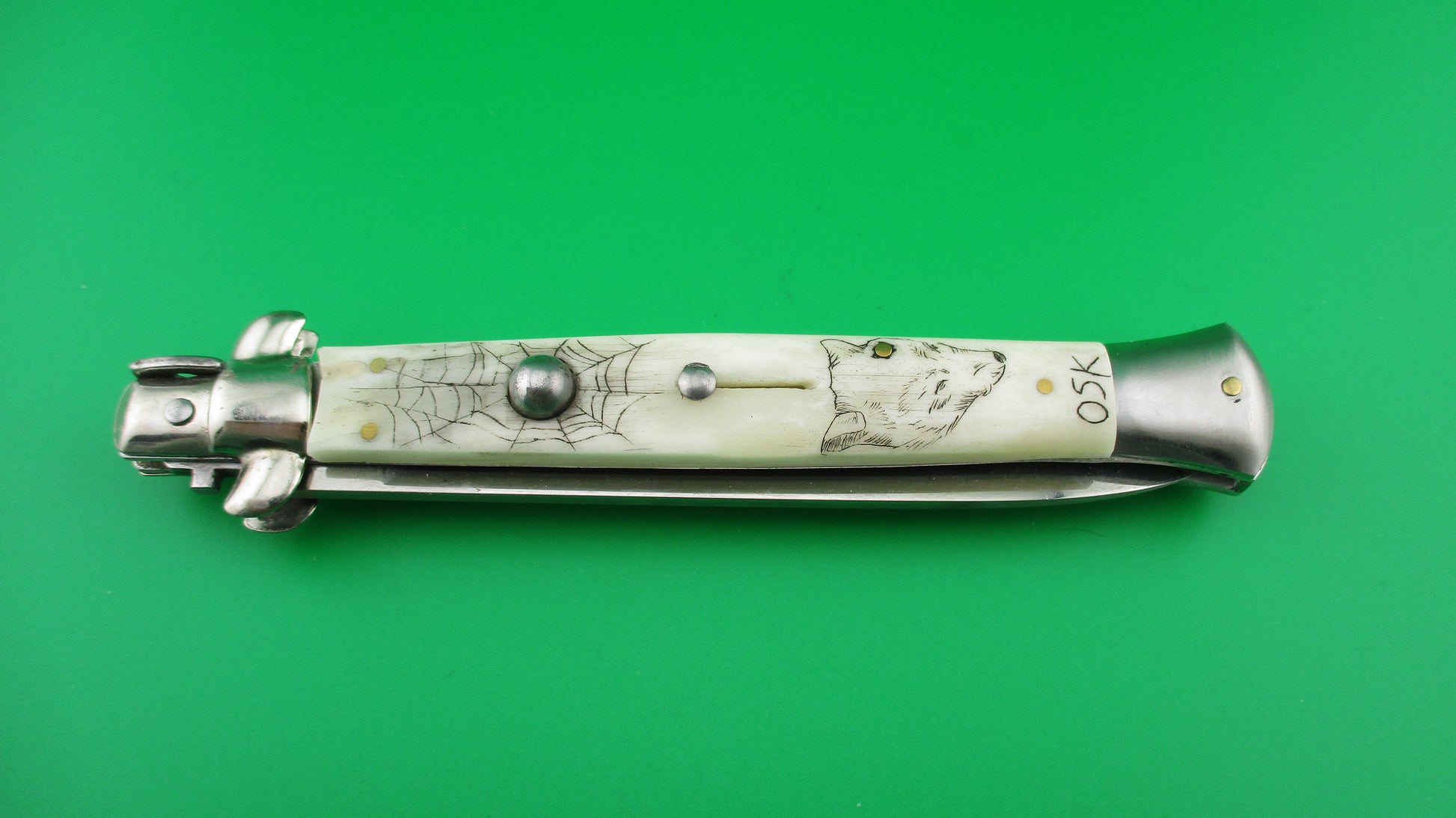 Vintage J INOX 28cm Italian Swivel bolster bone Scrimshaw Wolf Spider web automatic knife. This knife had scrimshaw work done by Italian artist MULAS and was commissioned by the OLD SWITCHBLADE KNIVES facebook group so has the letters O.S.K. near the bottom of front scale and MULAS at the bottom of the back scale. Wolf & spider web on the front scale and Wolf eyes on the back scale. The knife measures 27.3cm (10 3/4 inches) open with brass liners & pins and steel bolsters & button & safety cap. The flat grind blade is full with most of the original factory finish and some light scratches. The scales are very nice condition light colored bone. The knife works great with blade tip deep closed, strong snap and Tight lockup open. Safety works. EX+ condition.