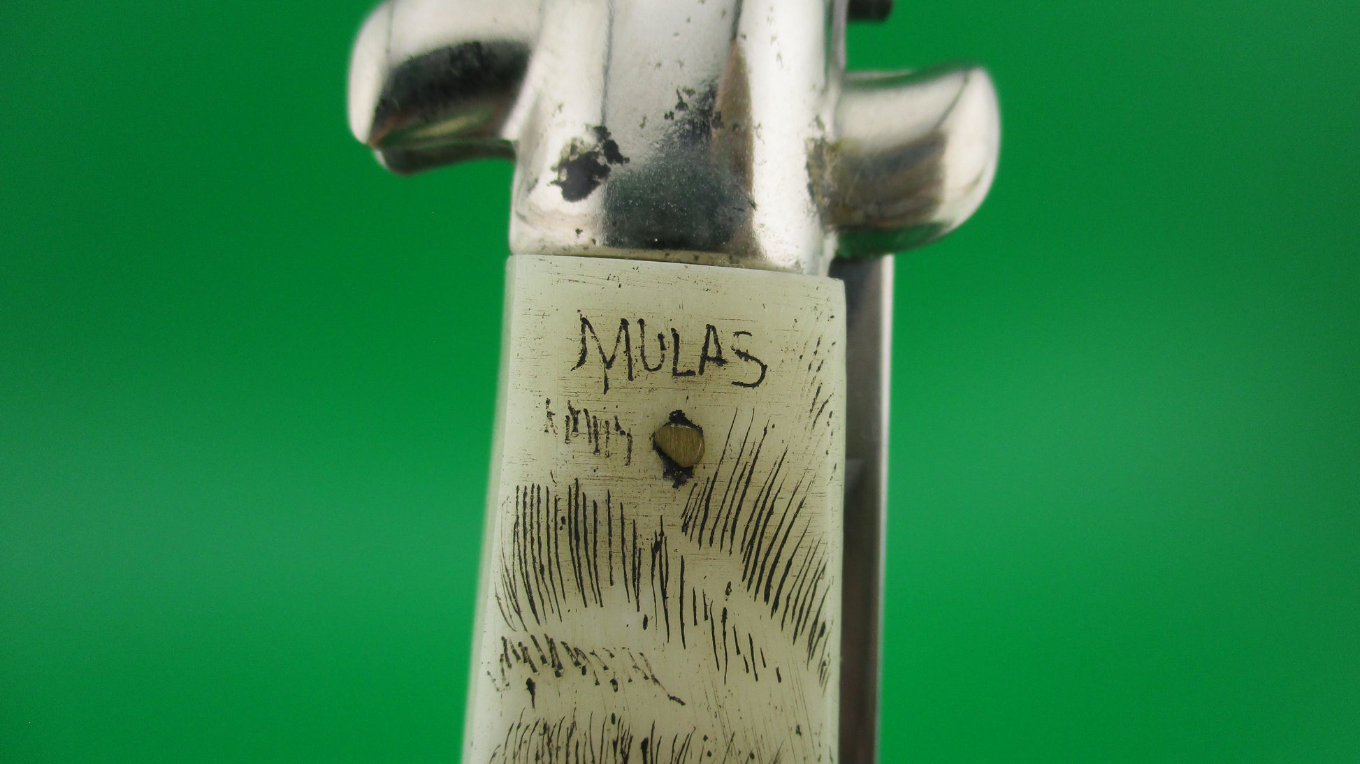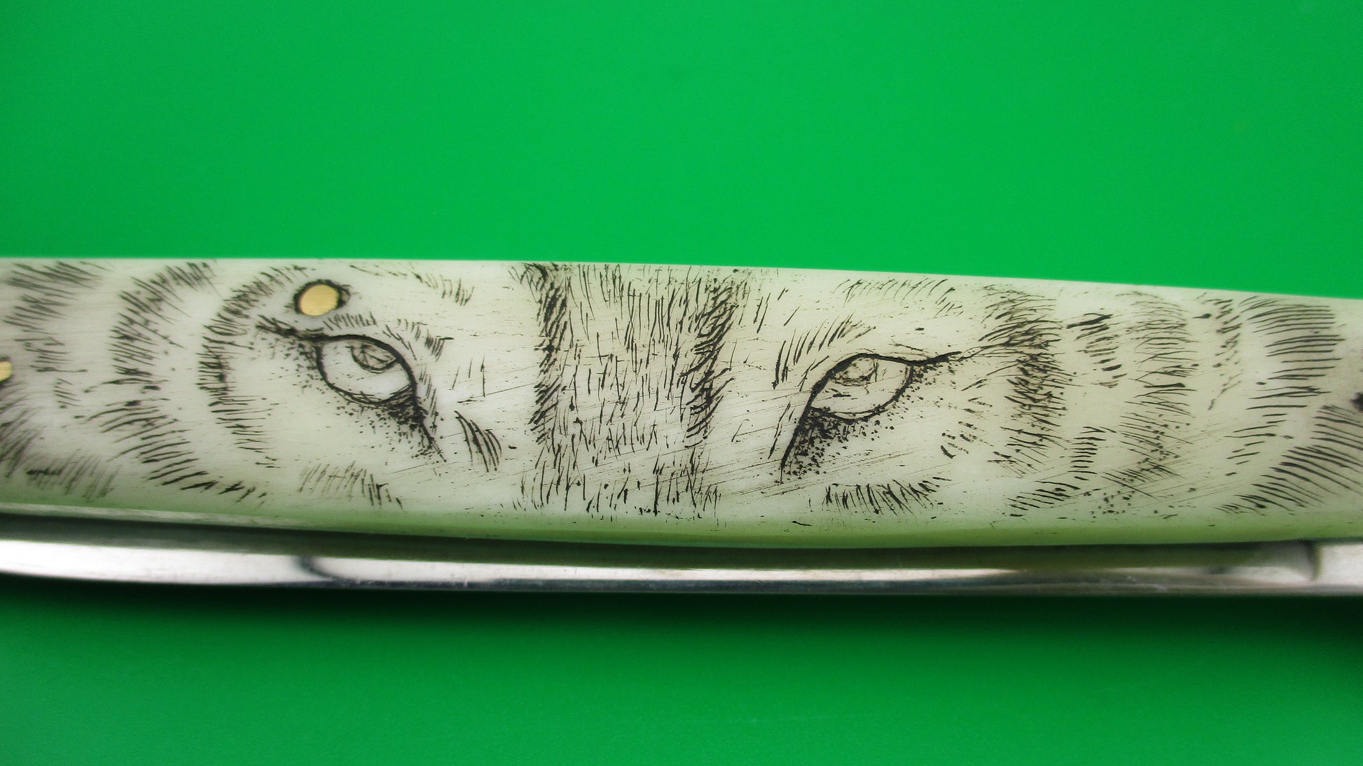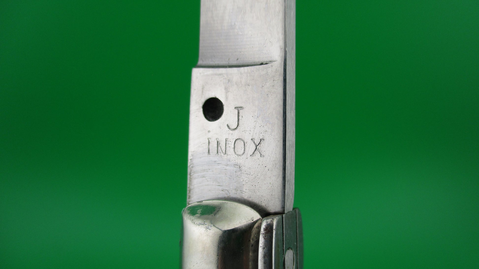 Vintage J INOX 28cm Italian Swivel bolster bone Scrimshaw Wolf Spider web automatic knife. This knife had scrimshaw work done by Italian artist MULAS and was commissioned by the OLD SWITCHBLADE KNIVES facebook group so has the letters O.S.K. near the bottom of front scale and MULAS at the bottom of the back scale. Wolf & spider web on the front scale and Wolf eyes on the back scale. The knife measures 27.3cm (10 3/4 inches) open with brass liners & pins and steel bolsters & button & safety cap. The flat grind blade is full with most of the original factory finish and some light scratches. The scales are very nice condition light colored bone. The knife works great with blade tip deep closed, strong snap and Tight lockup open. Safety works. EX+ condition.