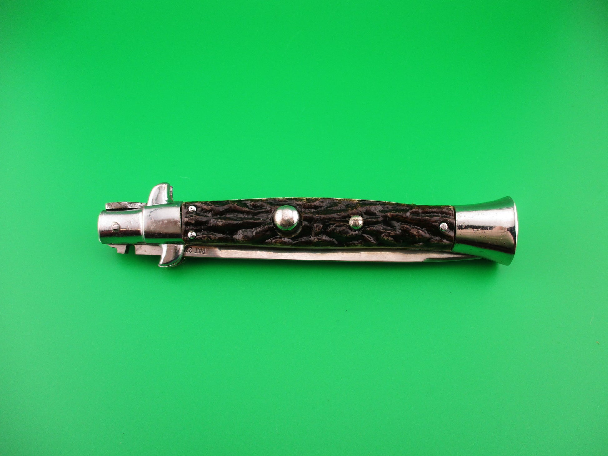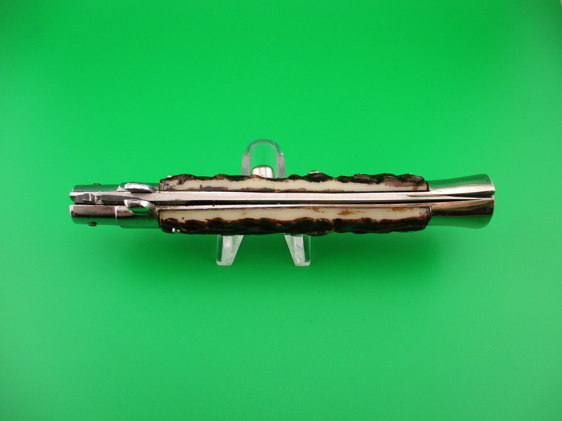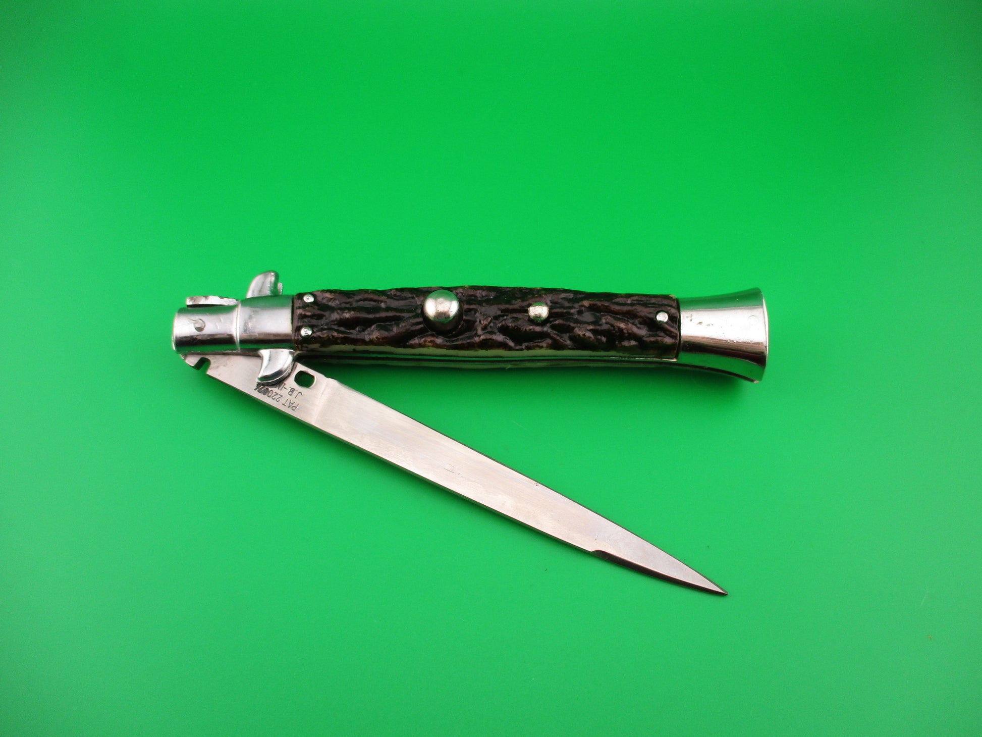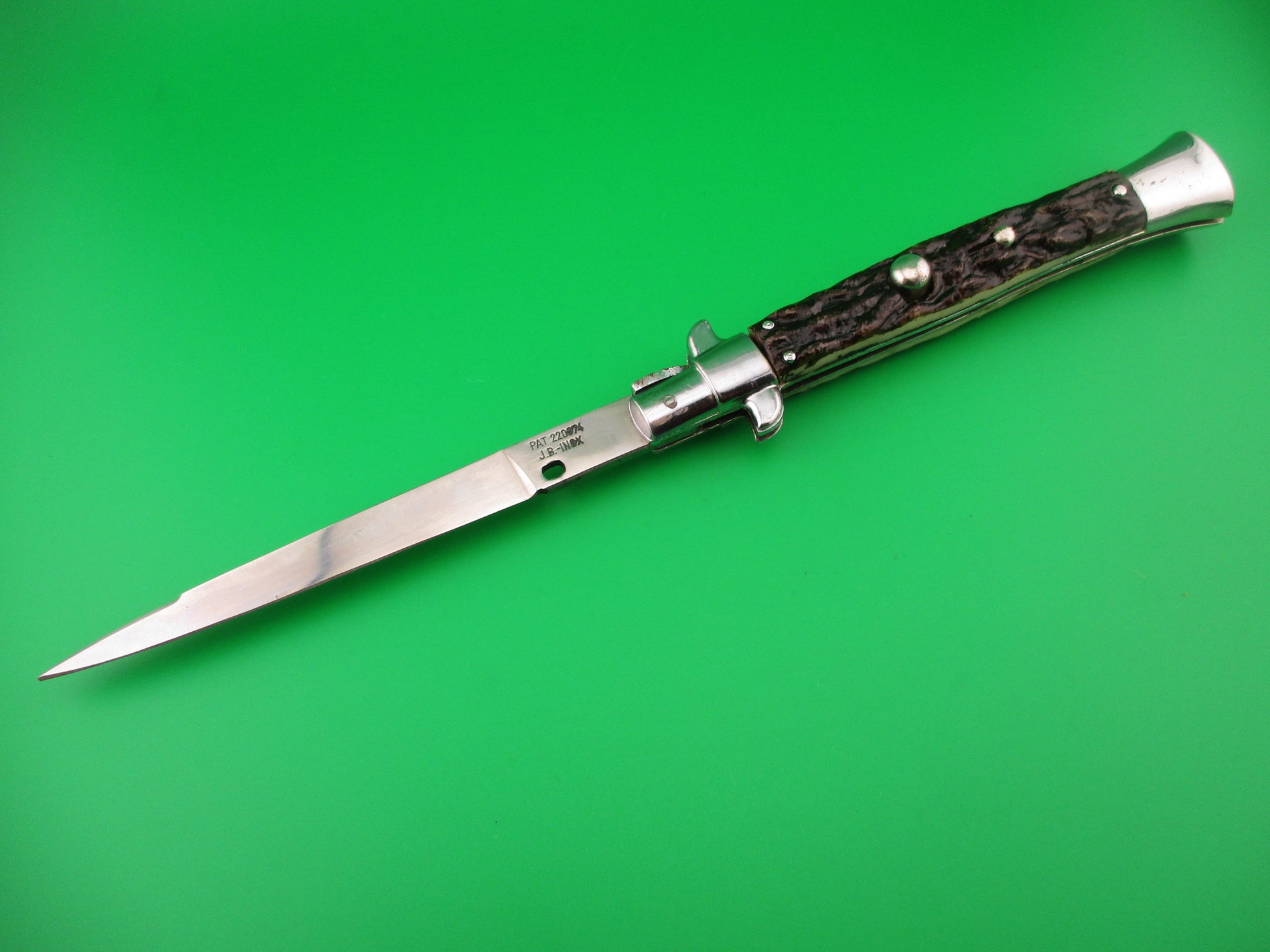 JB INOX PAT 220374 Spanish Faux Stag Stiletto swivel bolster Switchblade knife. The knife was most likely made in Spain in the 1970s or 80s it measures 28cm (11 inches) open and 5 13/16 inches closed with non magnetic pot metal liners, bolsters, button and safety cap. Not the greatest quality, but cool nonetheless. The flat grind swedge blade is full and shiny with original finish with a few light scratches and the ricasso is stamped JB-INOX PAT 220374 sideways. The rather attractive plastic imitation stag scales are in very good condition and held on by three pins on each scale. The knife works well with blade tip deep & centered closed, good snap and good lockup with just a hint of movement at the tip. Does not rattle if shaken with blade open. Swivel bolster to close. Safety works. EX+ condition.