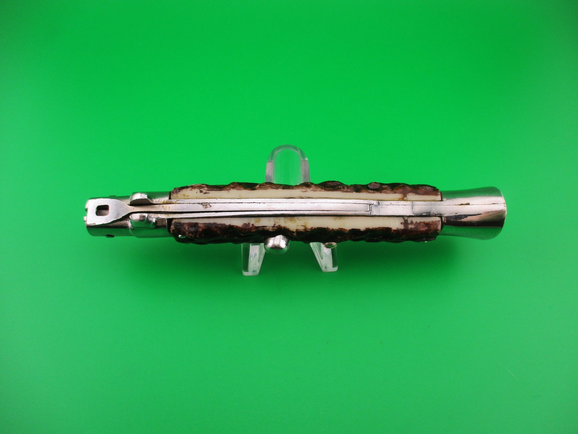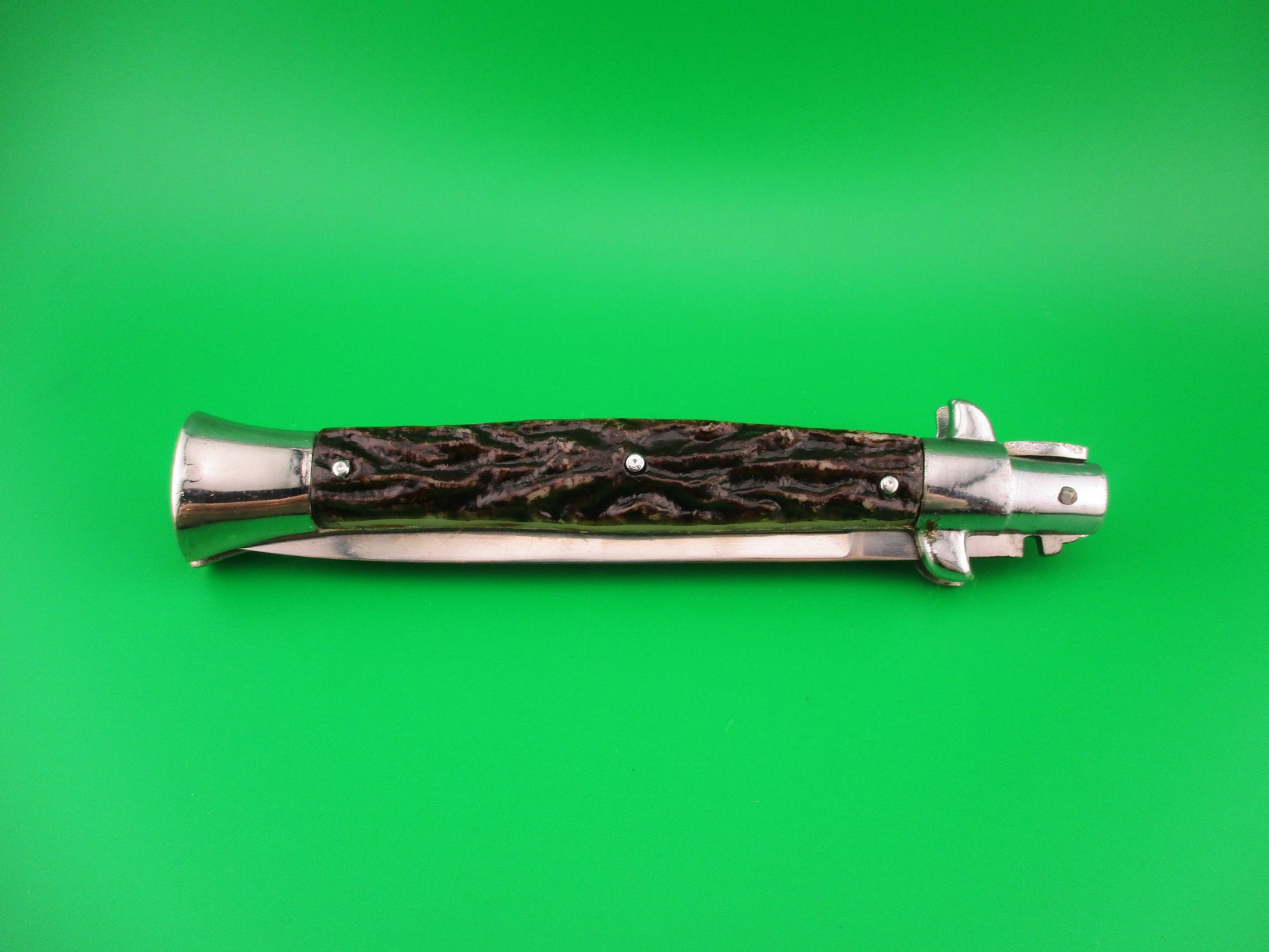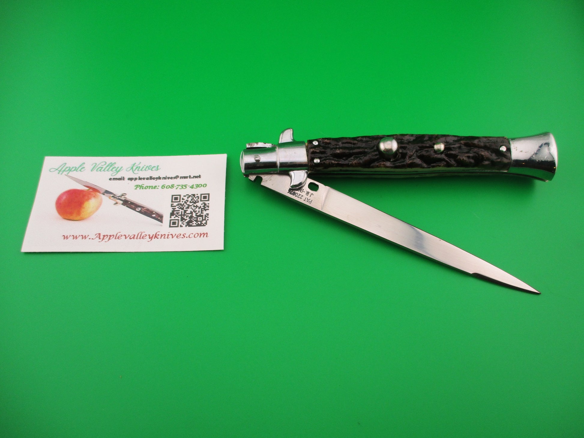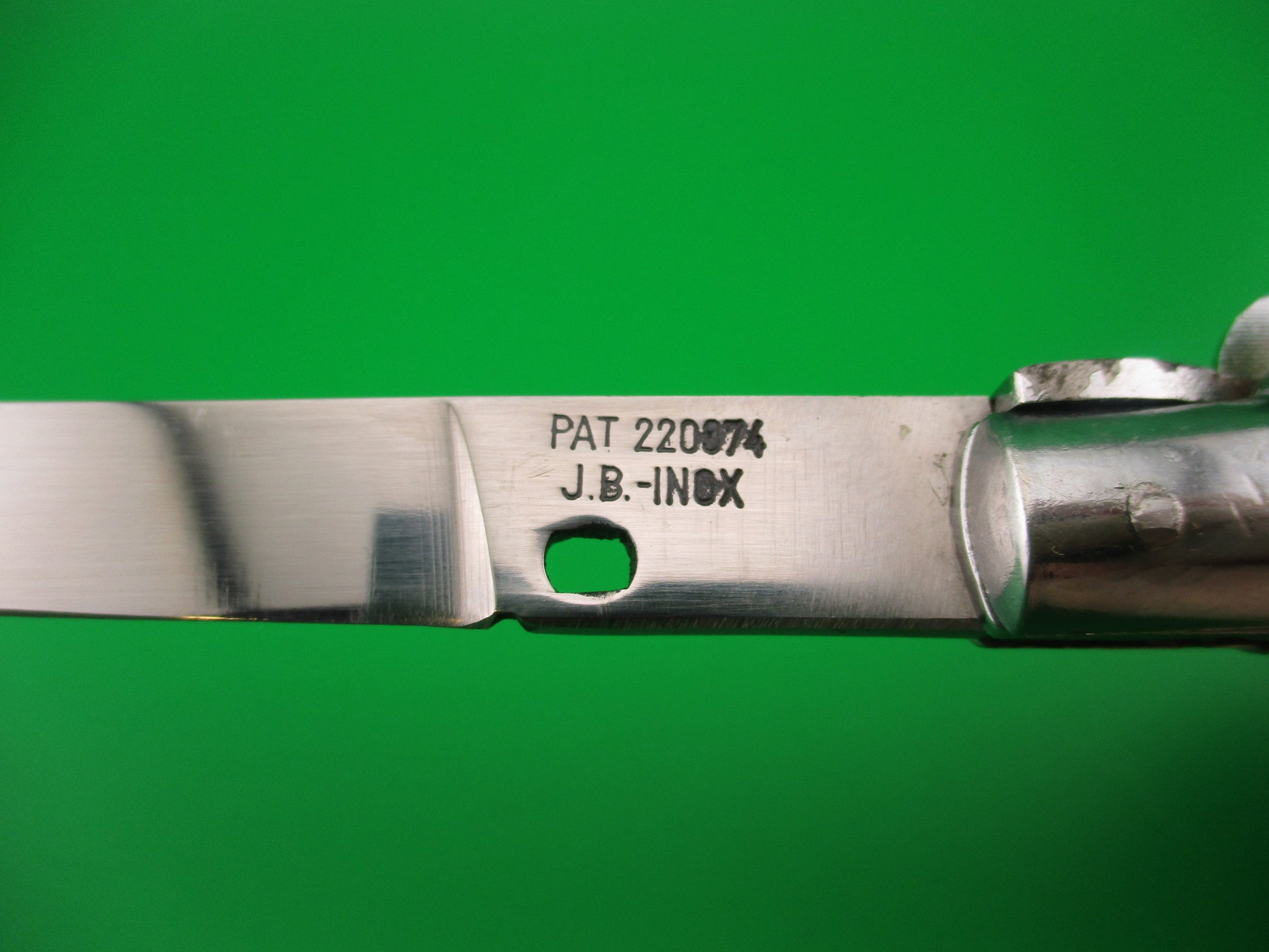 JB INOX PAT 220374 Spanish Faux Stag Stiletto swivel bolster Switchblade knife. The knife was most likely made in Spain in the 1970s or 80s it measures 28cm (11 inches) open and 5 13/16 inches closed with non magnetic pot metal liners, bolsters, button and safety cap. Not the greatest quality, but cool nonetheless. The flat grind swedge blade is full and shiny with original finish with a few light scratches and the ricasso is stamped JB-INOX PAT 220374 sideways. The rather attractive plastic imitation stag scales are in very good condition and held on by three pins on each scale. The knife works well with blade tip deep & centered closed, good snap and good lockup with just a hint of movement at the tip. Does not rattle if shaken with blade open. Swivel bolster to close. Safety works. EX+ condition.