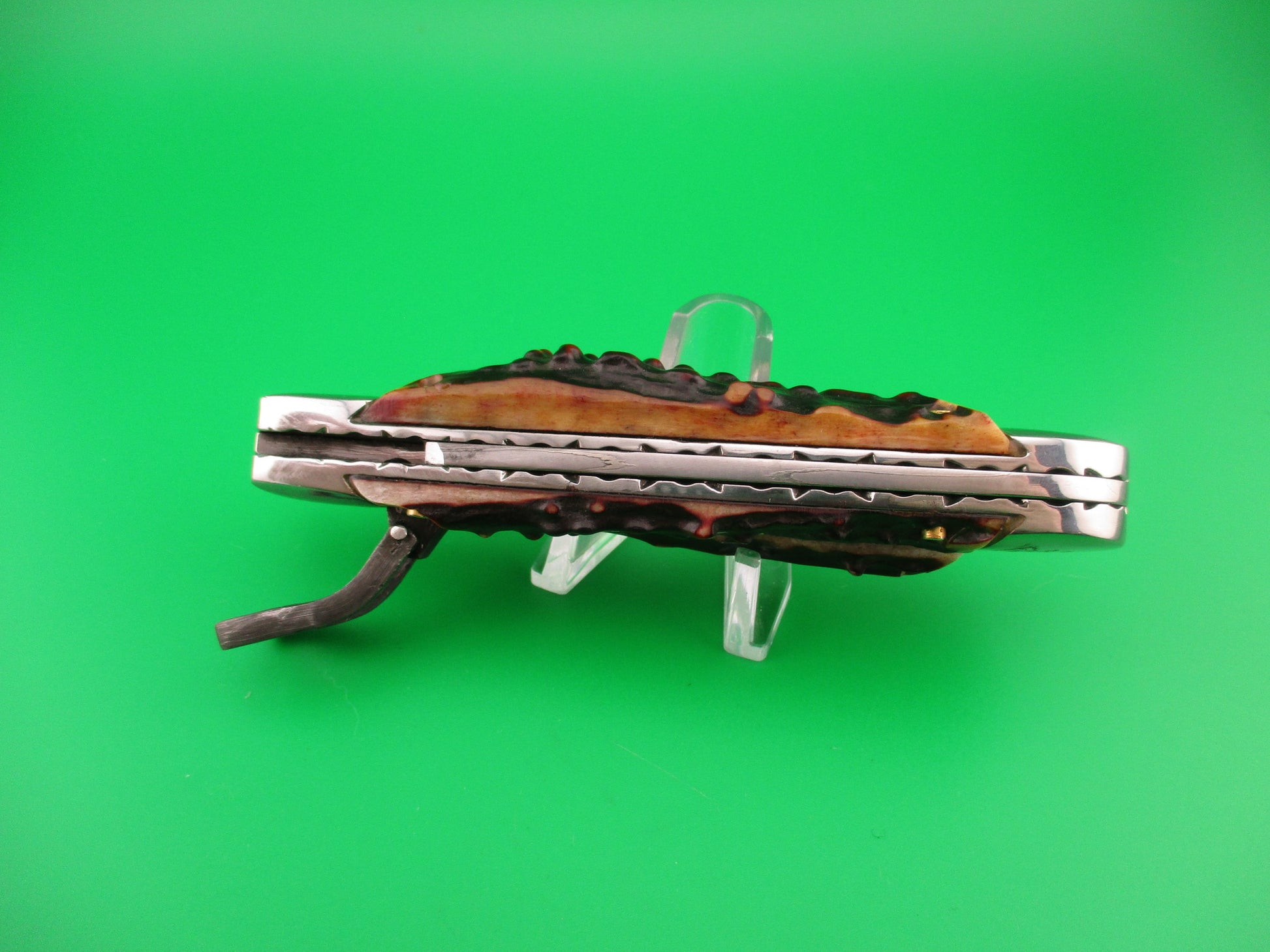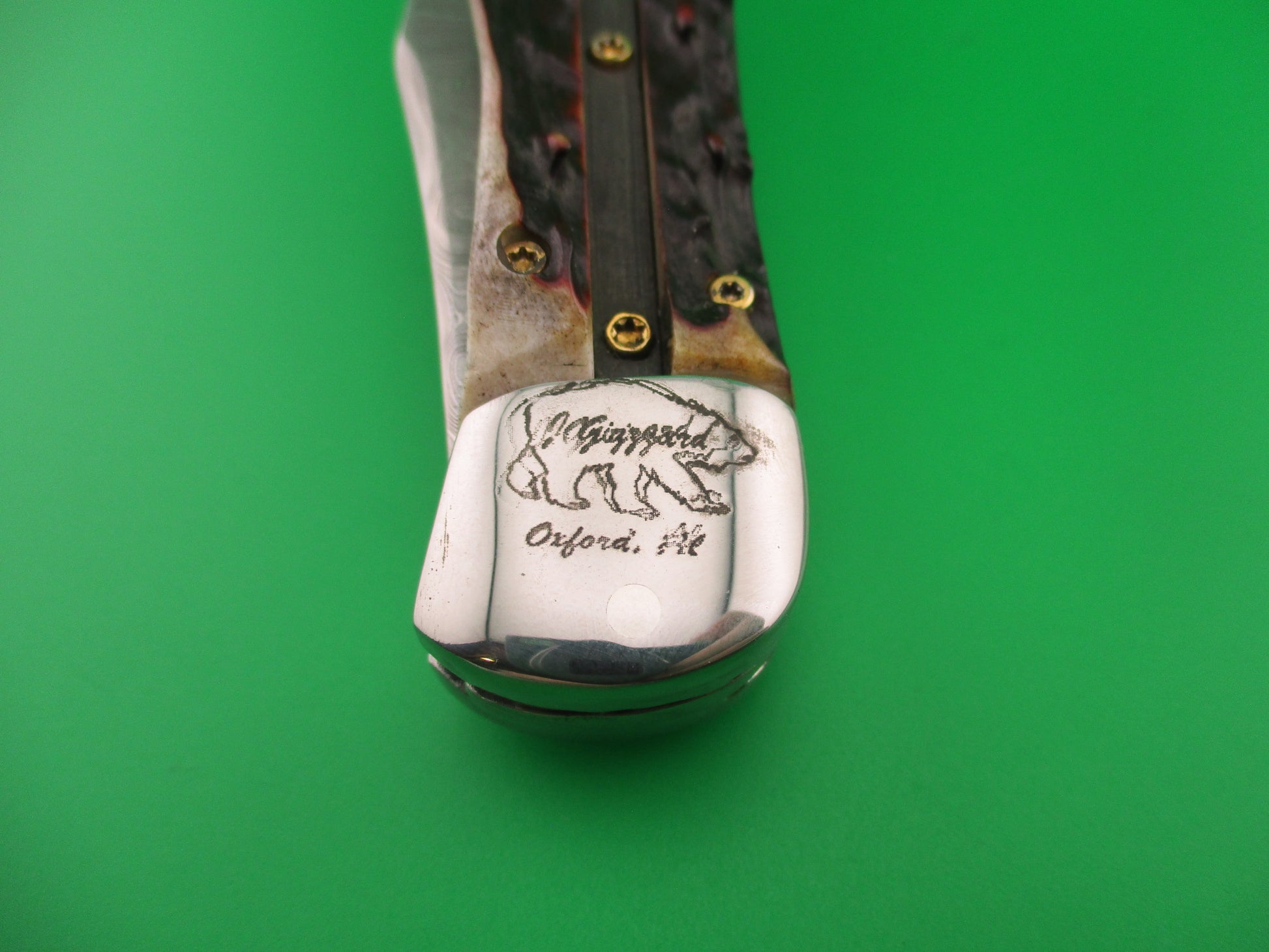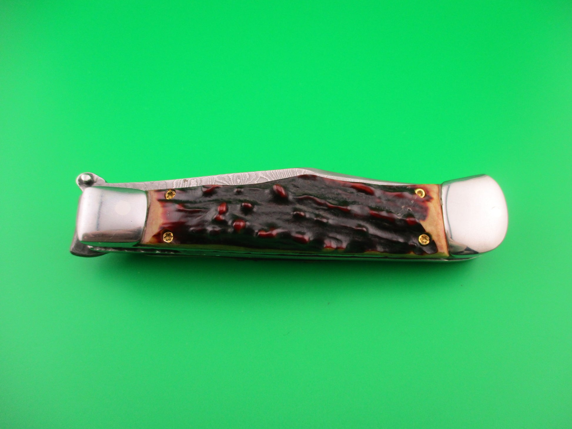 Jim Grizzard CUSTOM WR CASE LEVER Inspired Stag Damascus automatic knife made in Oxford, Alabama sometime after 2010. Unfortunately Jim is no longer with us, but his great knives are left to carry on his legacy. This Beautiful Lever automatic hand made custom knife was inspired by the CASE 5161L switchblade from the 1920s & 30s made here in the USA. This knife measures 4.5 inches closed and 8 inches open with file-worked steel liners, steel bolsters and Damascus steel lever and blade. The Damscus clip blade is full and the tang is marked "J Grizzard" inside the outline of a Grizzly bear. The genuine Stag scales are gorgeous and gnarly with a lot of character with some red. The knife works great with blade tip Deep and centered closed, good snap and very good lockup with just a hint of movement at the tip. Does not rattle if shaken with blade open (except the lever a bit). Like new condition.