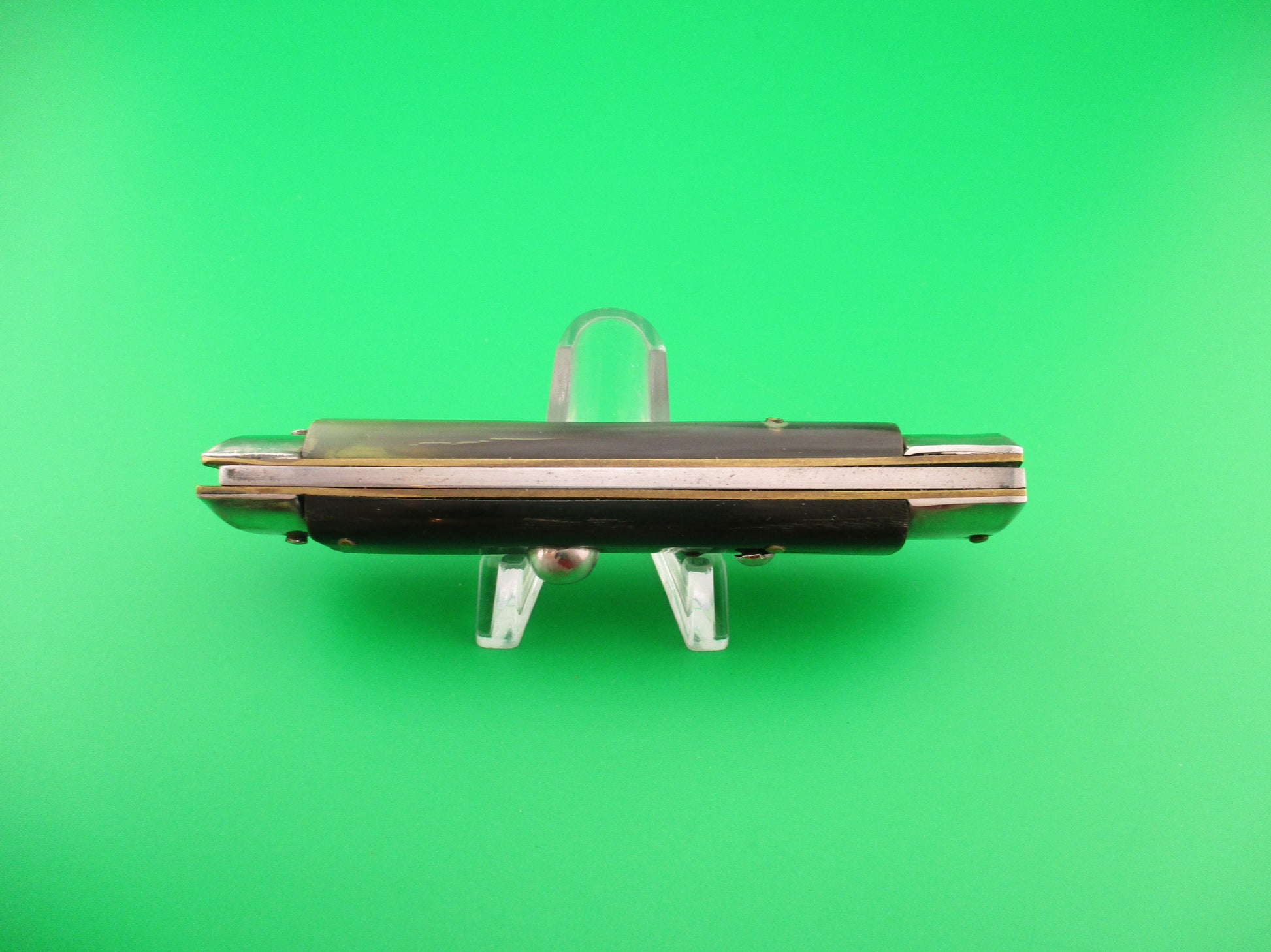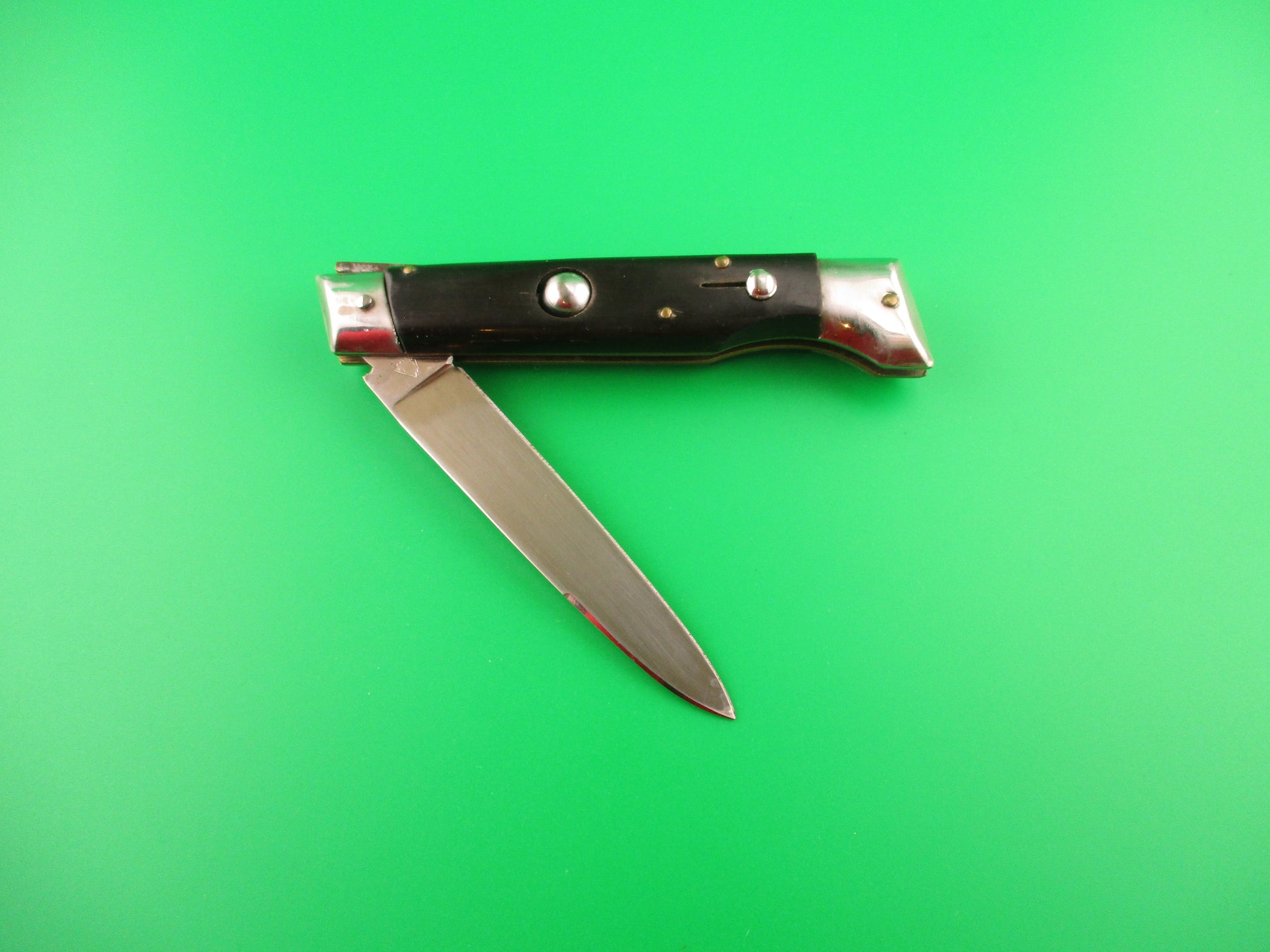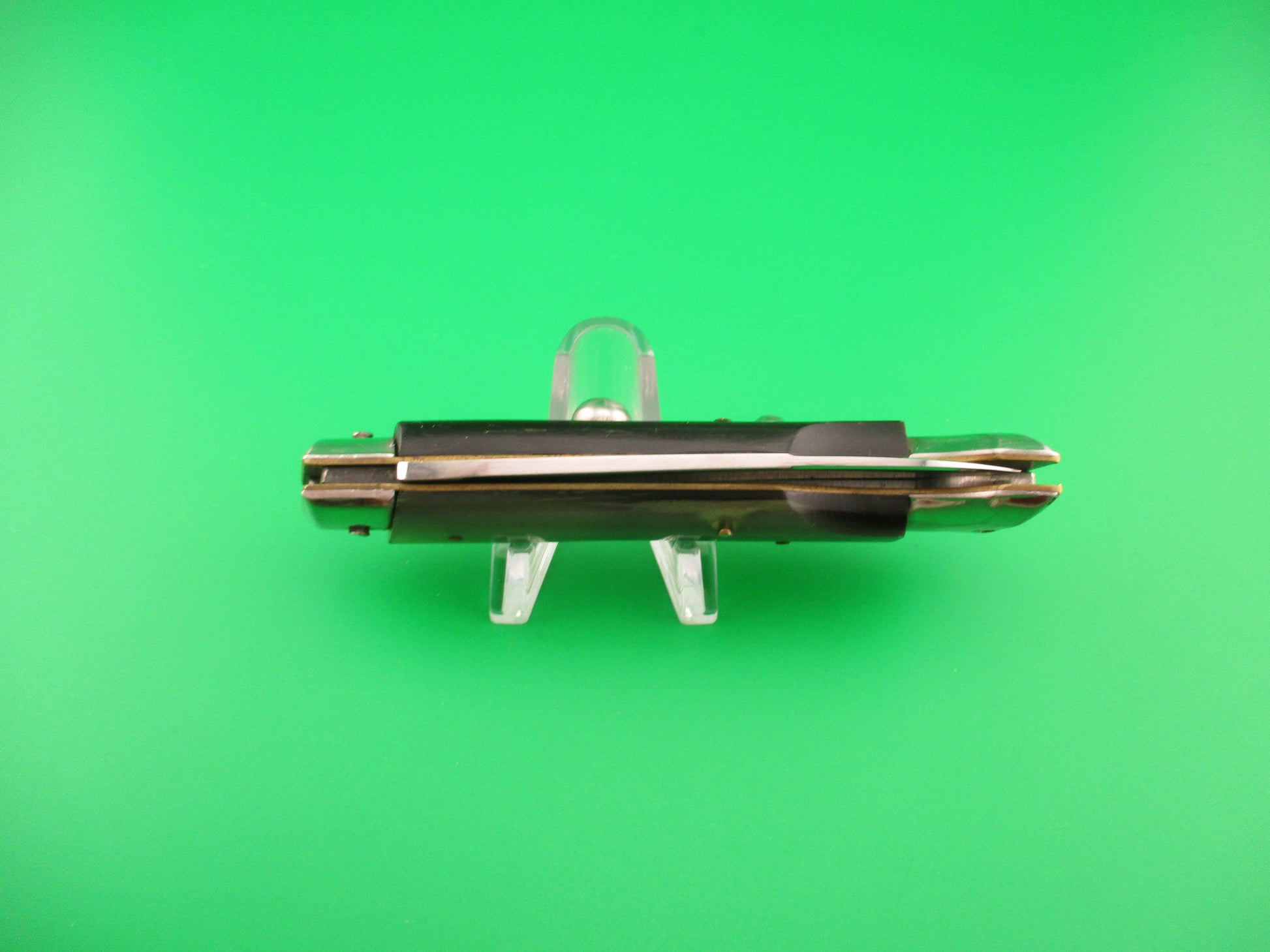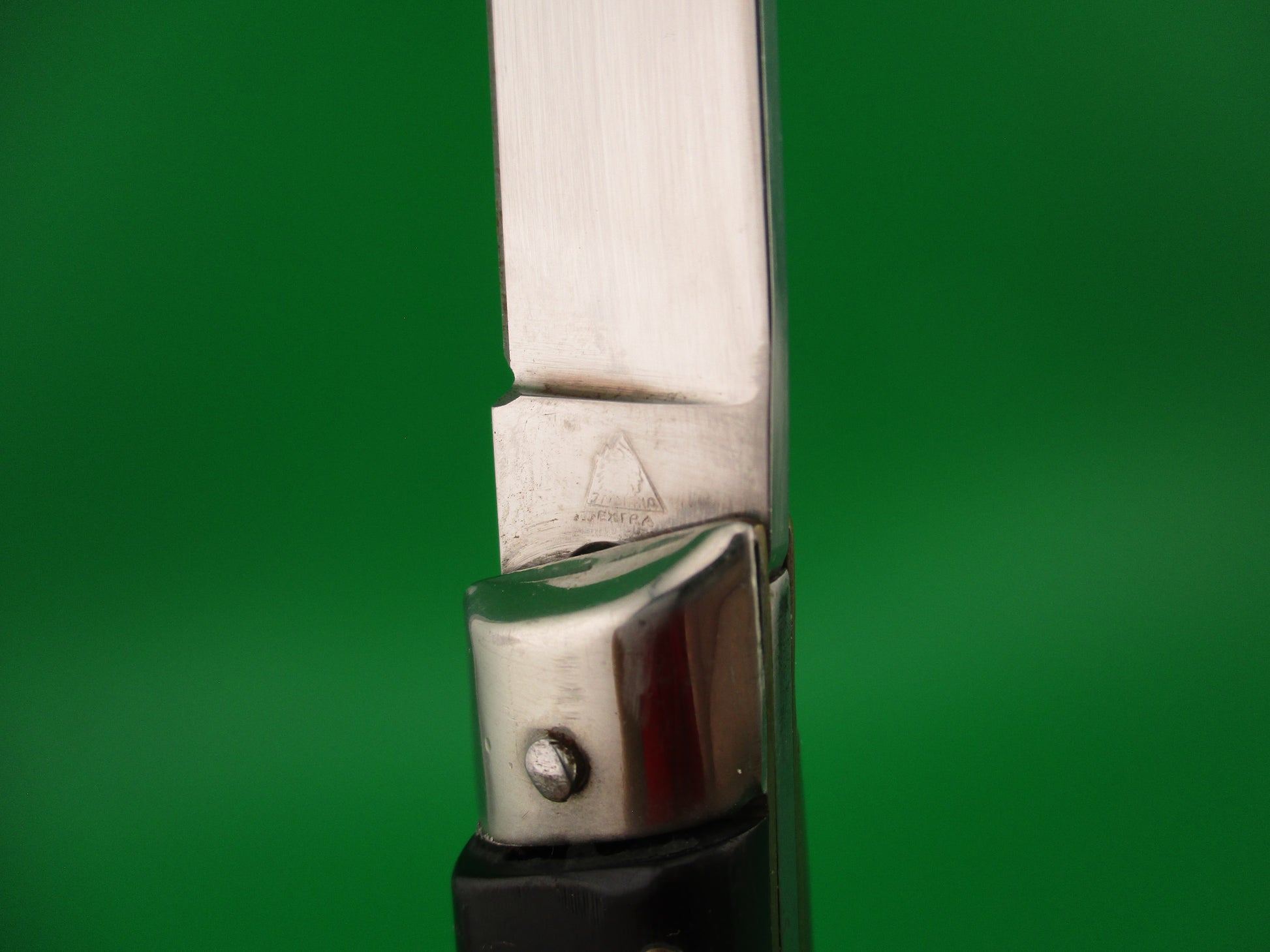 Vintage Jndiana EXTRA 20cm Italian Slant Bolster horn handled automatic knife most likely made in the 1960s - 80s in Italy. The knife measures 19.6cm (7 3/4 inches) open with D stamped brass liners and nickel silver bolsters & safety cap with steel button. The spear point blade is 99% full or better with factory finish and some light scratches and the ricasso is stamped with the Jndiana Mountain stamp over EXTRA. The genuine horn scales are in excellent condition with some light handling marks with the front scale being black and the rear translucent green with a little black along the edges. Knife works well with blade tip well below the liners closed, good snap and Tight lockup open. Button open, button close. Does not rattle if shaken with the blade open. Safety works. EX+ condition.