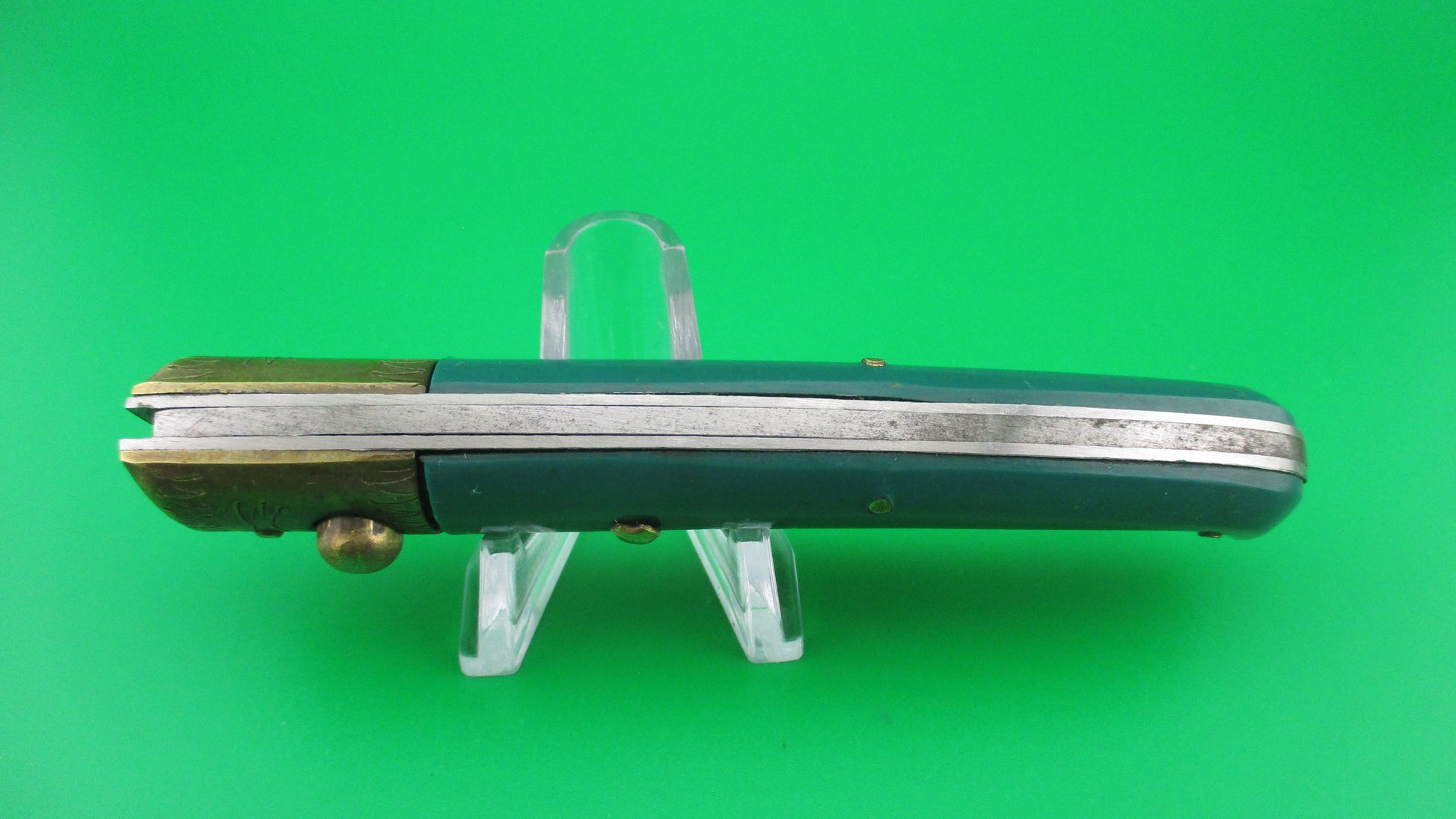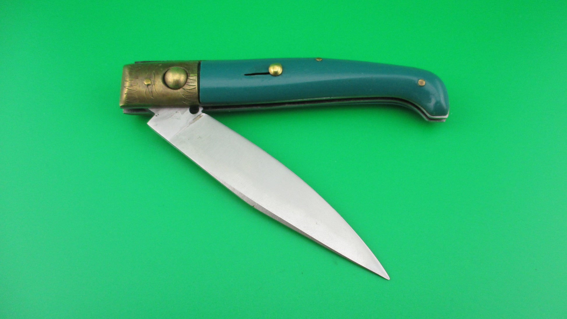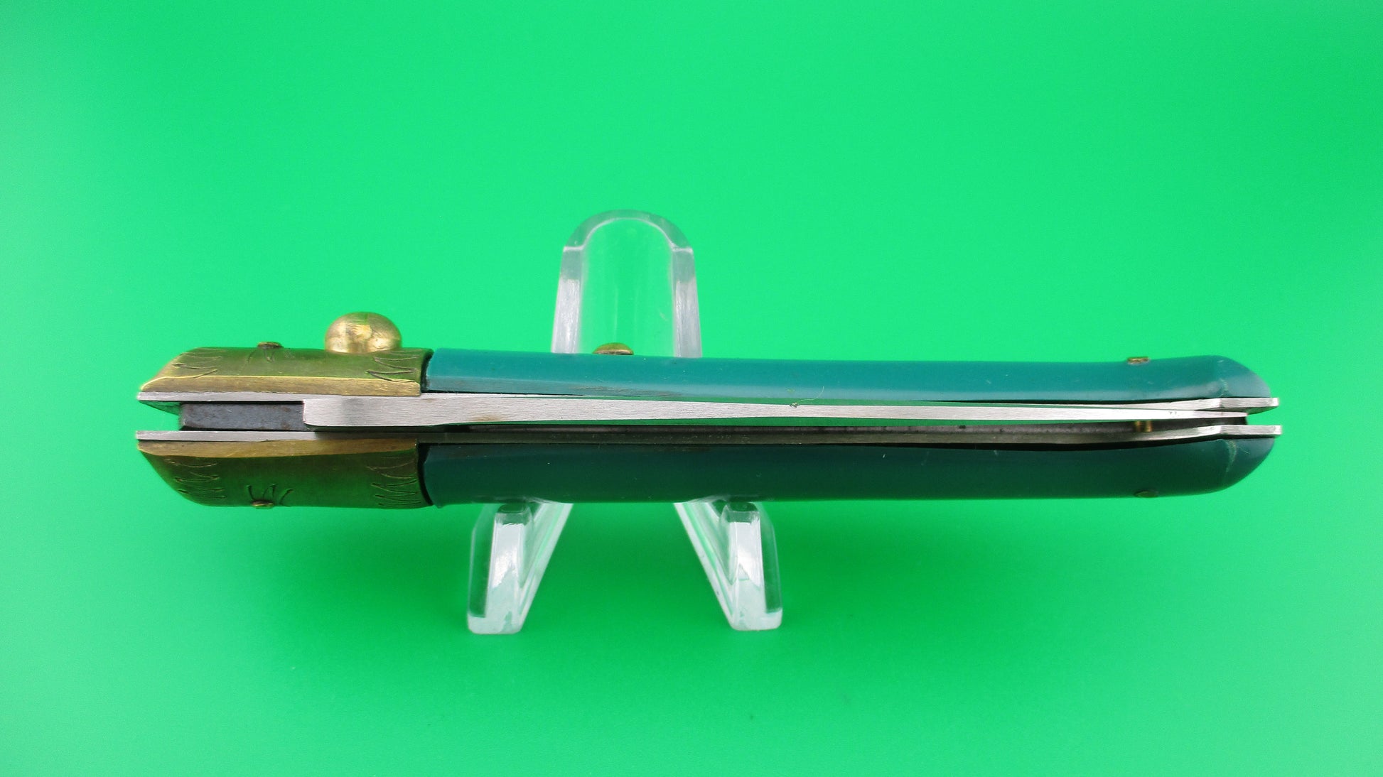 Nice vintage Jndiana Italian Green PATTADA bird's head horn automatic knife made in Sardinia Italy. Not sure on the age of this one, but I know that these were made back in the 1970s/80s for Jndiana Co in Maniago. This knife measures 21cm (8.25 inches) open with steel liners and brass bolsters, button and safety cap. The blade is full and has original finish and is marked with the triangle Jndiana stamp, though light and hard to make out and PATENT on the rear. The Green plastic scales are in good condition with a slight amount of shrinkage and some scuffs along the safety slot. It's a BoBc (button open, button close). The knife works great with blade tip seating good, strong snap and tight lockup! Safety works. EX+ condition.