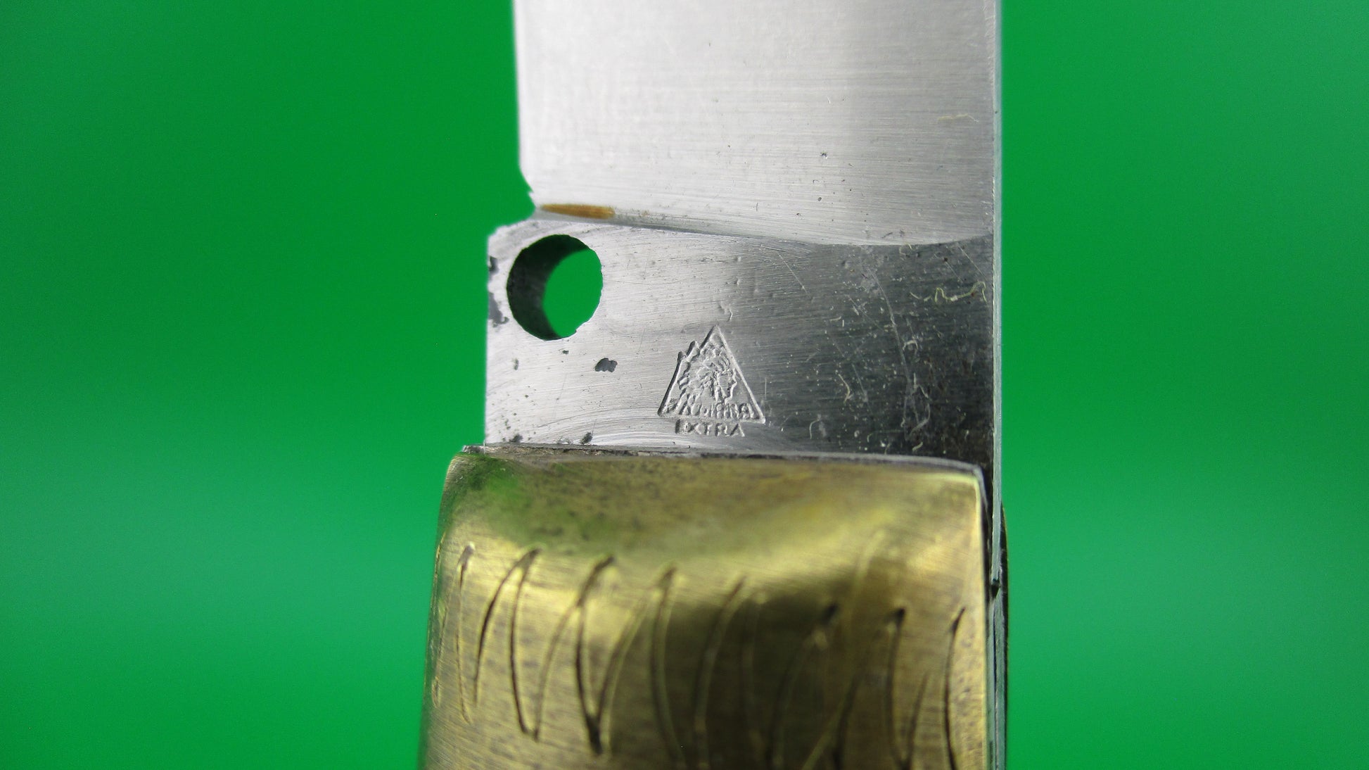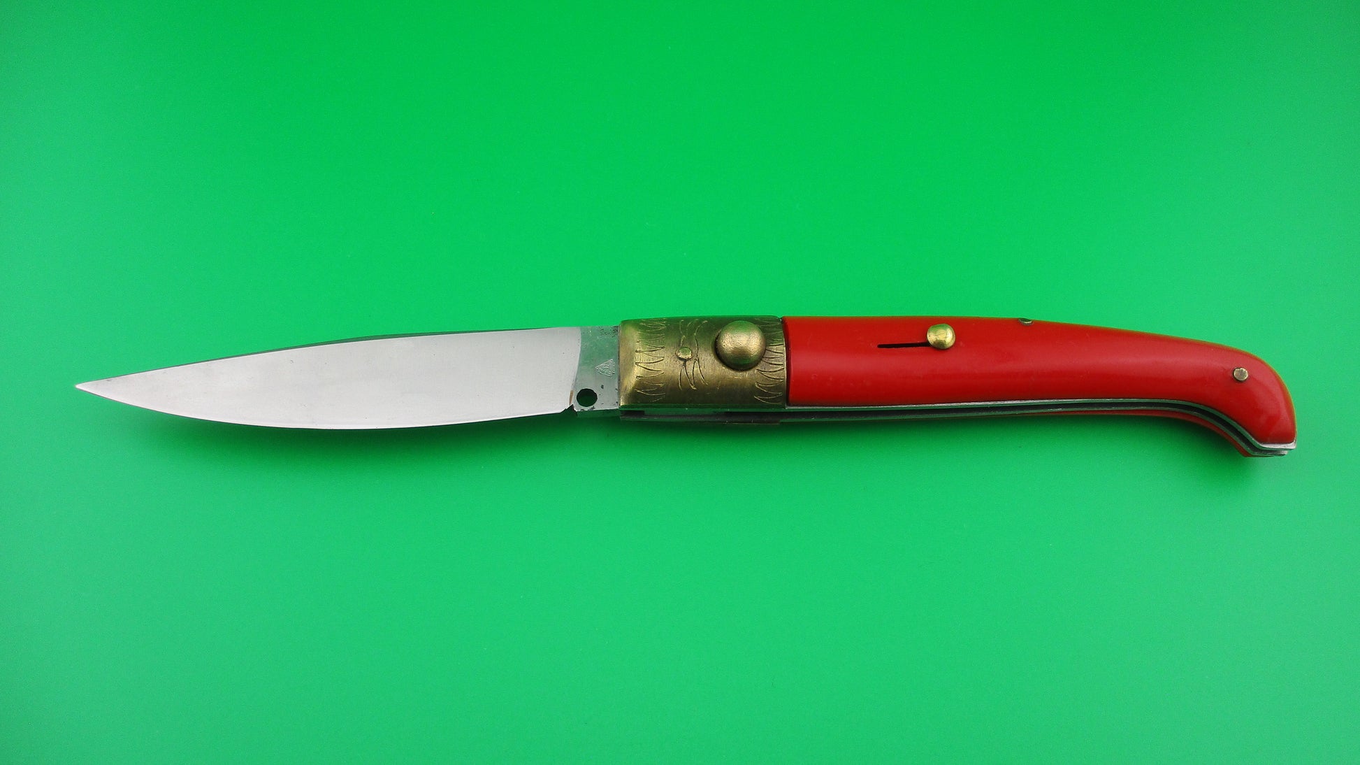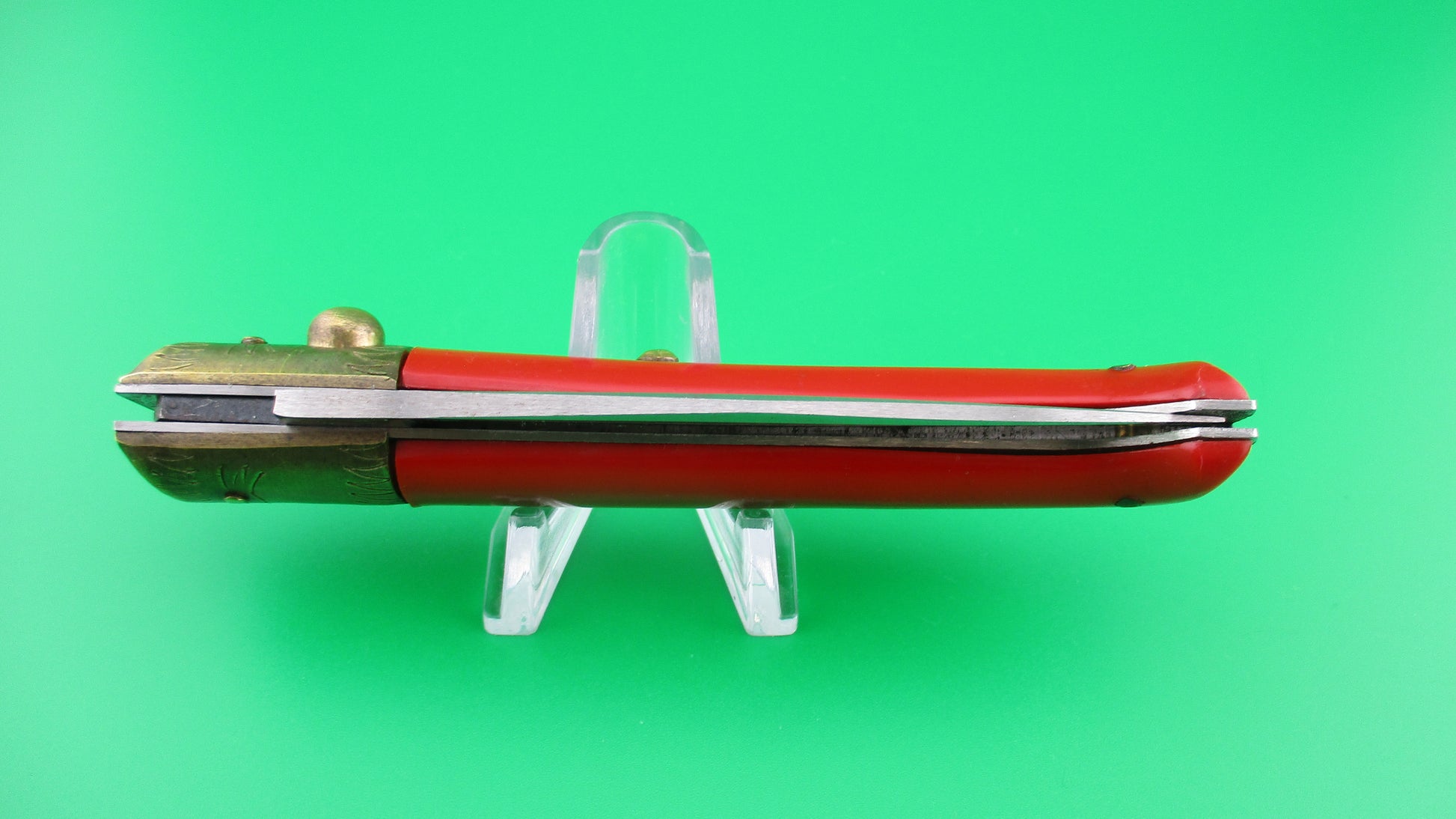 Nice vintage Jndiana Italian PATTADA bird's head horn automatic knife made in Sardinia Italy. Not sure on the age of this one, but I know that these were made back in the 1970s/80s for Jndiana Co in Maniago. This knife measures 21cm (8.25 inches) open with steel liners and brass bolsters, button and safety cap. The blade is full and has original finish and is marked with the triangle Jndiana stamp, though light and hard to make out and PATENT on the rear. The Red plastic scales are in great condition with a slight amount of shrinkabe. It's a BoBc (button open, button close). The knife works great with blade tip seating good, strong snap and tight lockup! Safety works. EX+ condition.