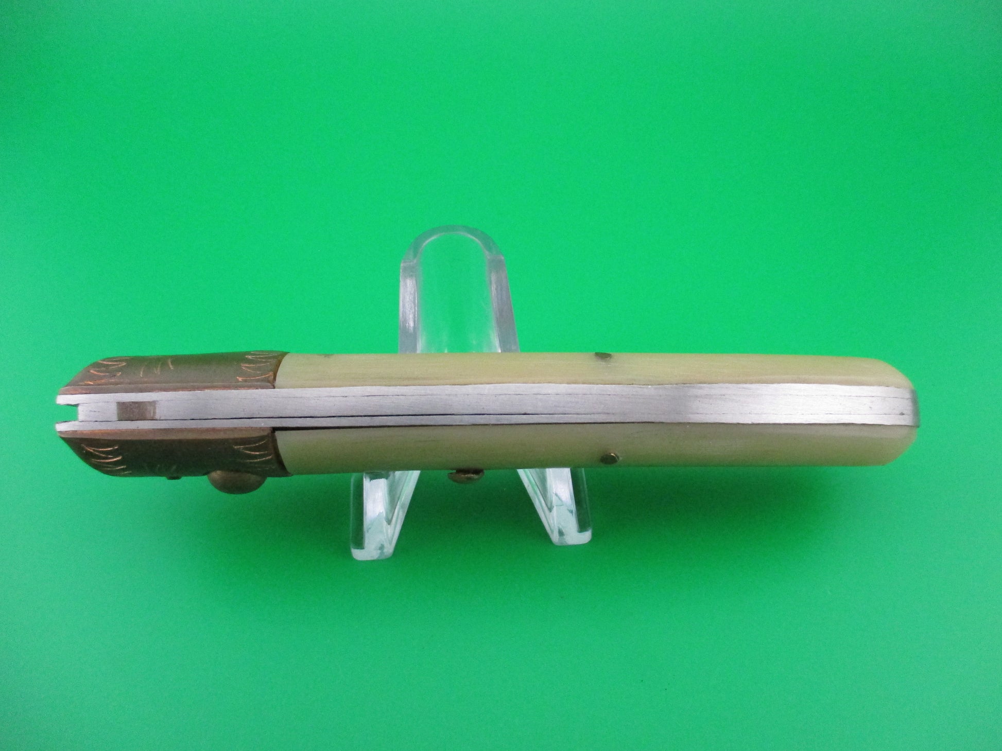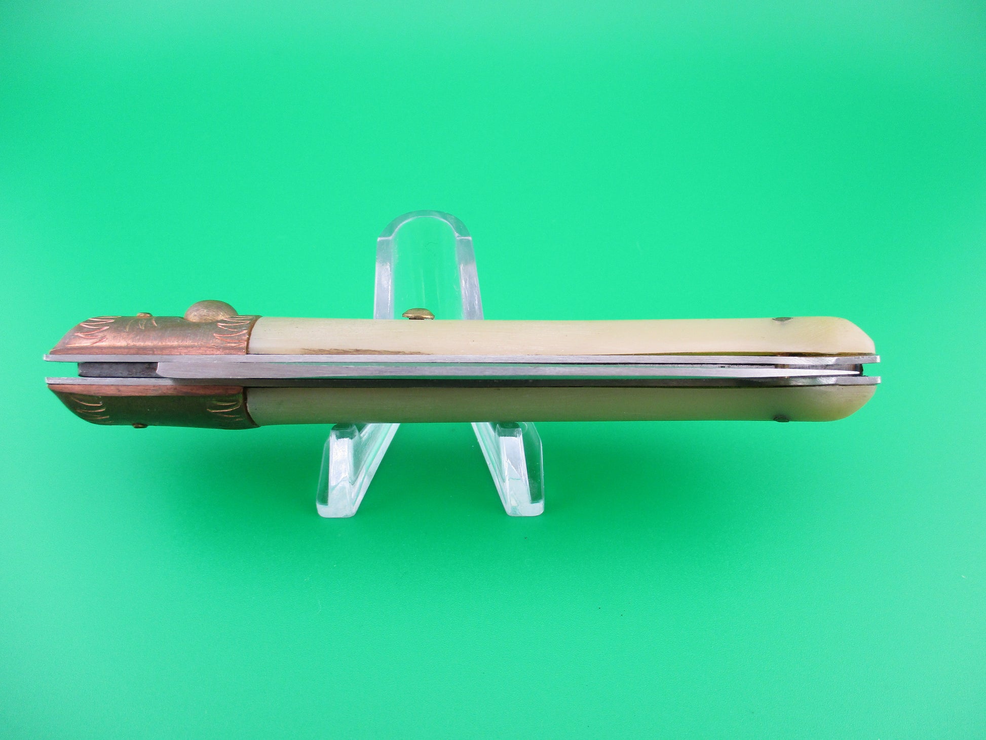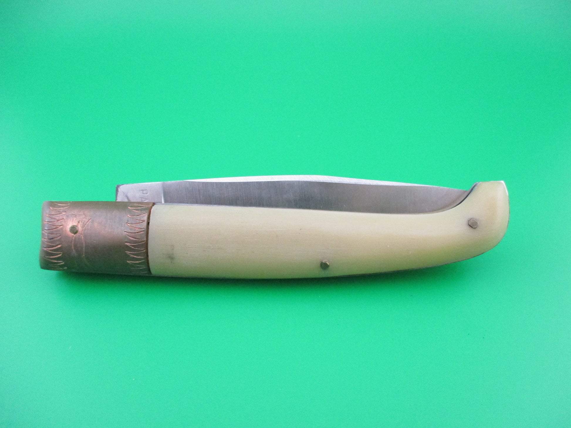 Nice vintage Italian PATTADA bird's head horn automatic knife made in Sardinia Italy. Not sure on the age of this one, but I know that these were made back in the 1970s/80s for Jndiana Co in Maniago. This knife measures 21cm (8.25 inches) open with steel liners and copper bolsters, brass button and safety cap. The blade is full and has original finish and is marked with the triangle Jndiana stamp, though light and hard to make out and PATENT on the rear. The light horn scales are in perfect condition. It's a BoBc (button open, button close). The knife works great with blade tip seating good, strong snap and tight lockup! Safety works. EX+ condition.