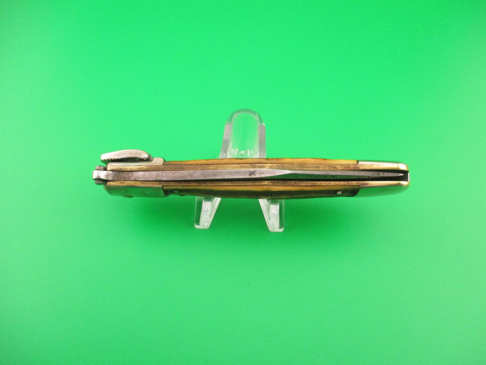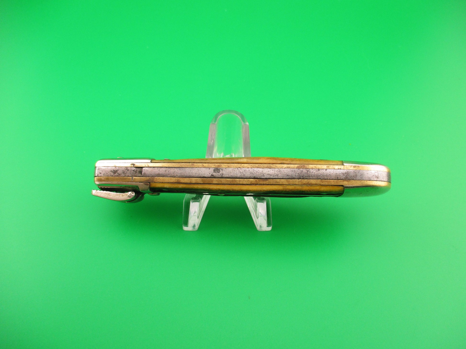 Vintage Ka-bar lever knife with stag handles made by the Union Cutlery Co of Olean, NY most likely in 1940s and was designated the model 21105. The knife measures 4.5 inches closed and 8 1/16 inches open and has thick brass liners with nickel silver bolsters, lever & pins. The blade is 98% full or better with nice even patina, light scratches & a little light spotting and the tang is stamped KA-BAR REG US PATENT OFF on the front and backside is blank. The stag scales are in nice condition with no cracks or chips. The knife works great with the blade tip seating deep & centered closed, fast, full open and fair lockup with approx 1/16" movement at the tip. Does rattle if shaken with blade open. This mid-late production knife has grooves in the lever for better control. VG+ condition.